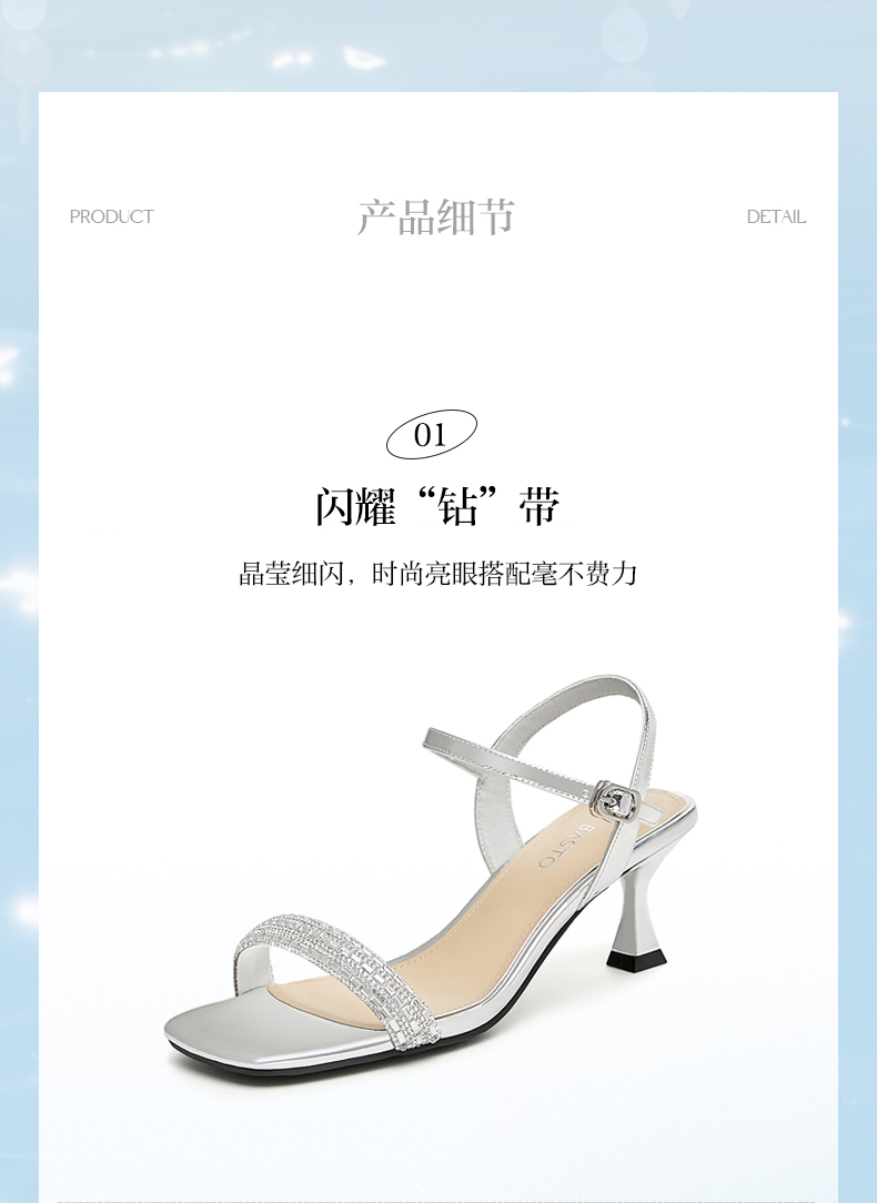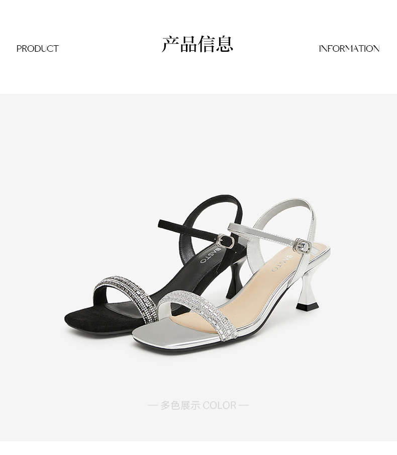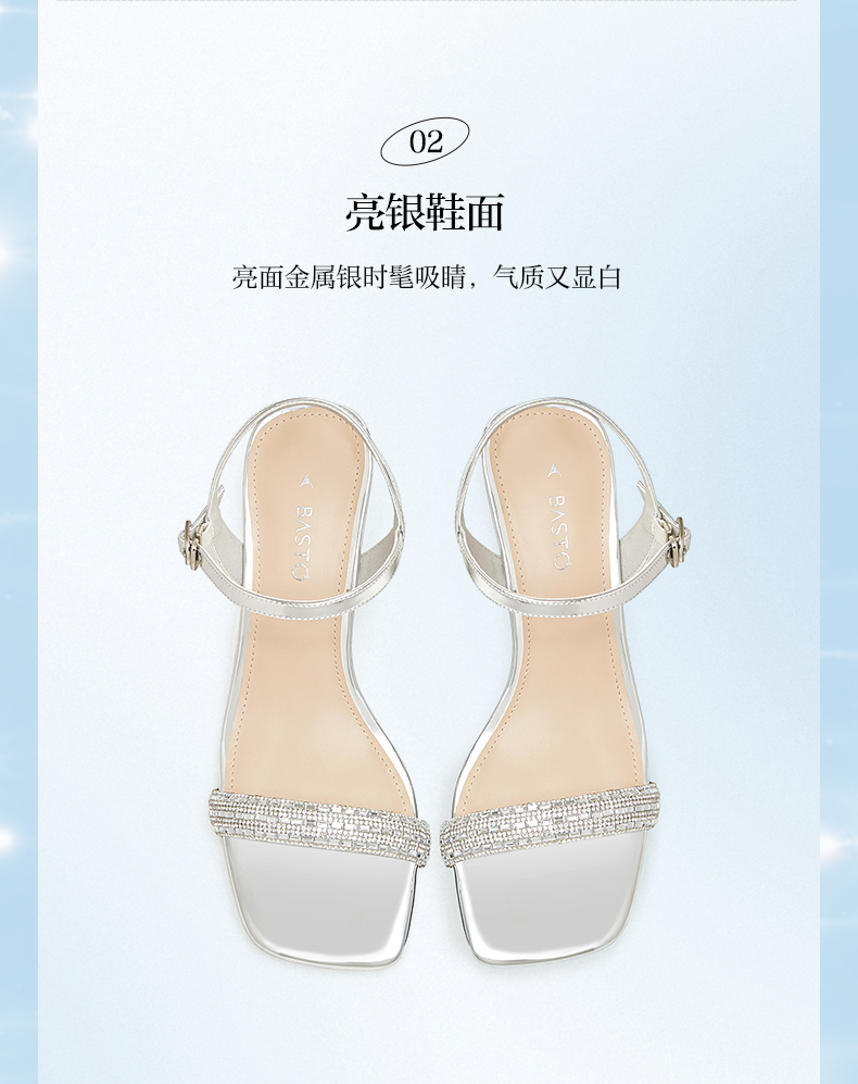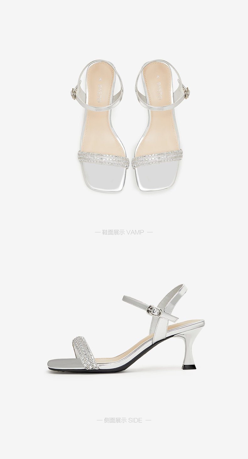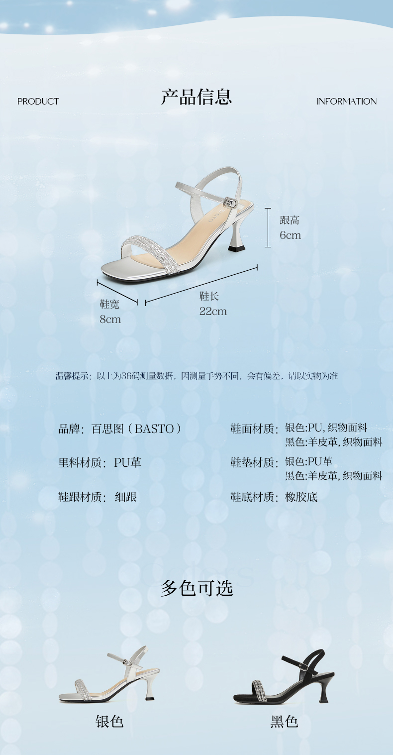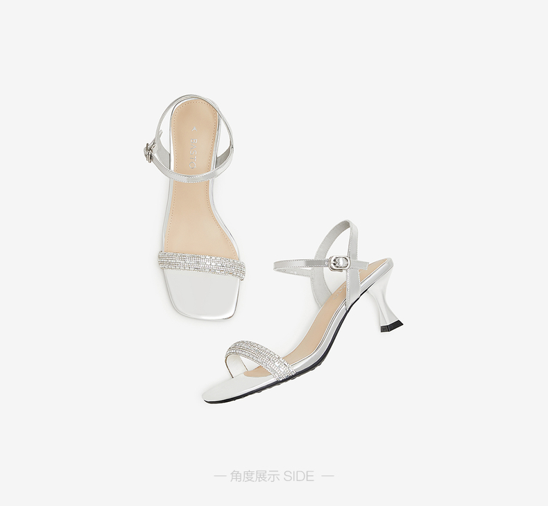 百思图夏新款气质闪钻一字带细跟高跟凉鞋女时装凉鞋TT208BL4
