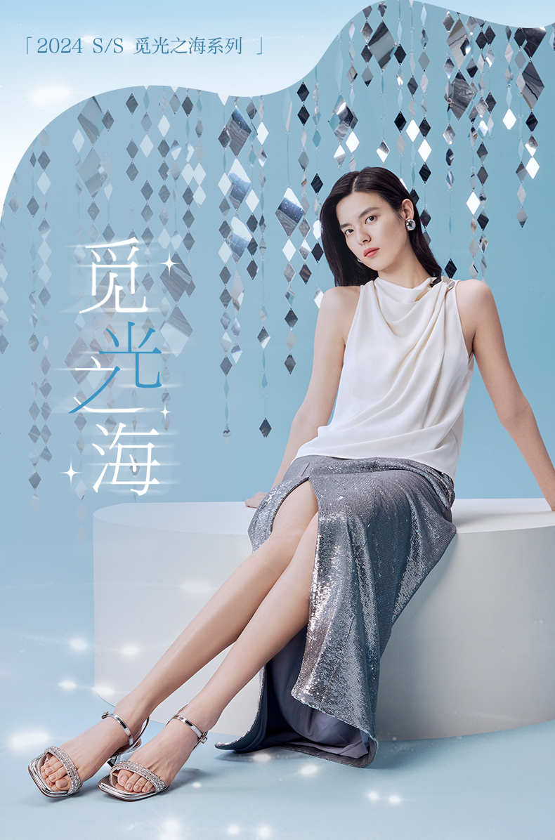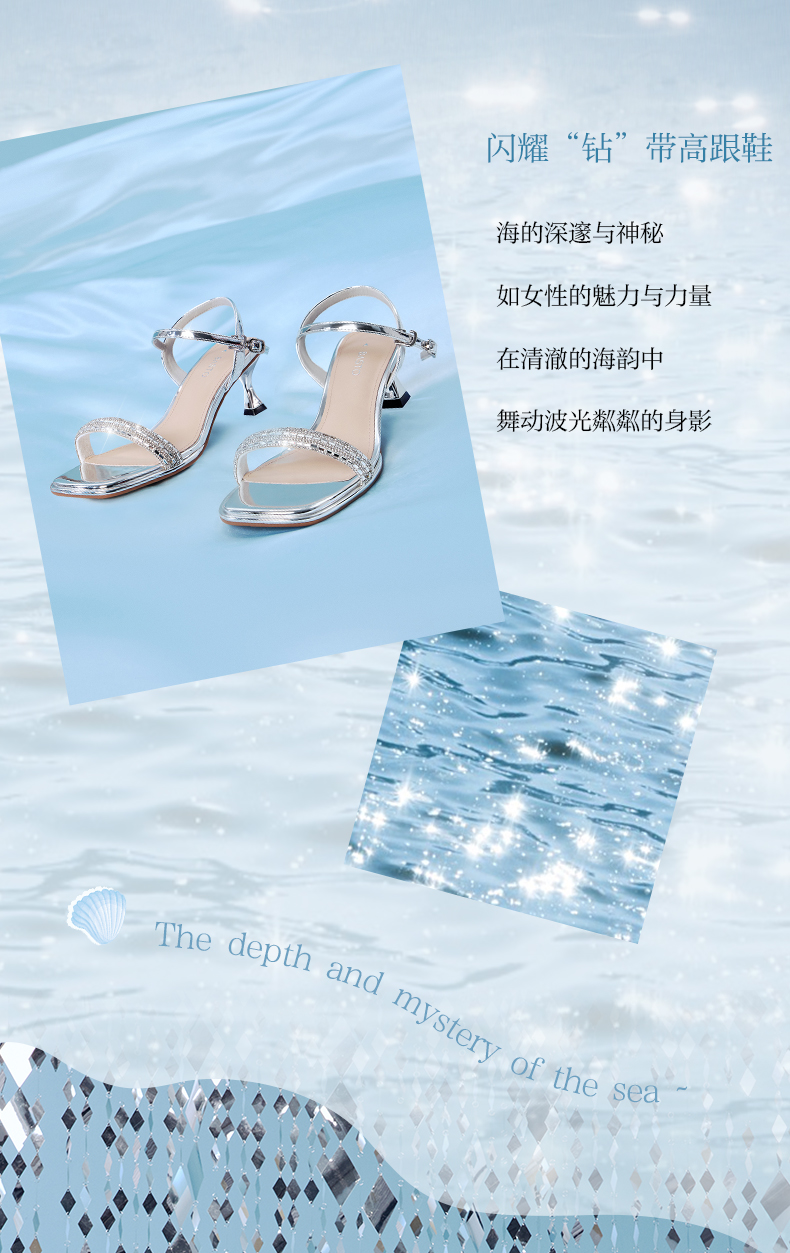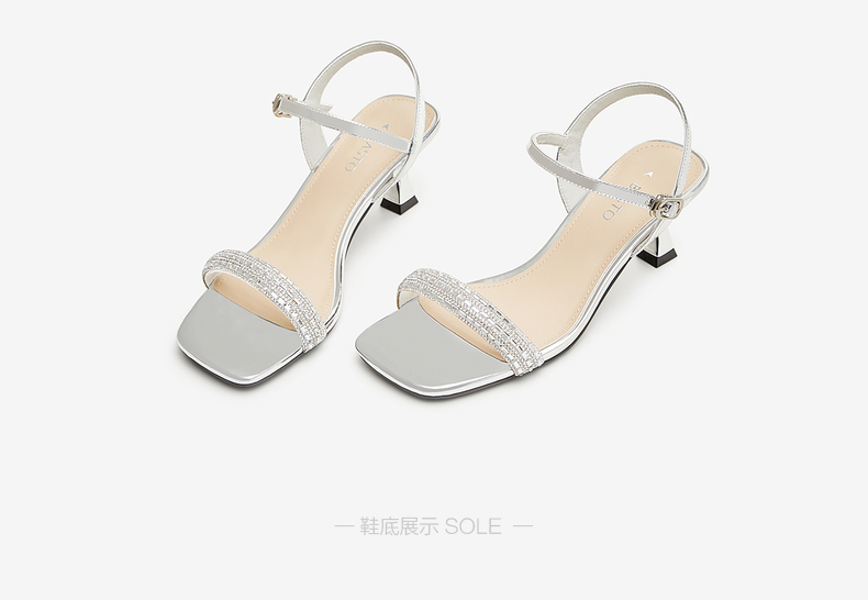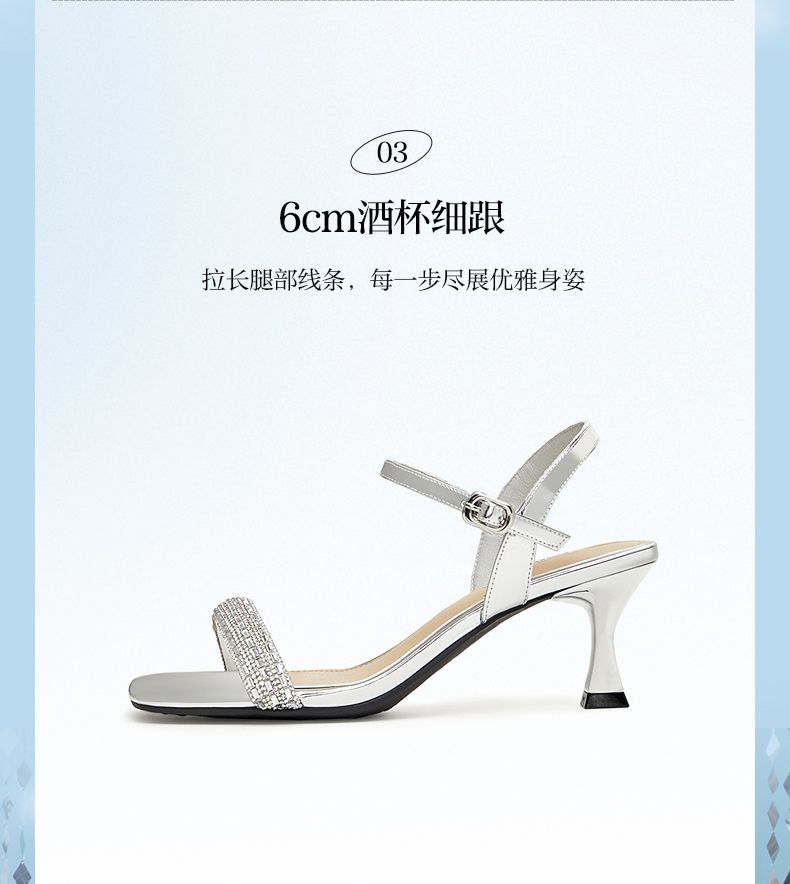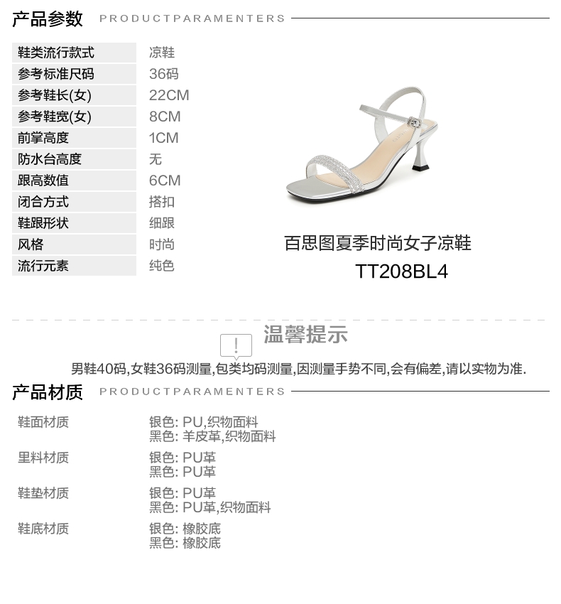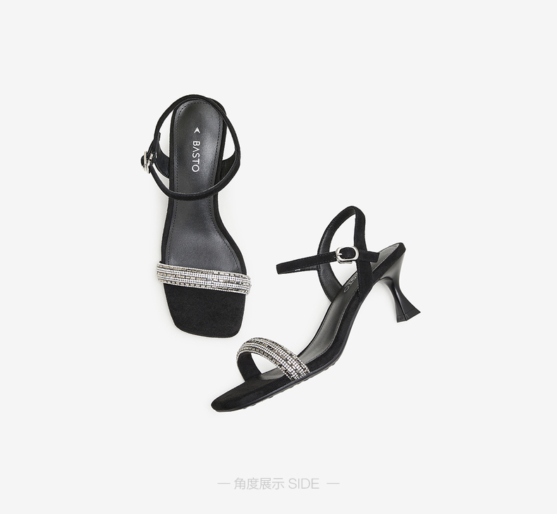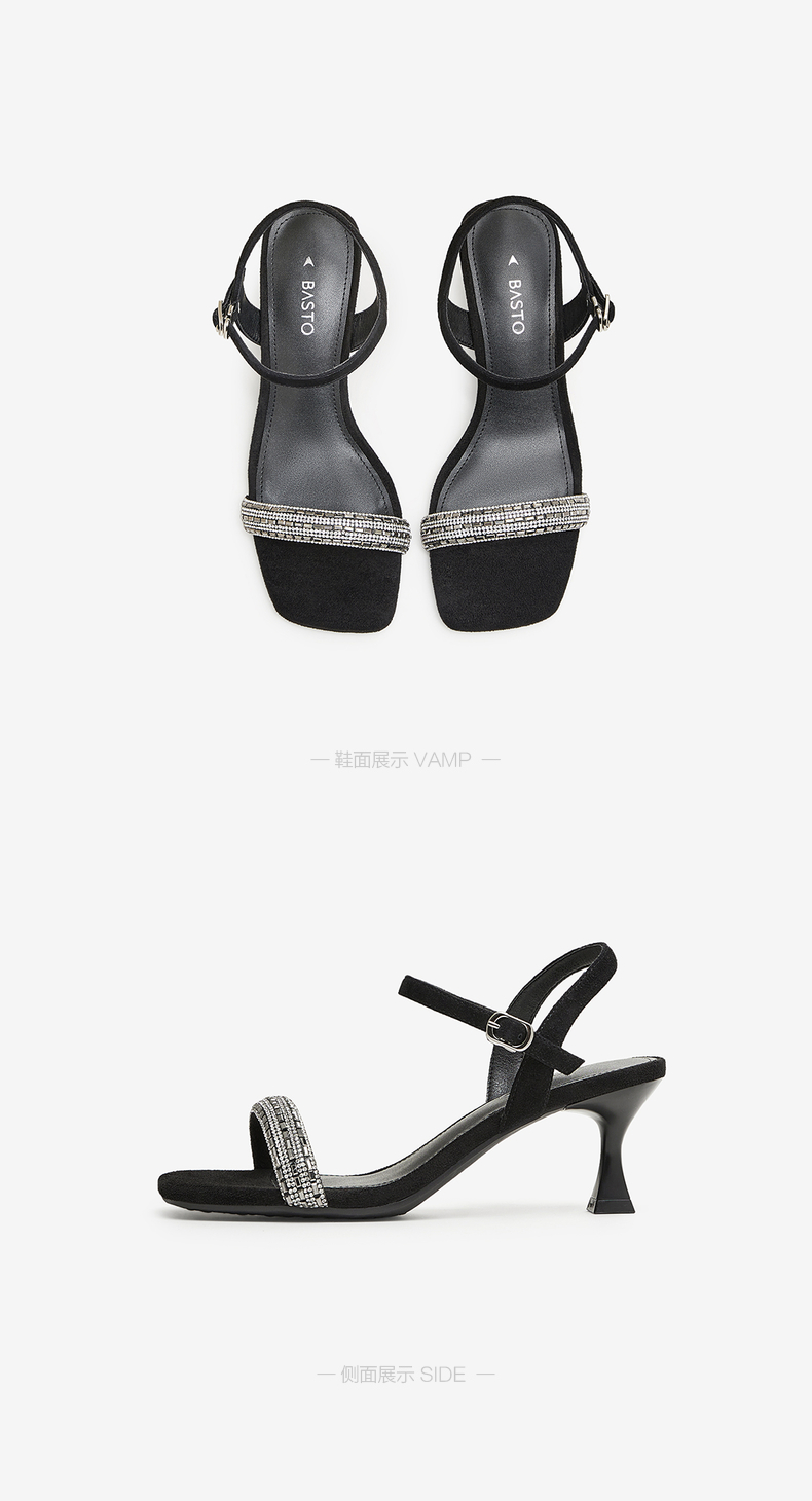 百思图夏新款气质闪钻一字带细跟高跟凉鞋女时装凉鞋TT208BL4