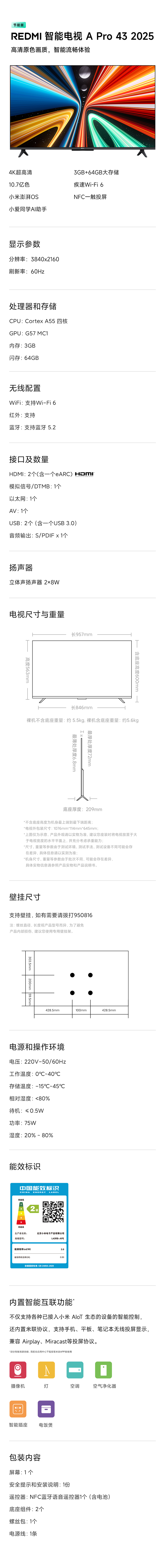 小米REDMI A Pro43英寸高清大存储平板电视机2025以旧换新补贴