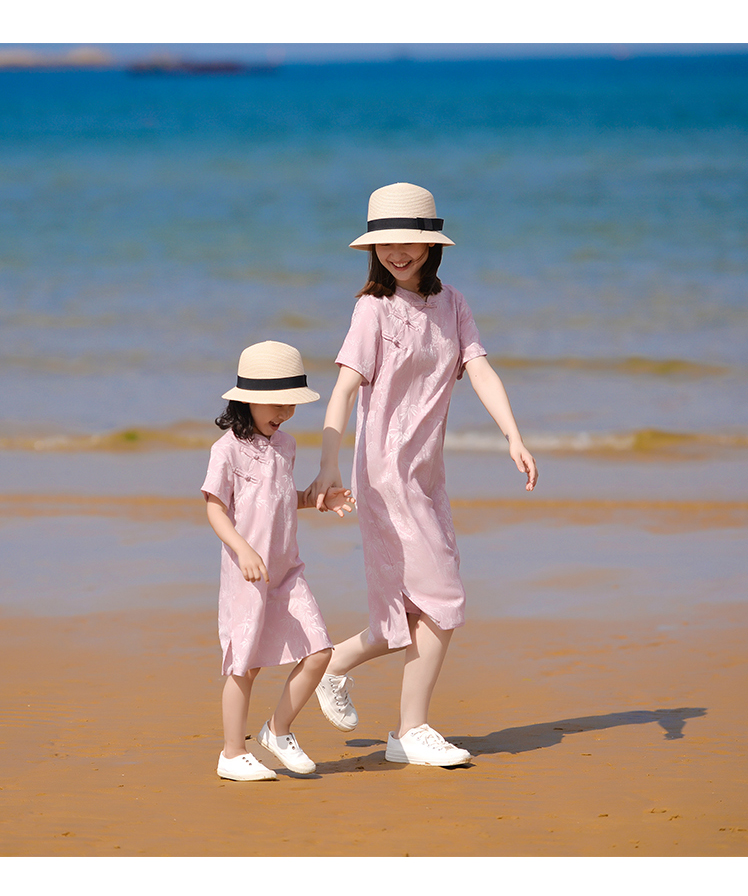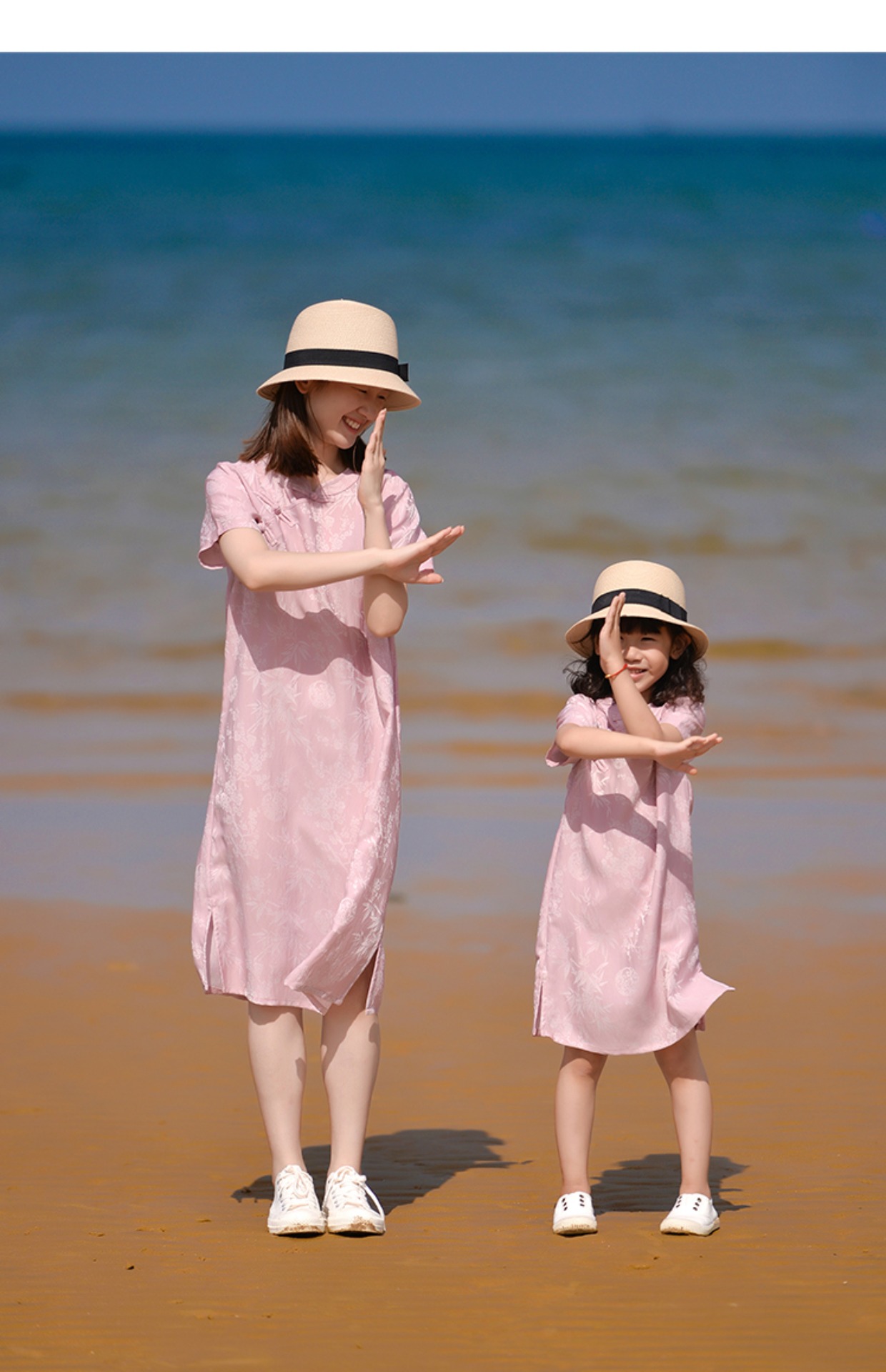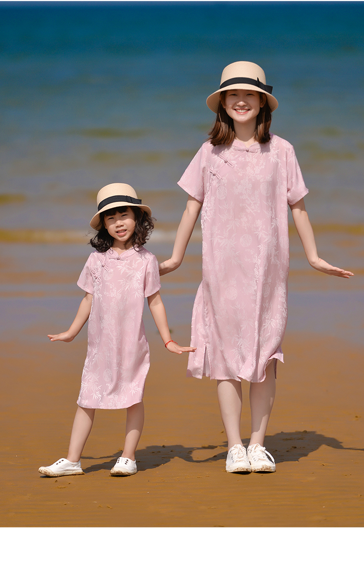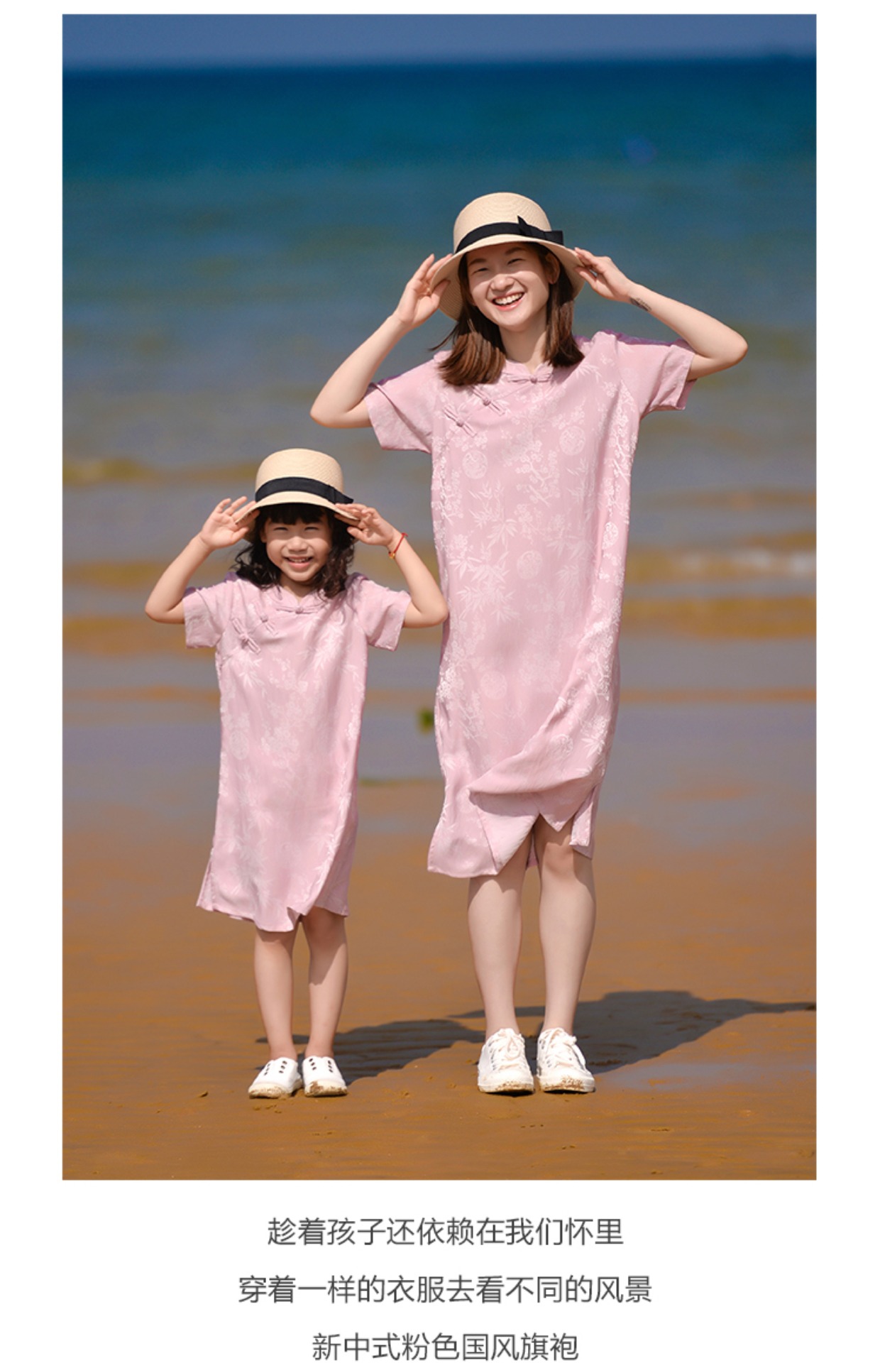 小乐往亲子装128课 夏女童中式改良粉色旗袍母女装清新文艺连衣裙