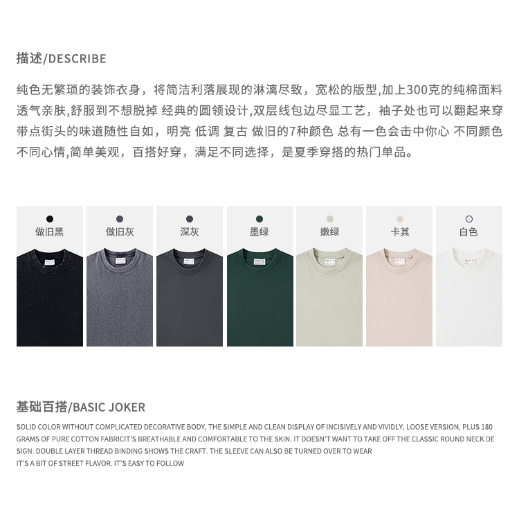 悟空有货夏季300G重磅纯色短袖T恤男女潮牌宽松基础打底纯棉体恤