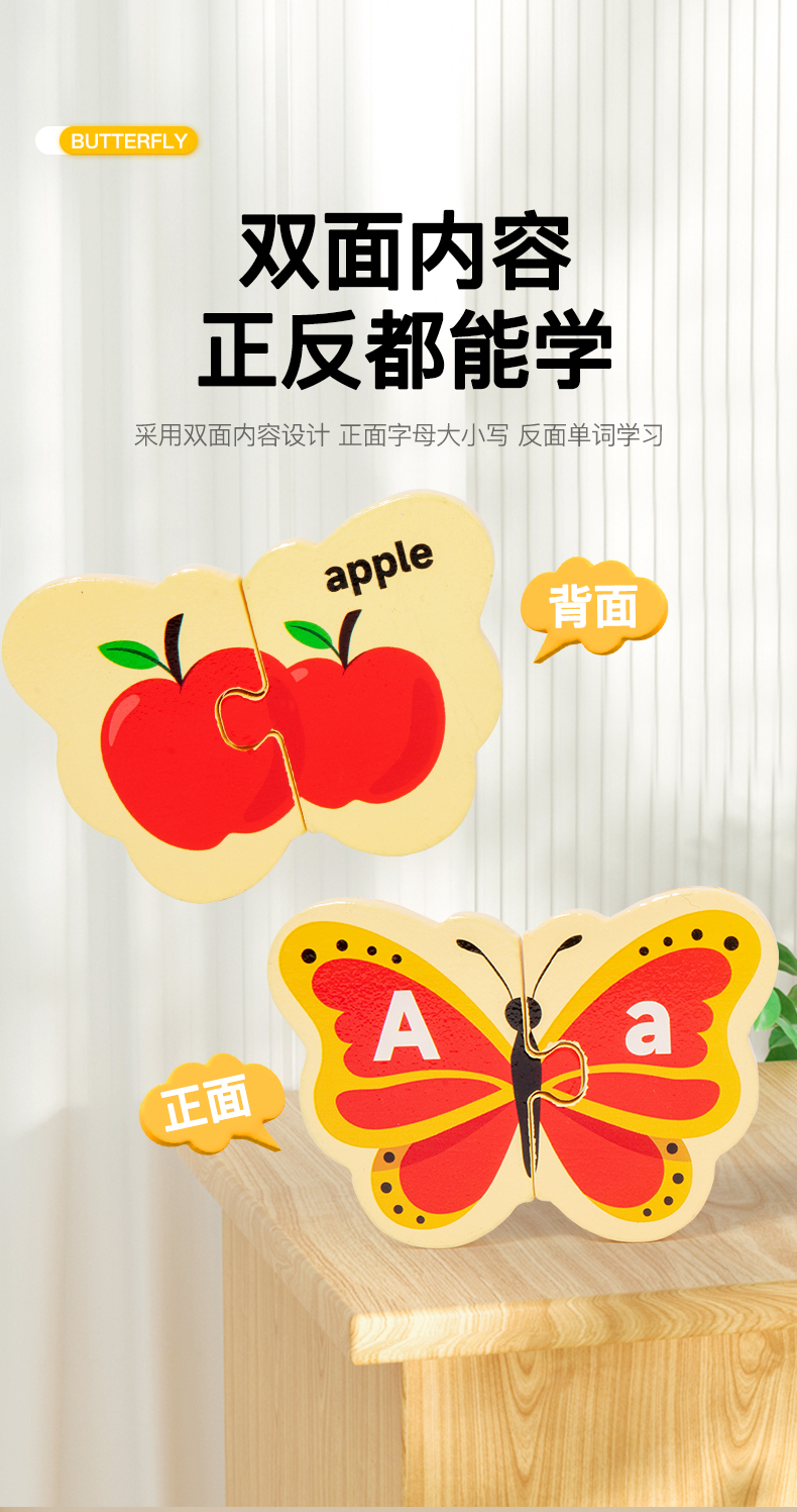 儿童木质蝴蝶字母拼图早教益智玩具宝宝认知形状配对积木拼板玩具