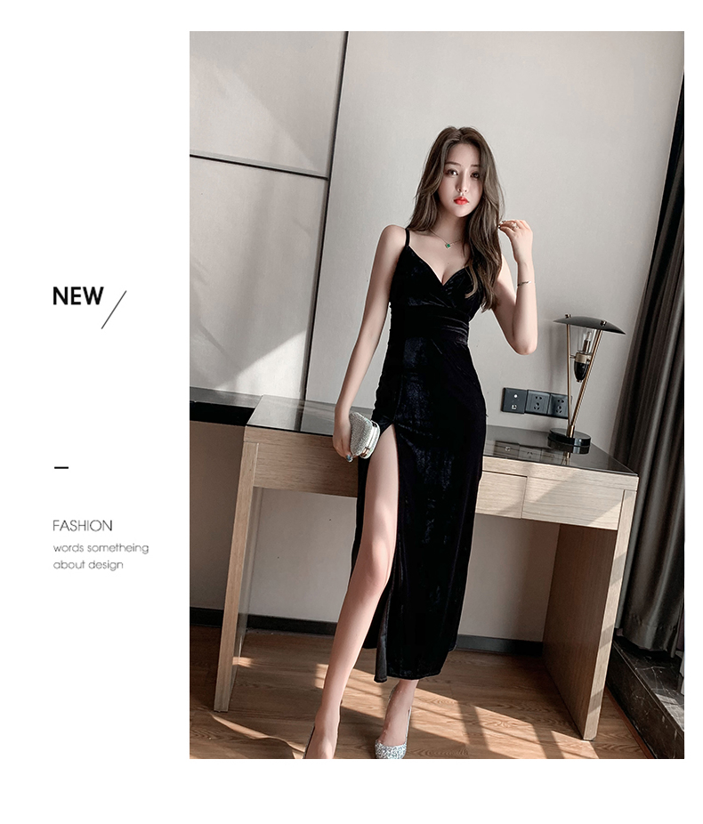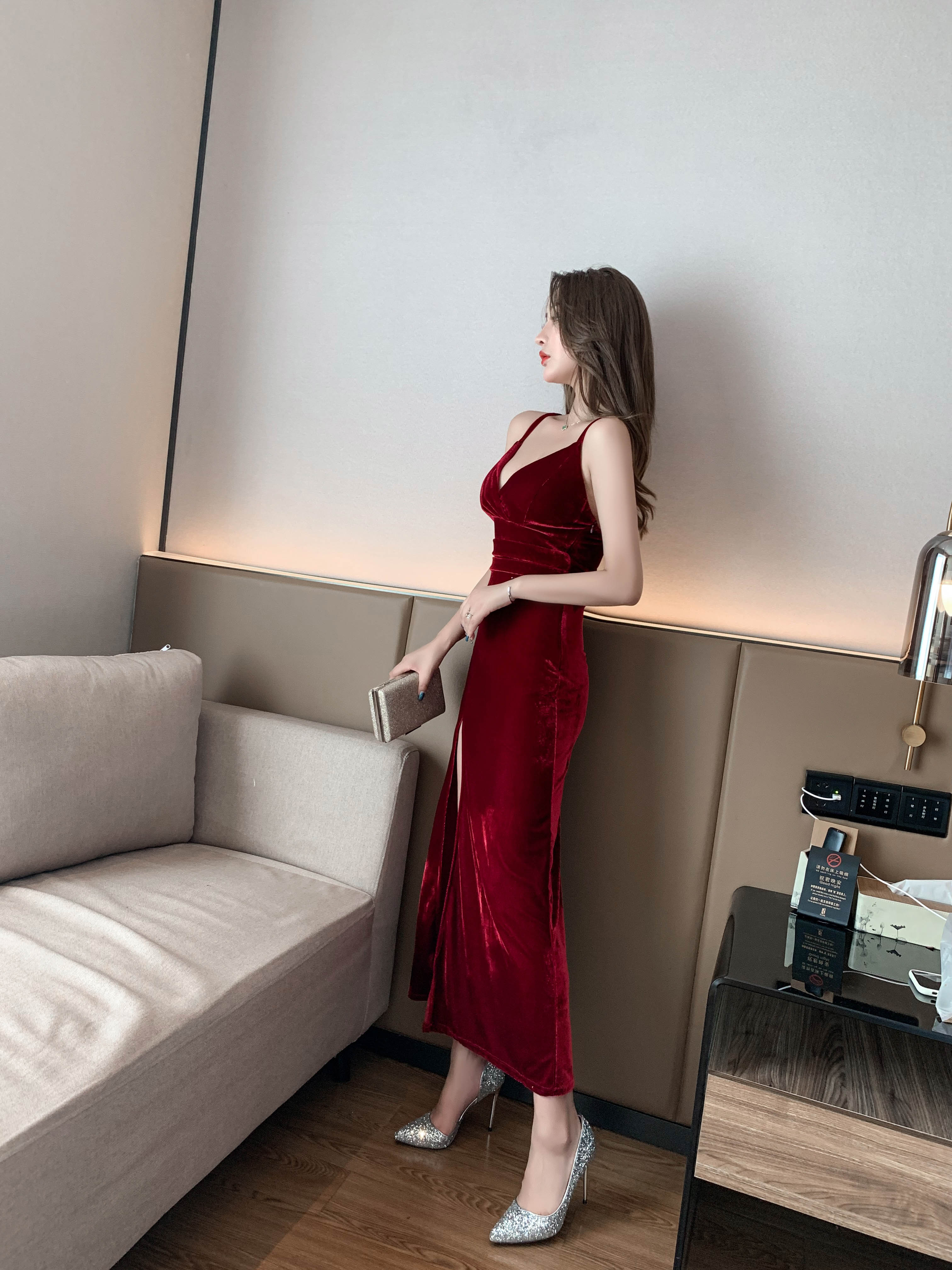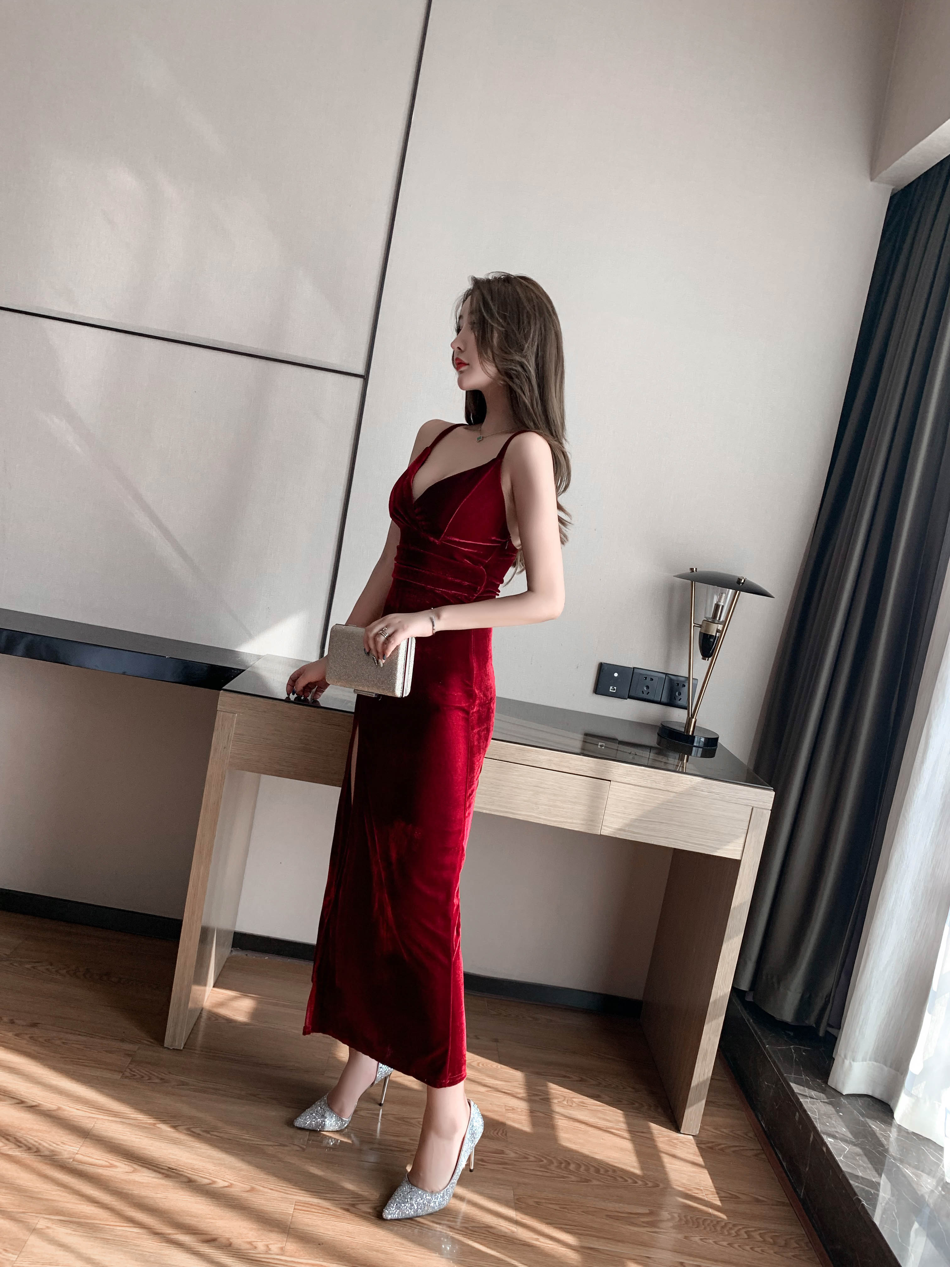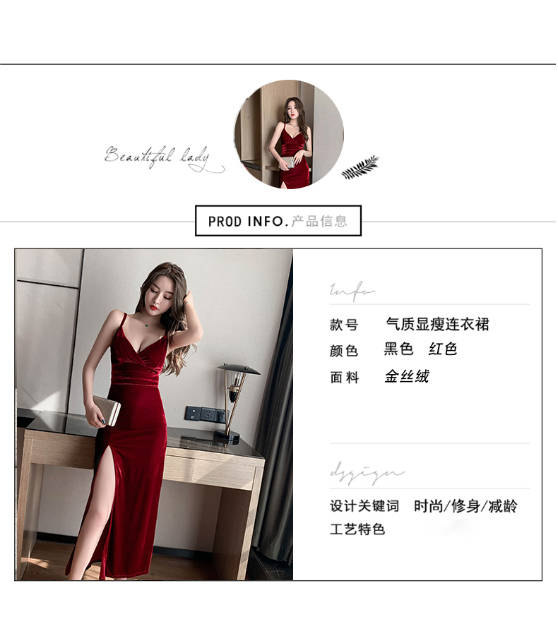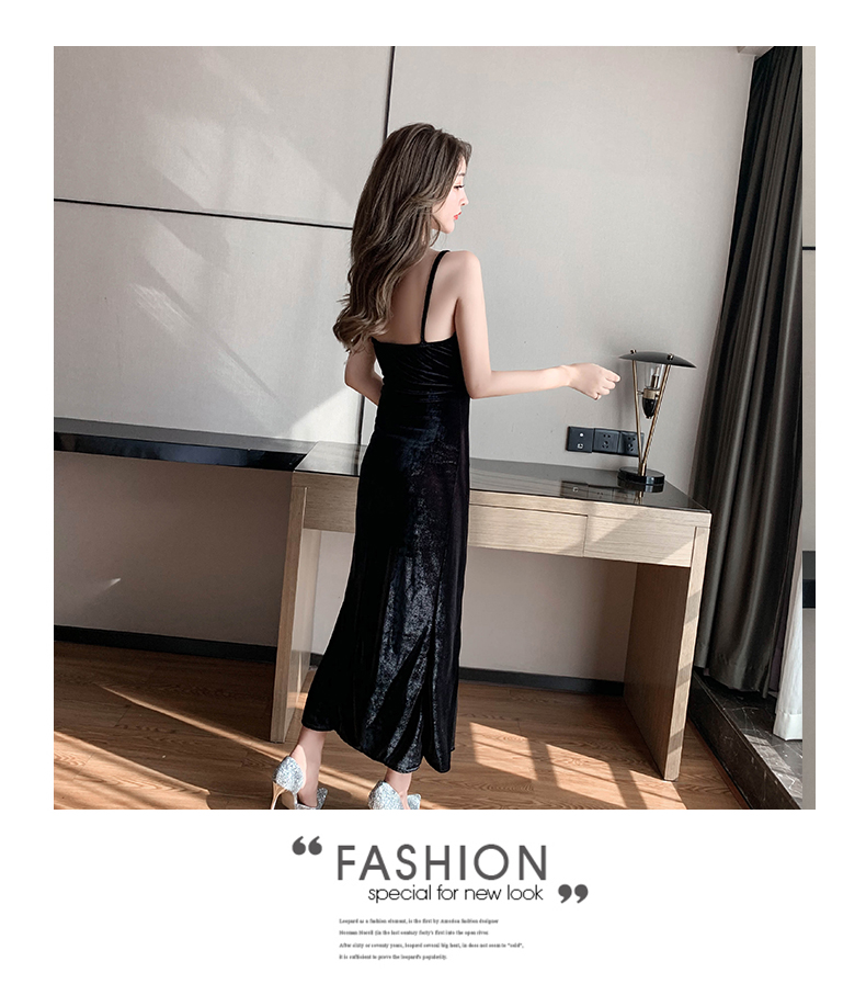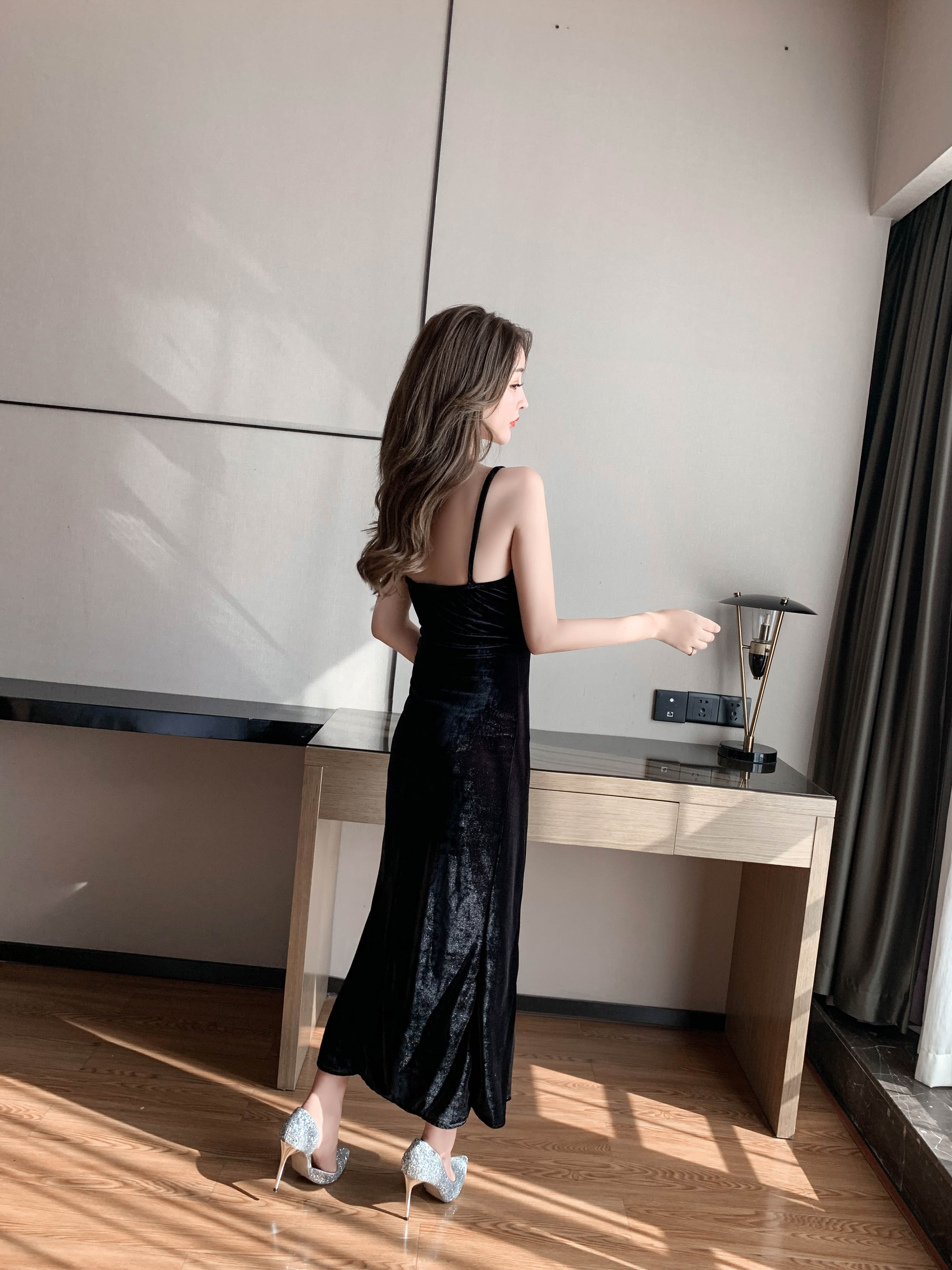 秋冬季新款吊带连衣裙女内搭长裙侧开叉金丝绒低胸V领晚礼服长裙