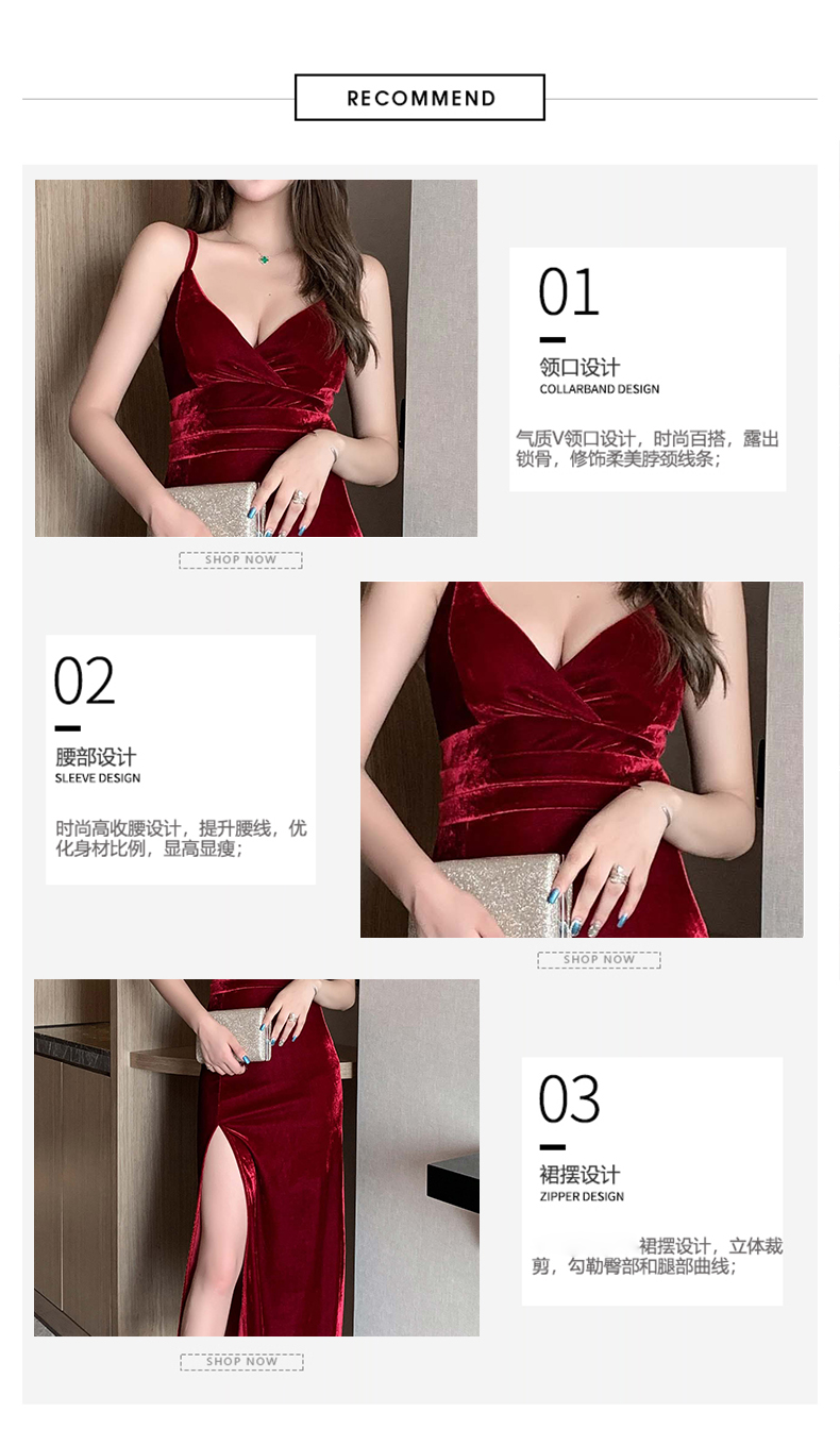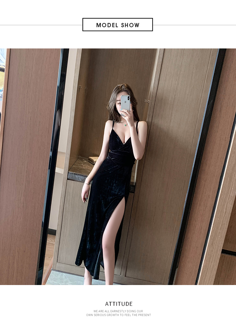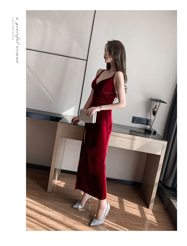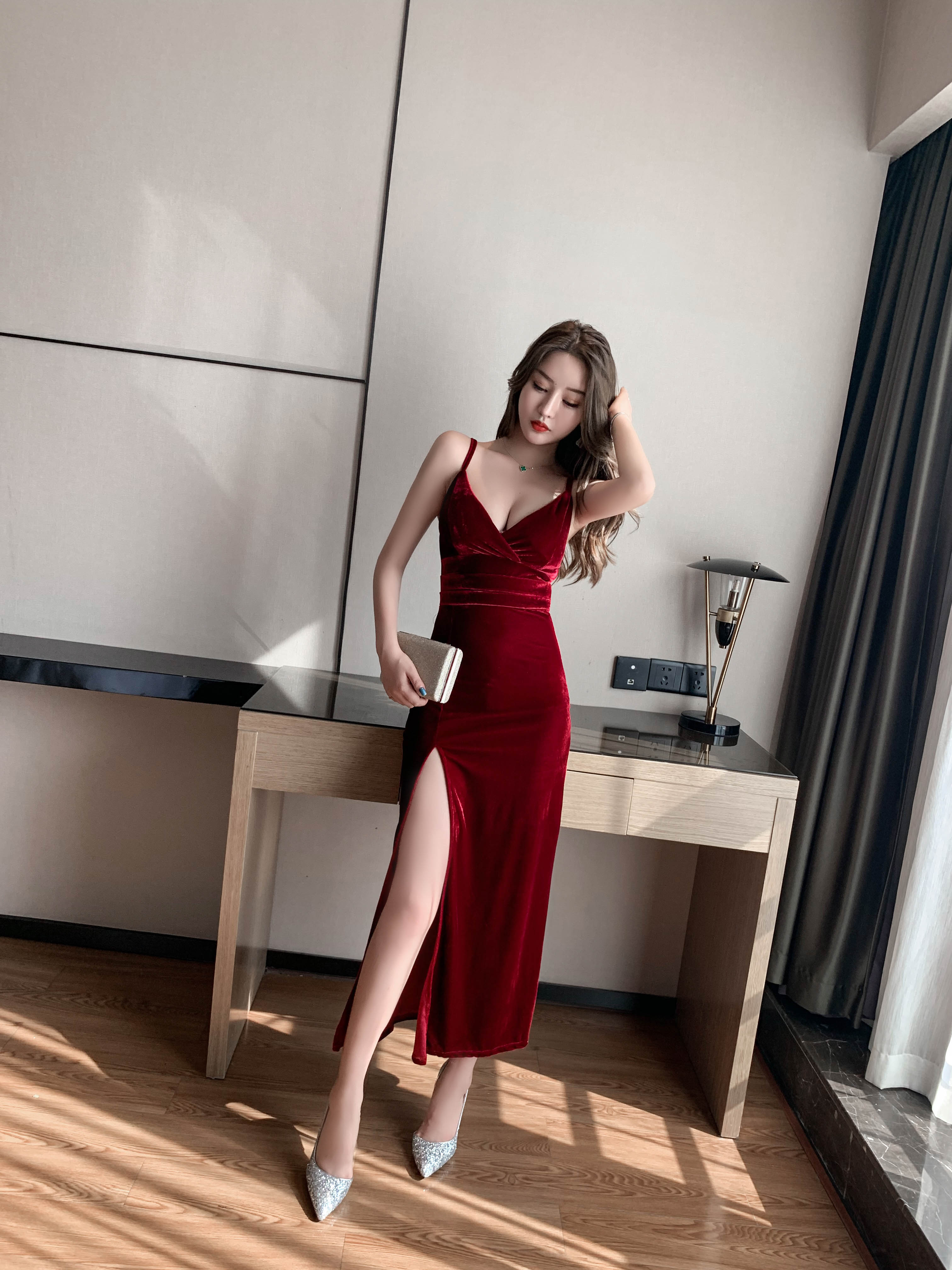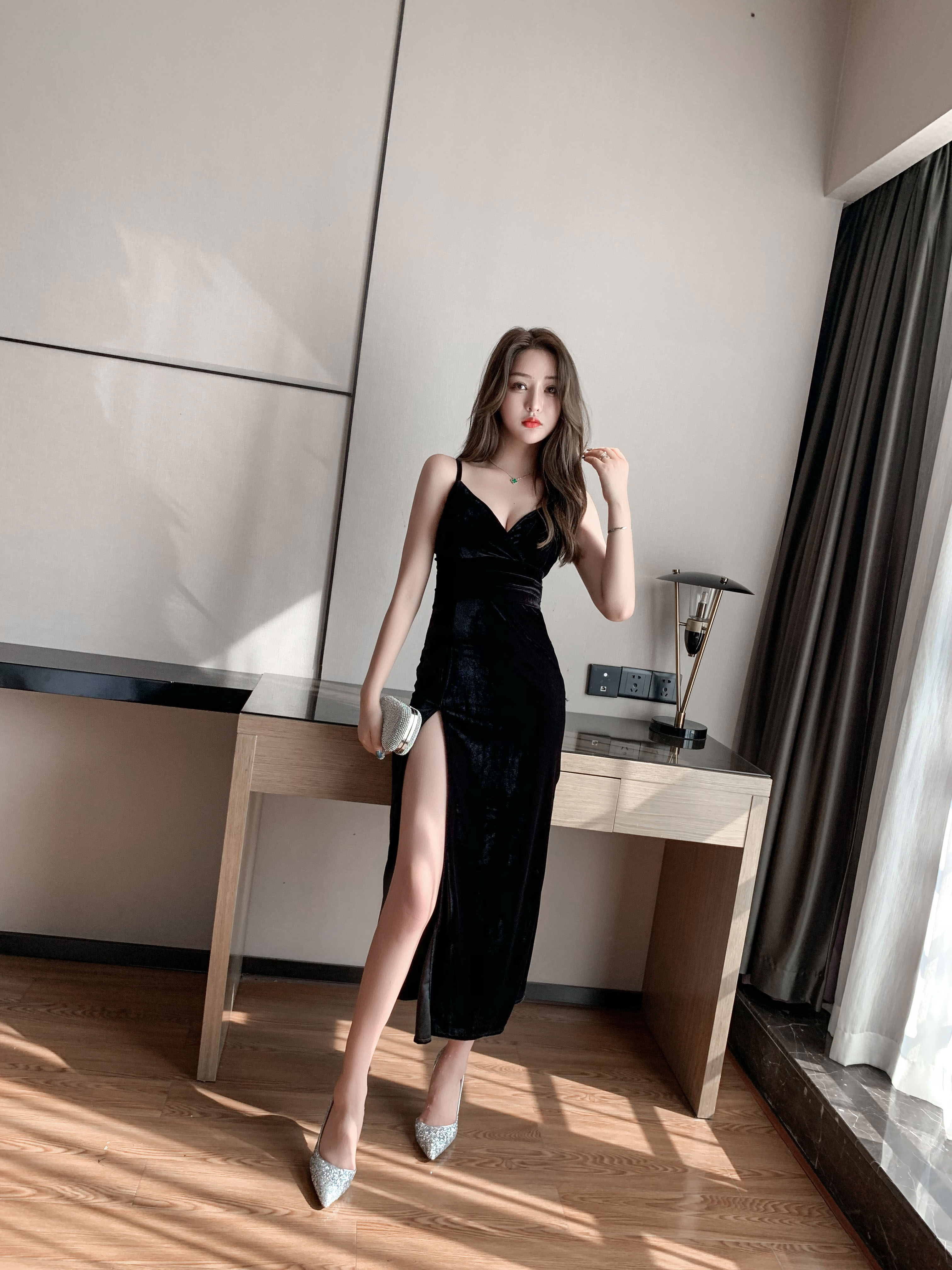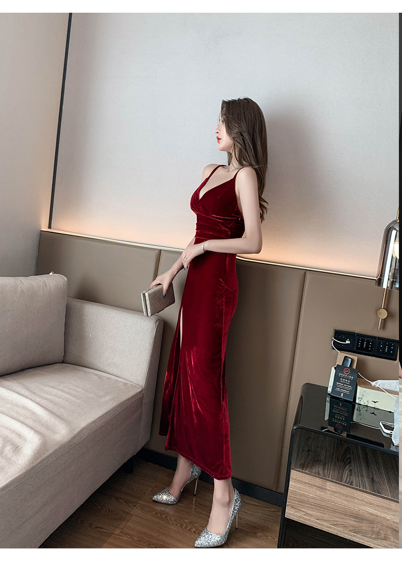 秋冬季新款吊带连衣裙女内搭长裙侧开叉金丝绒低胸V领晚礼服长裙