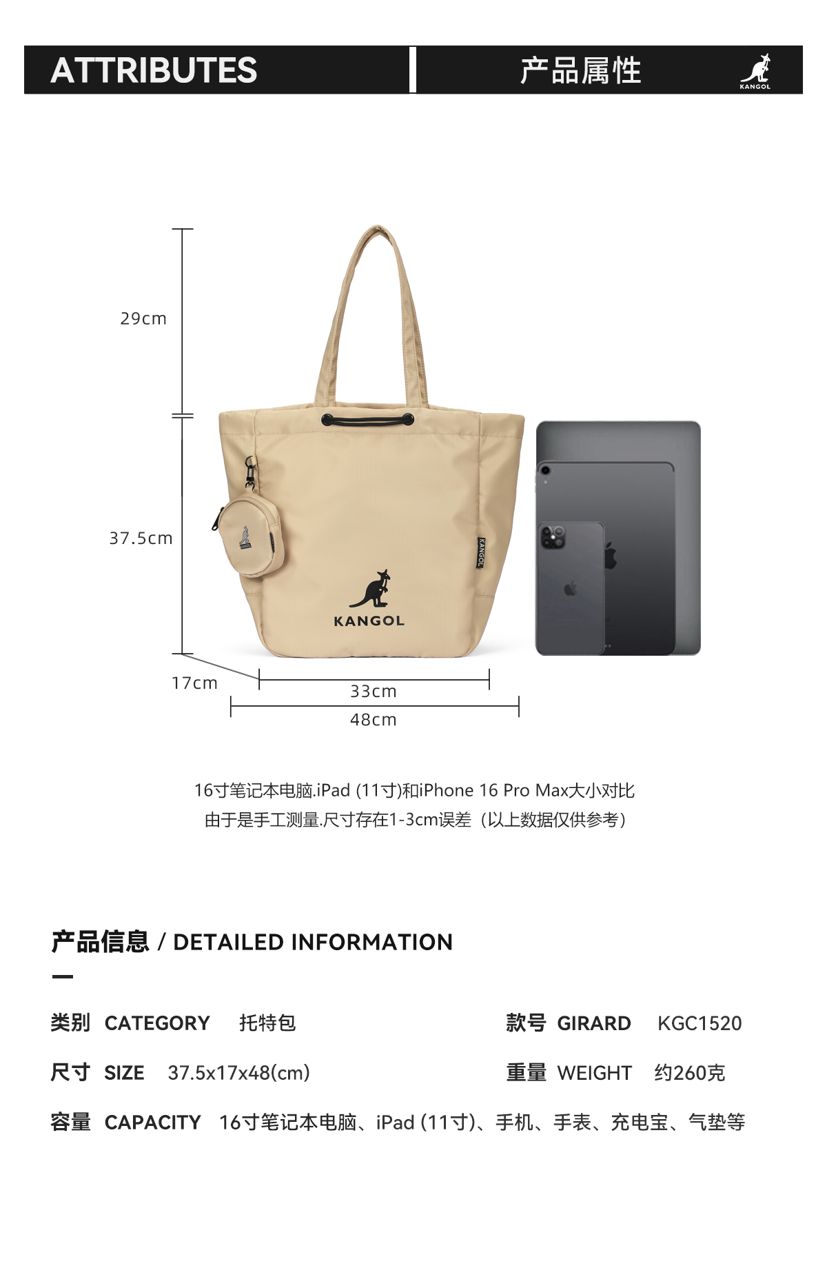 KANGOL官方正品新款潮牌抽绳大容量防水健身包单肩手提托特包男女