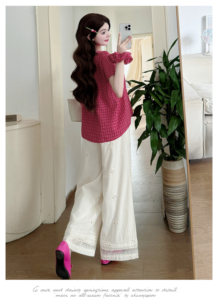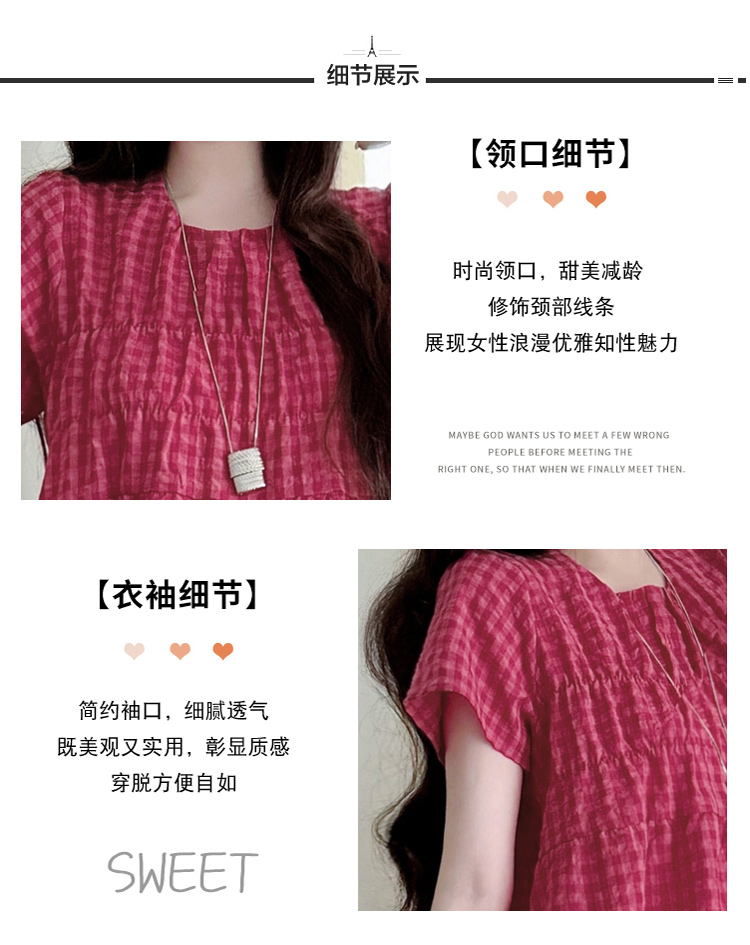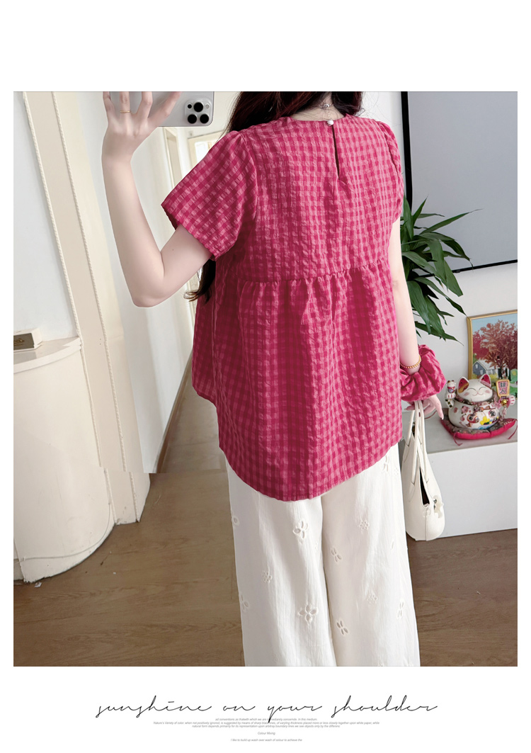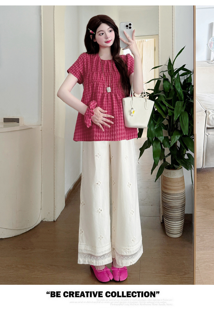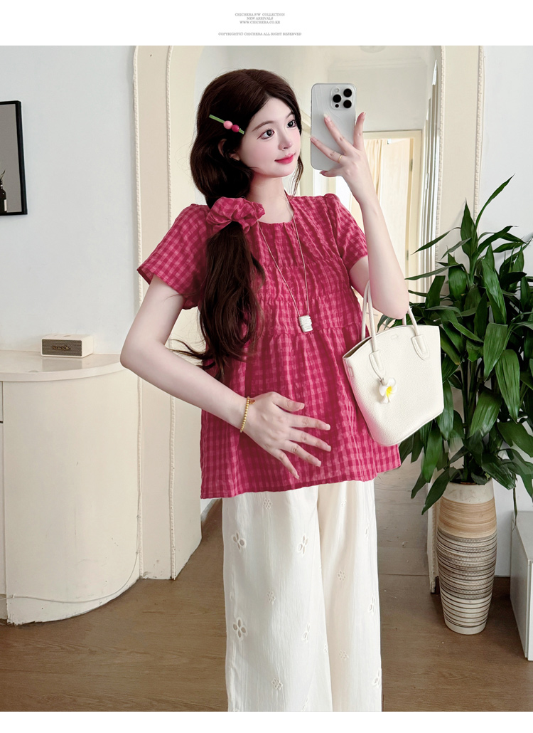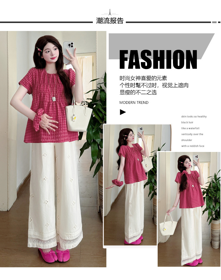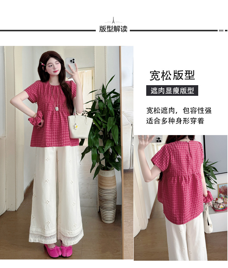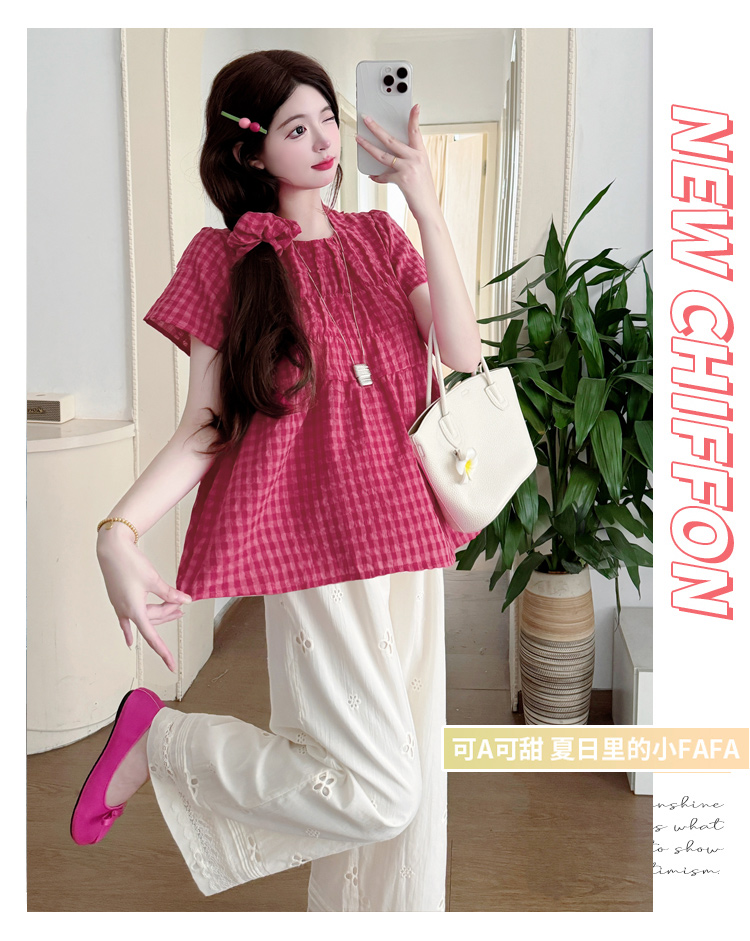 2025孕妇夏装大码宽松显瘦遮肚格子娃娃衫上衣+无托腹阔腿裤套装