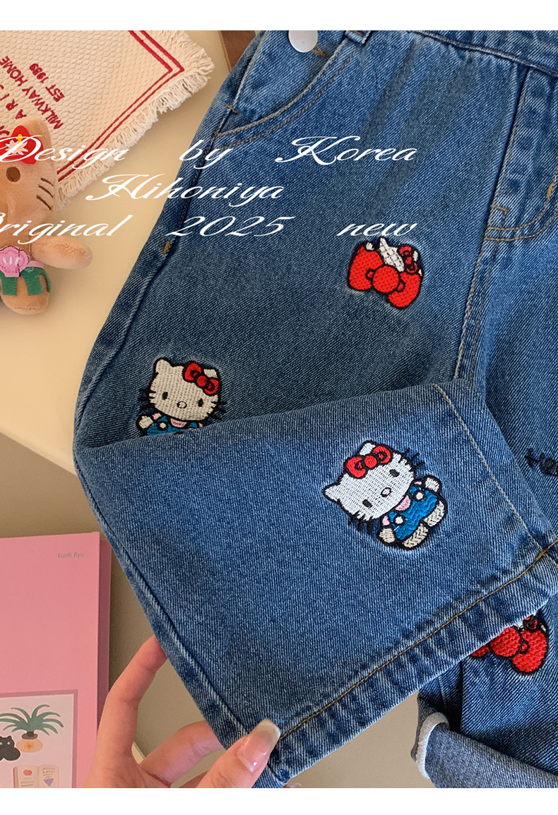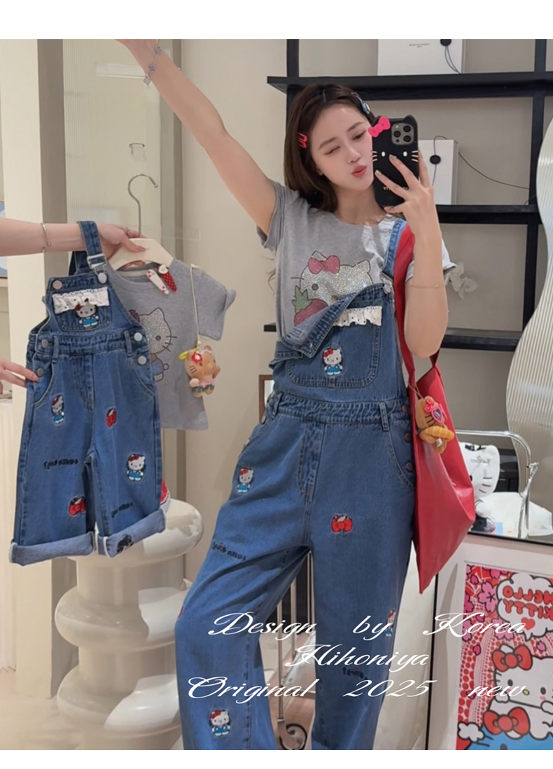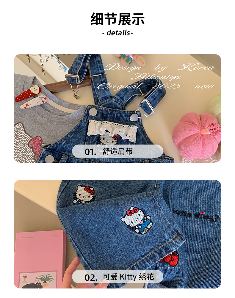 Spring韩国童装2025春夏新款亲子刺绣Kitty韩版背带裤女童休闲裤