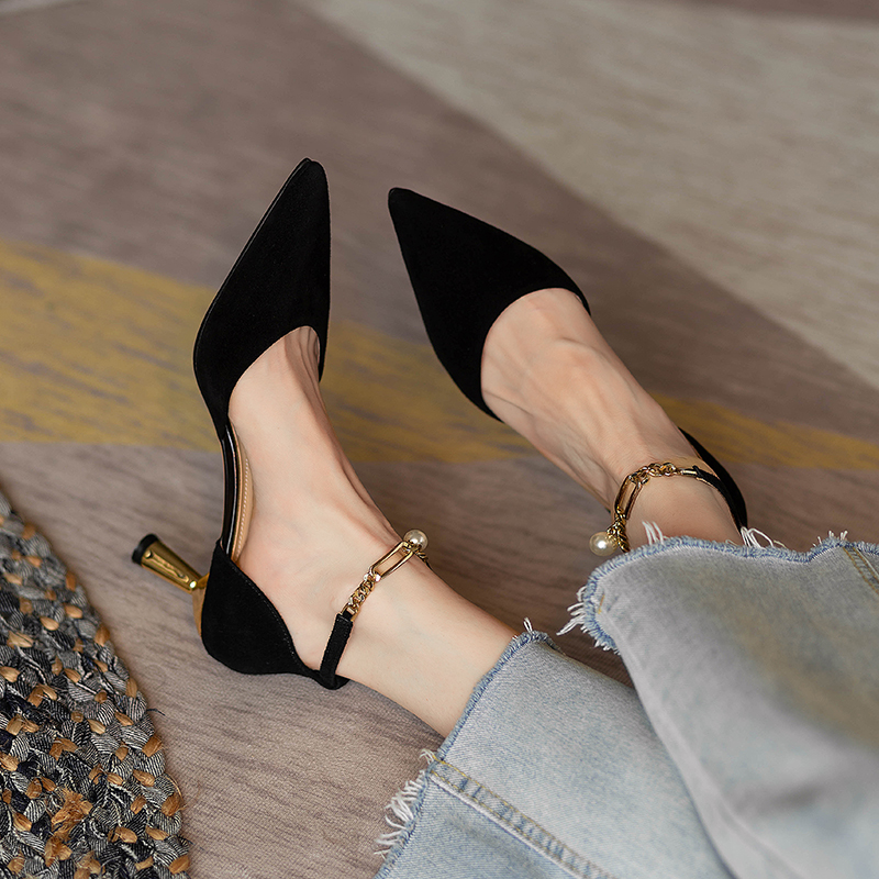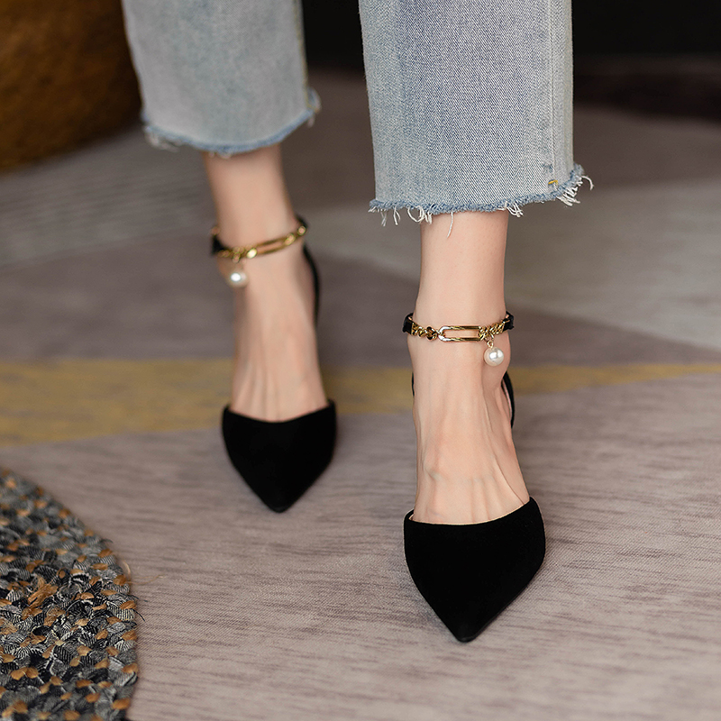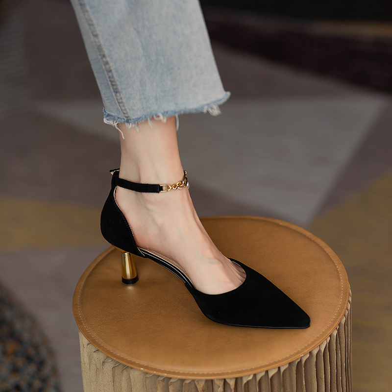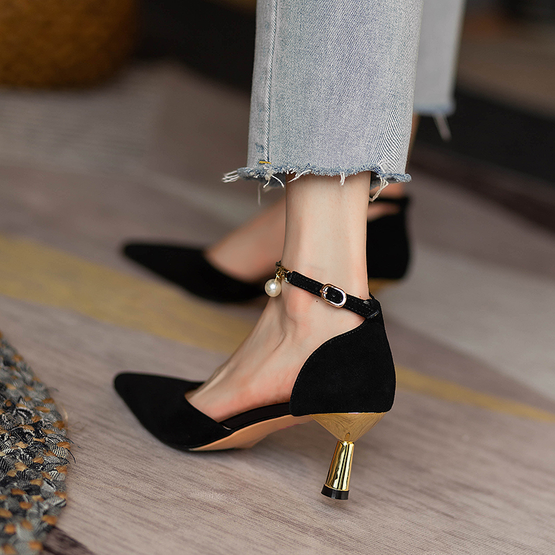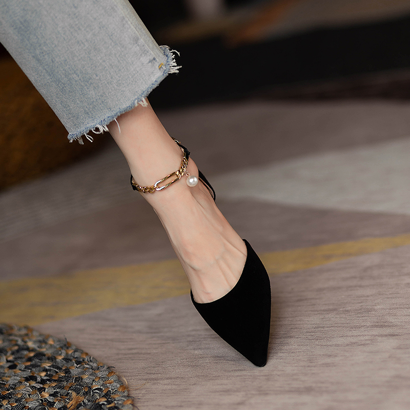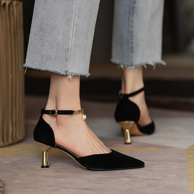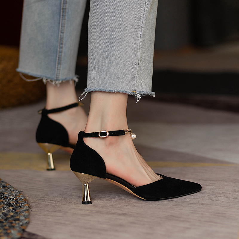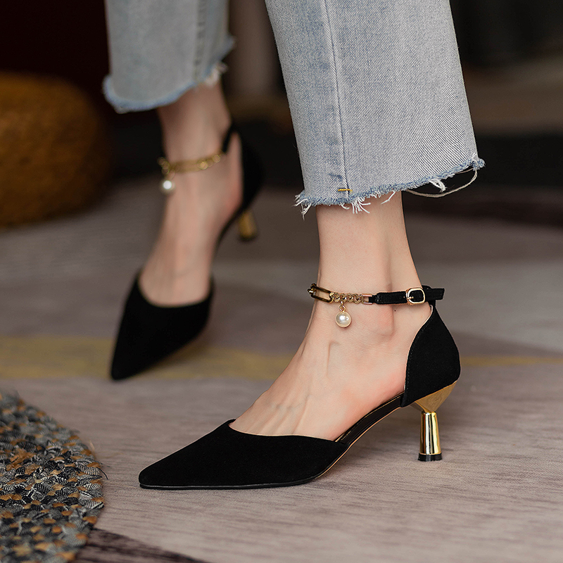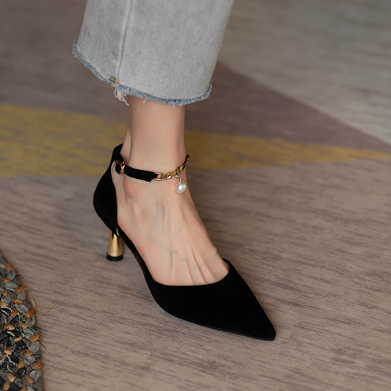 2025年包头凉鞋女夏黑色高跟鞋尖头细跟一字扣带小众气质法式单鞋