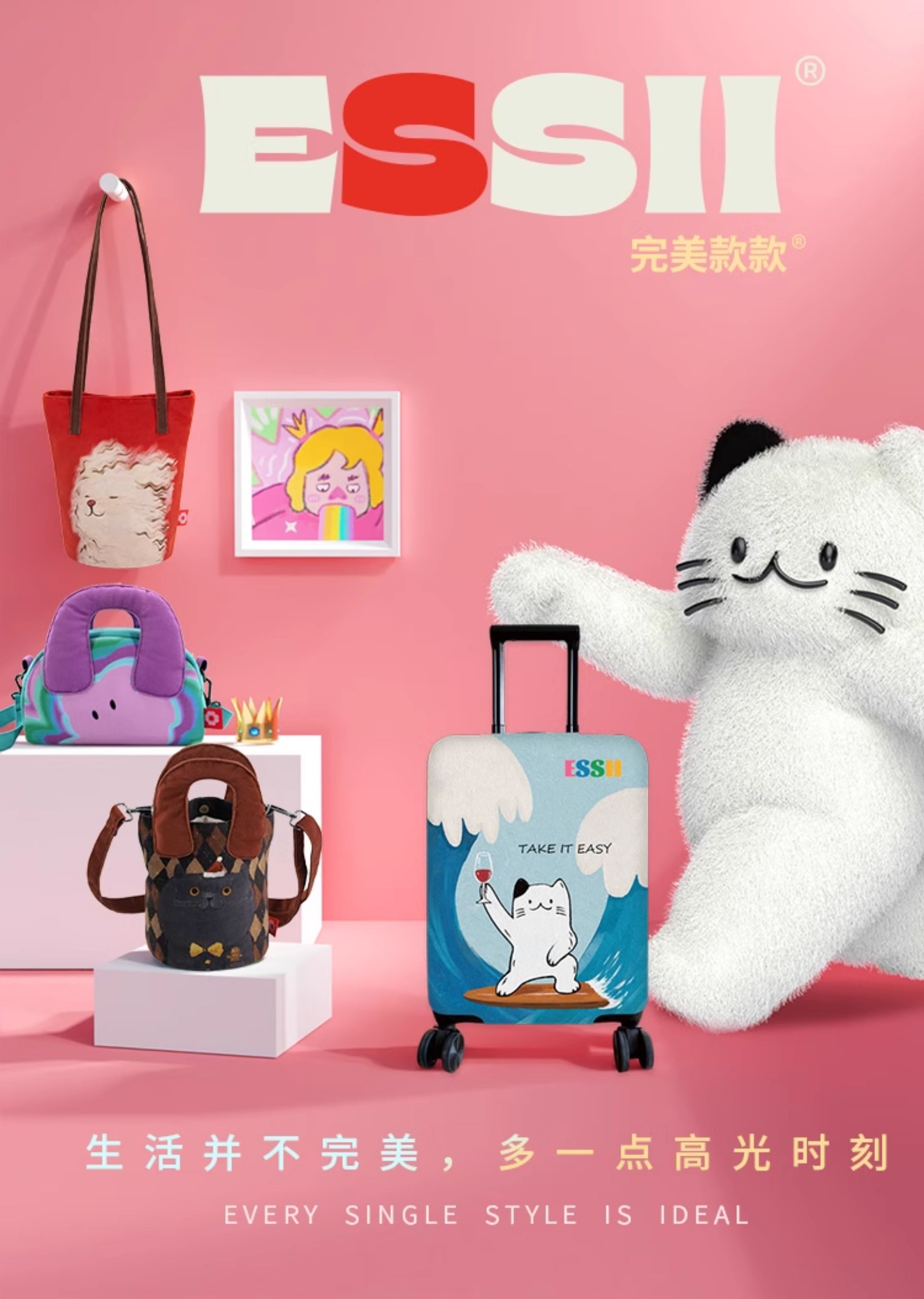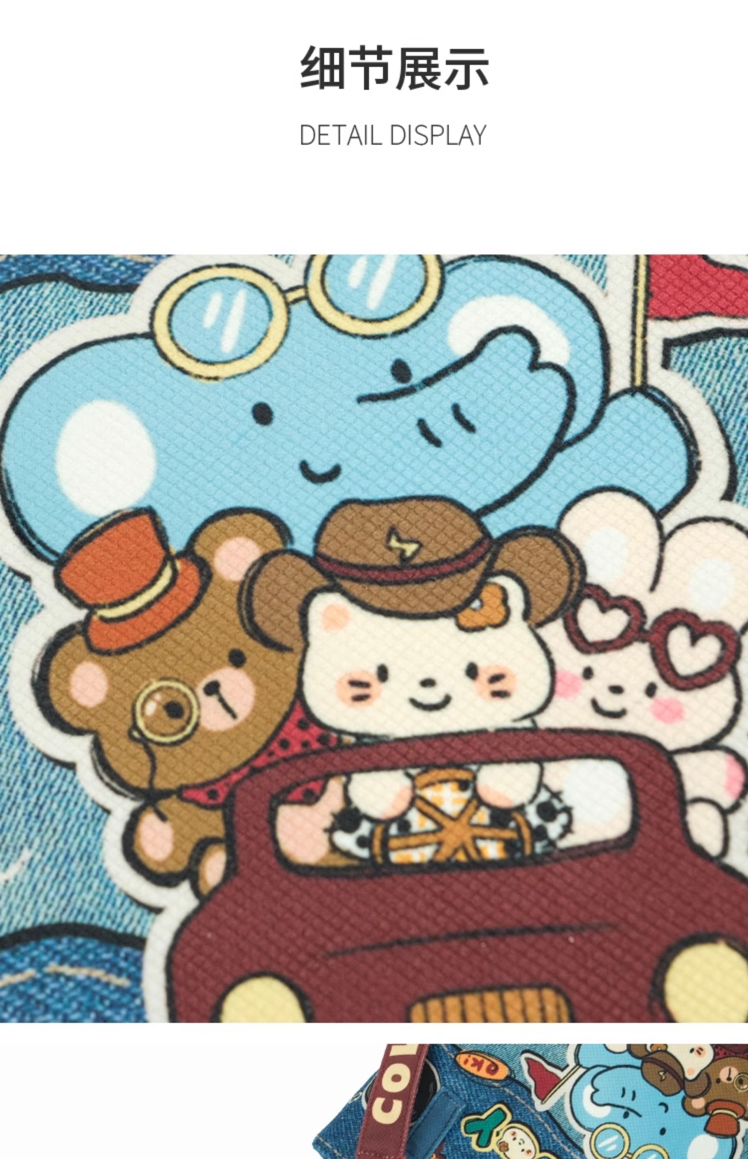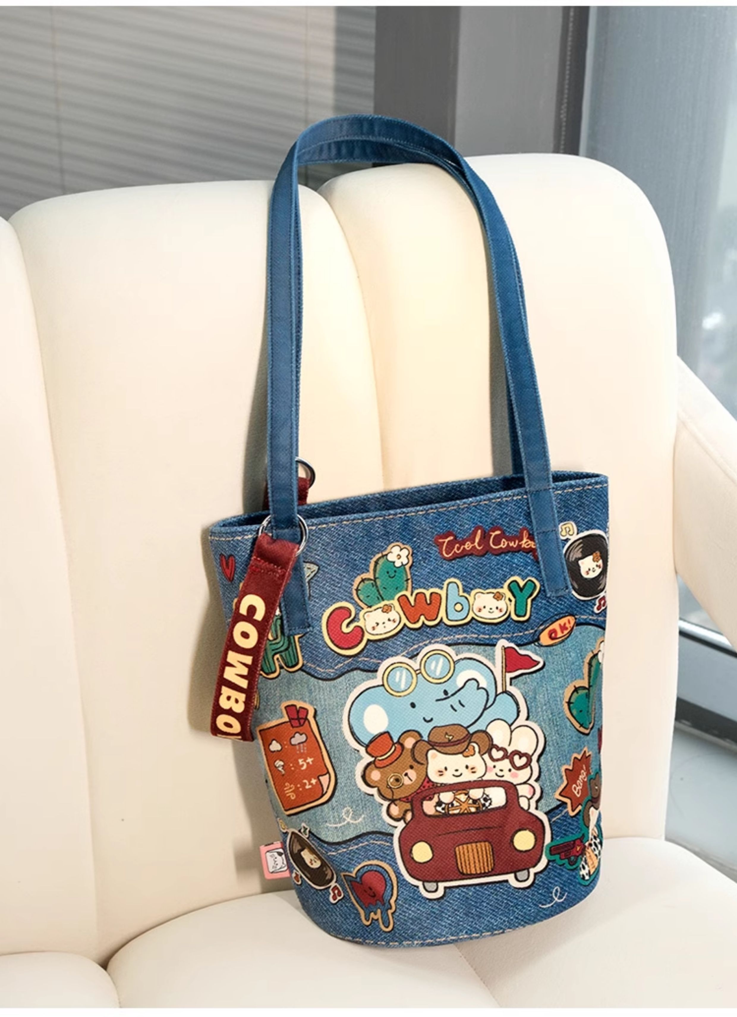 完美款款牛仔小猫插画可爱小众休闲时尚单肩可斜挎加长水桶帆布包