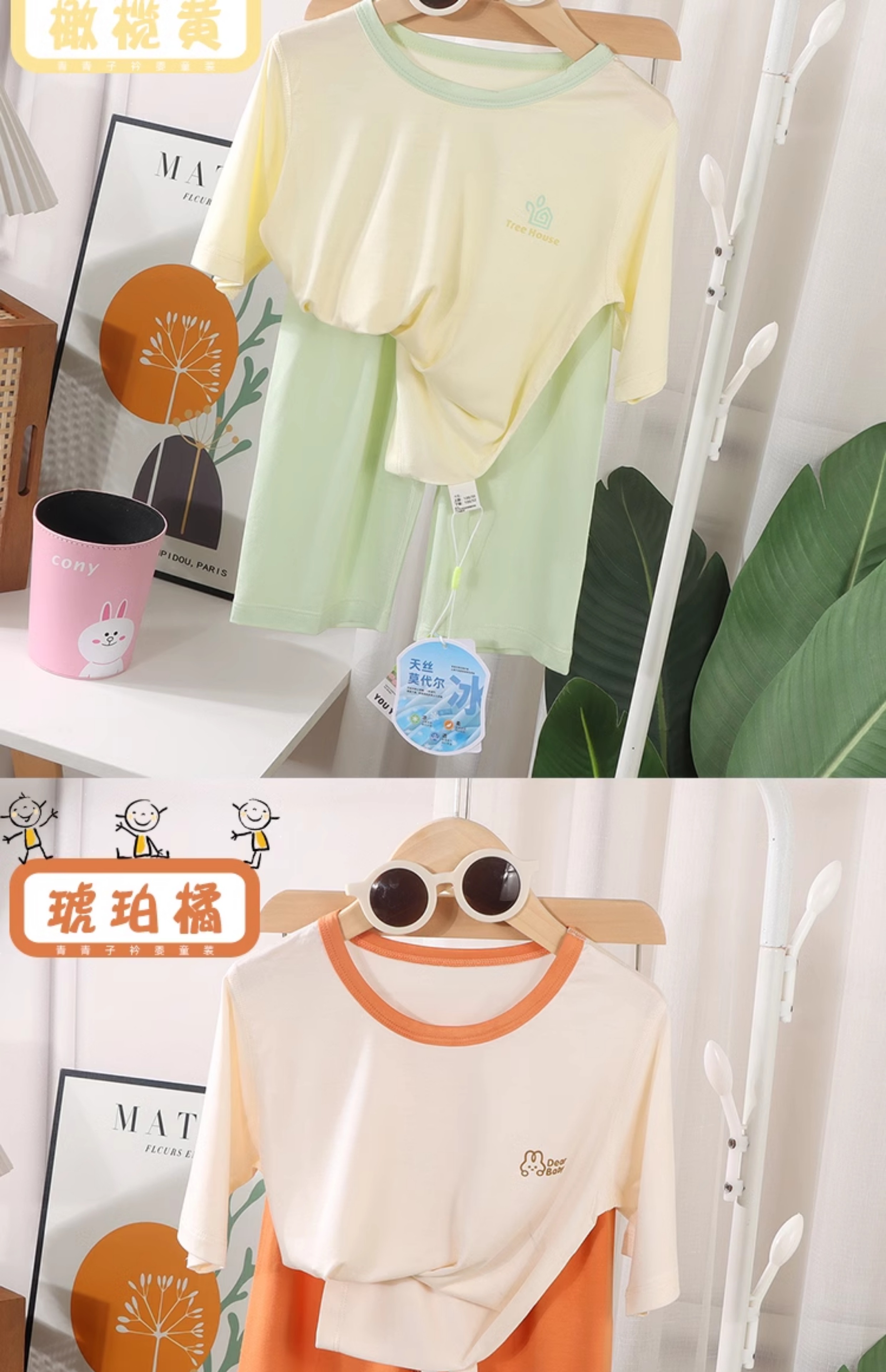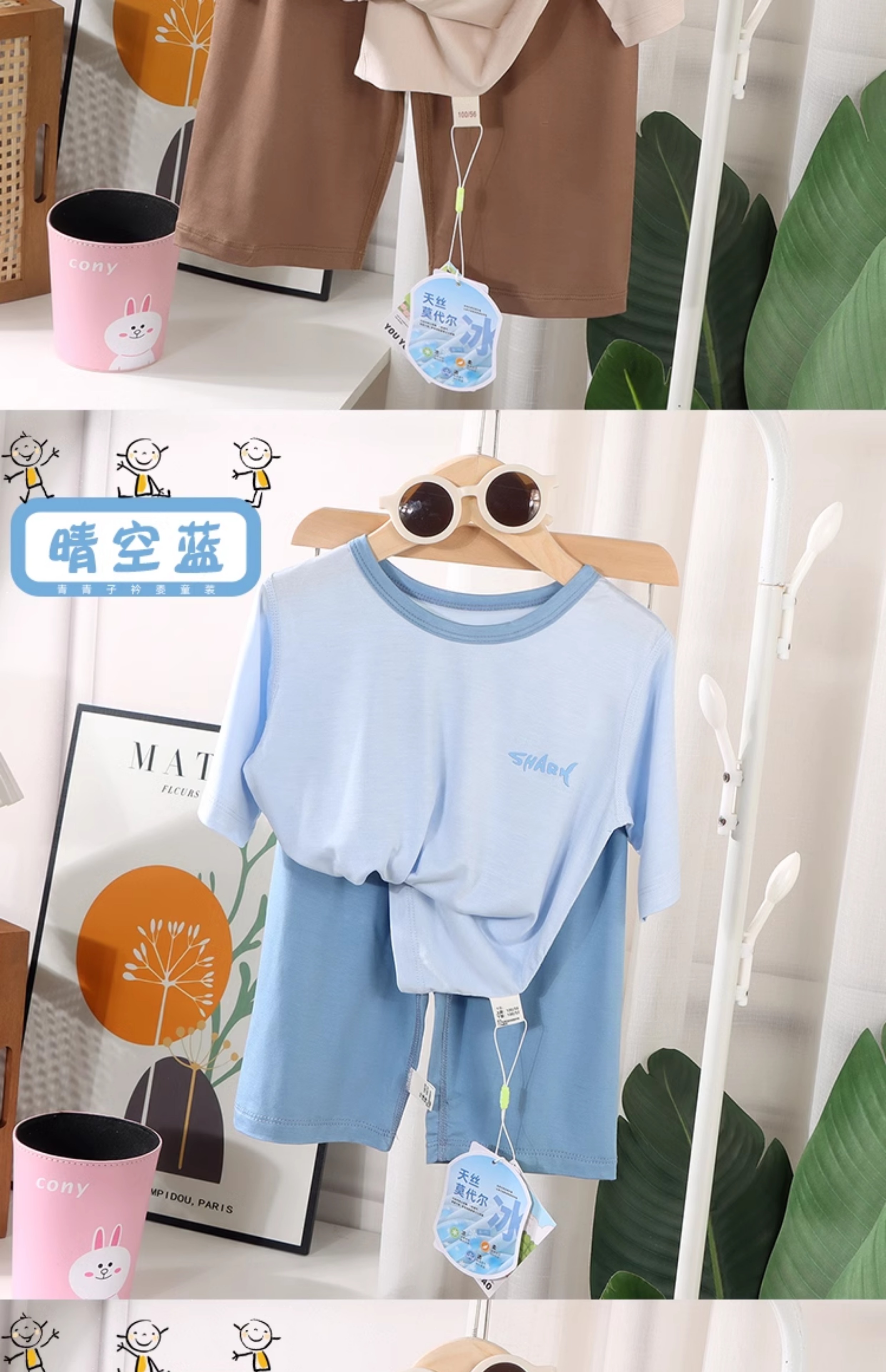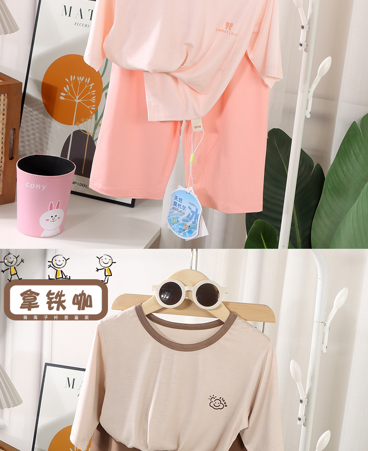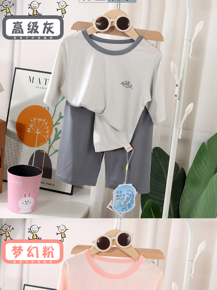 儿童睡衣七分袖裤天丝莫代尔无骨男女中大童空调家居服套装莱赛尔