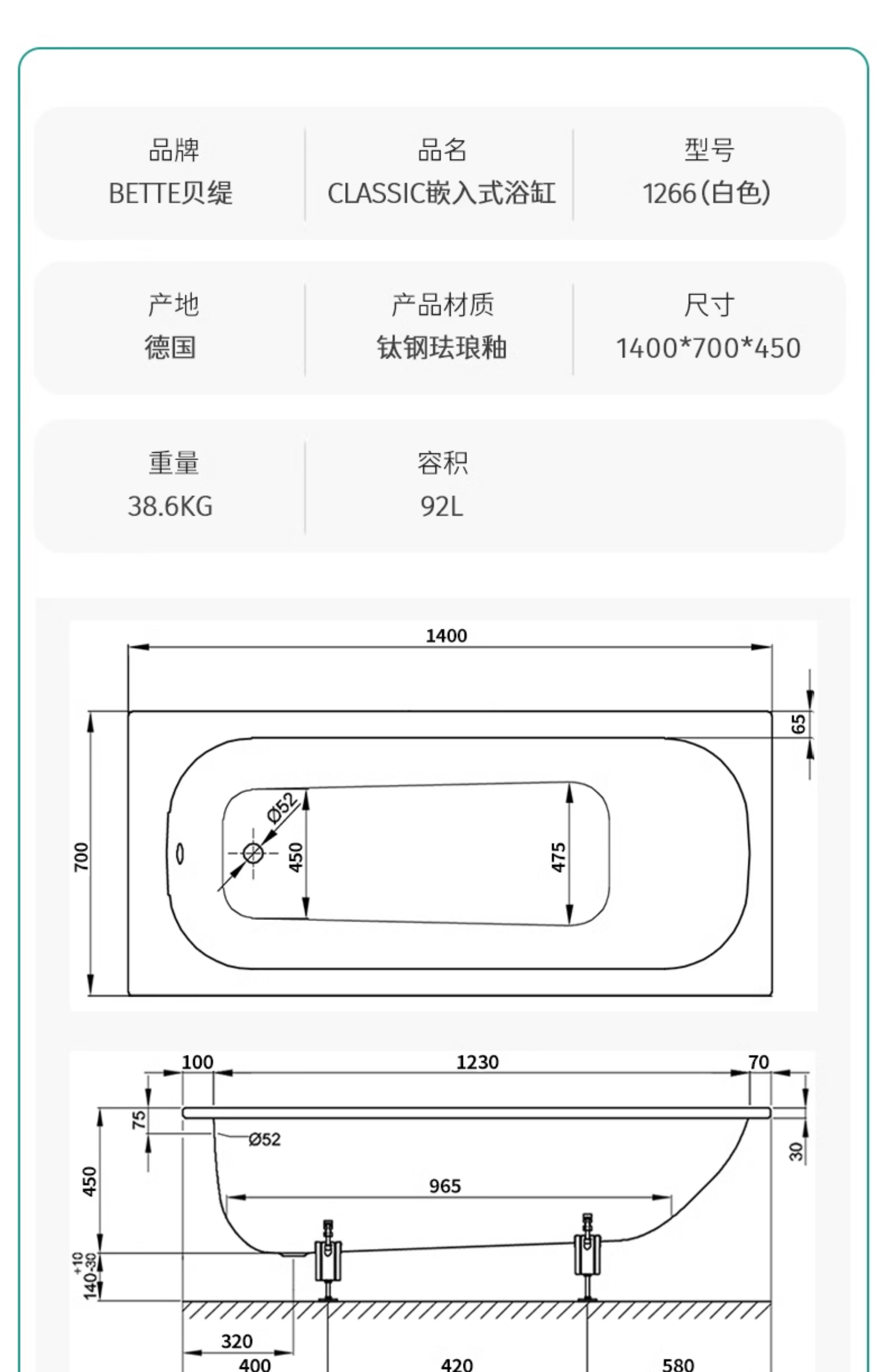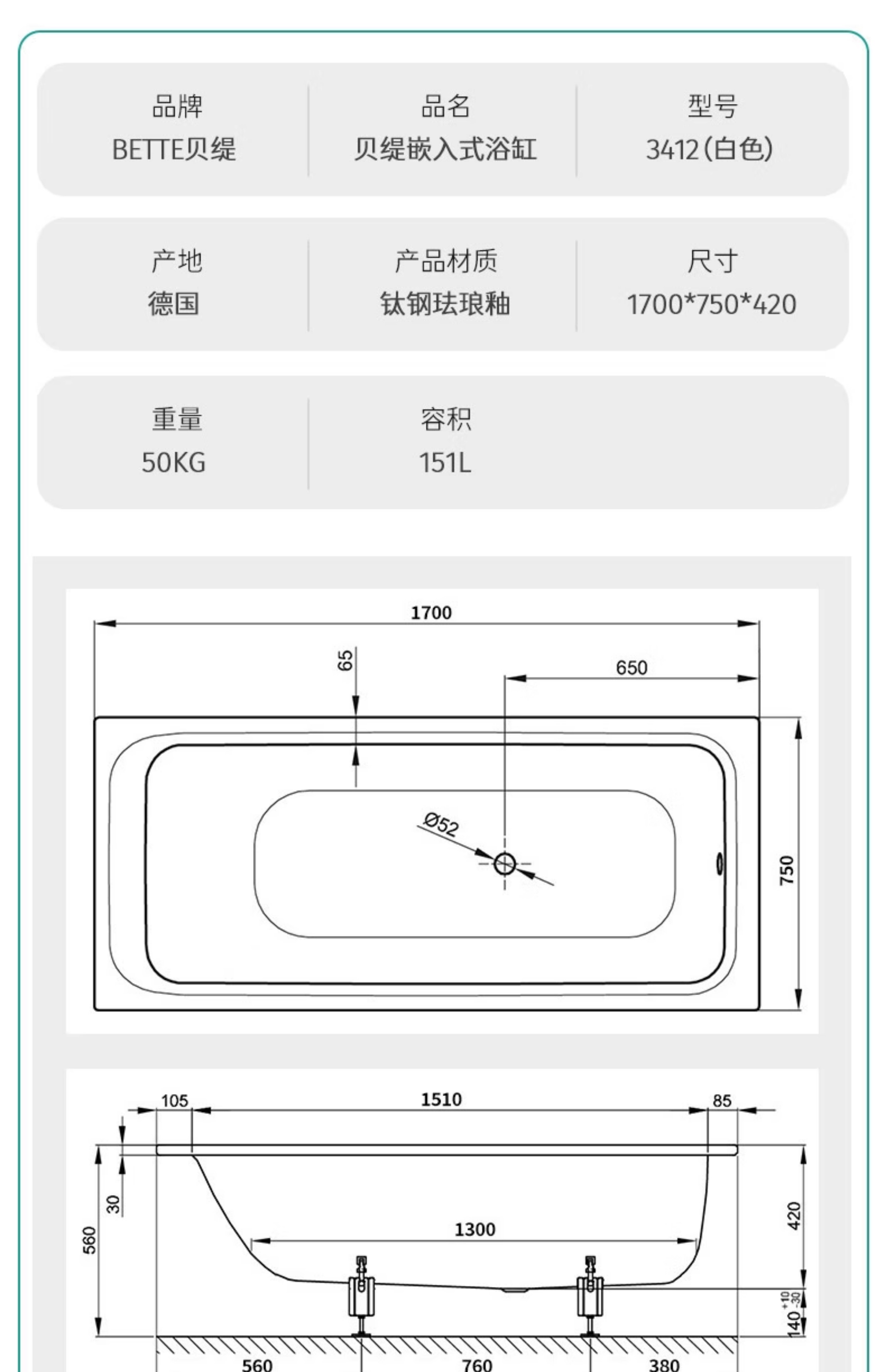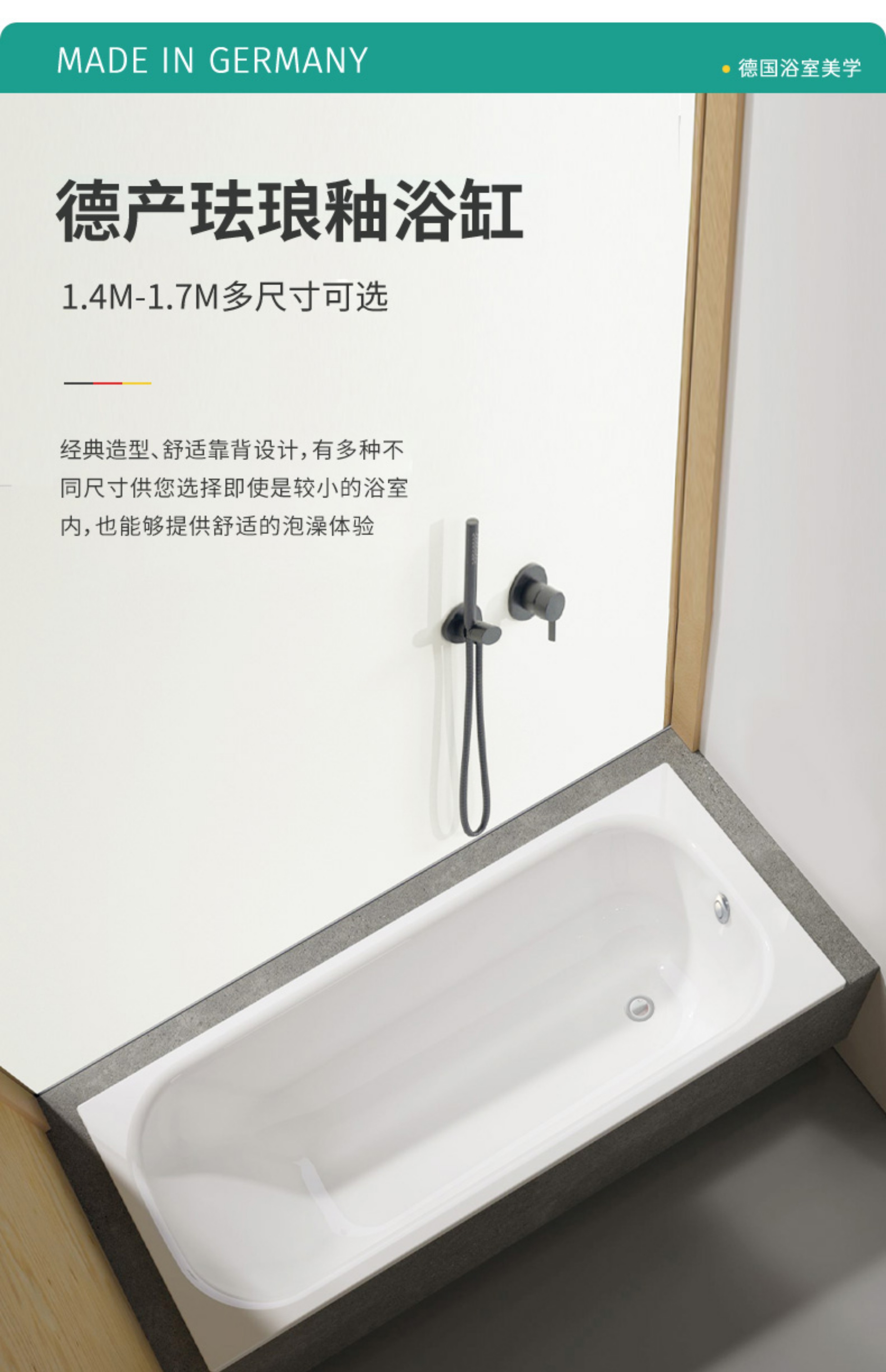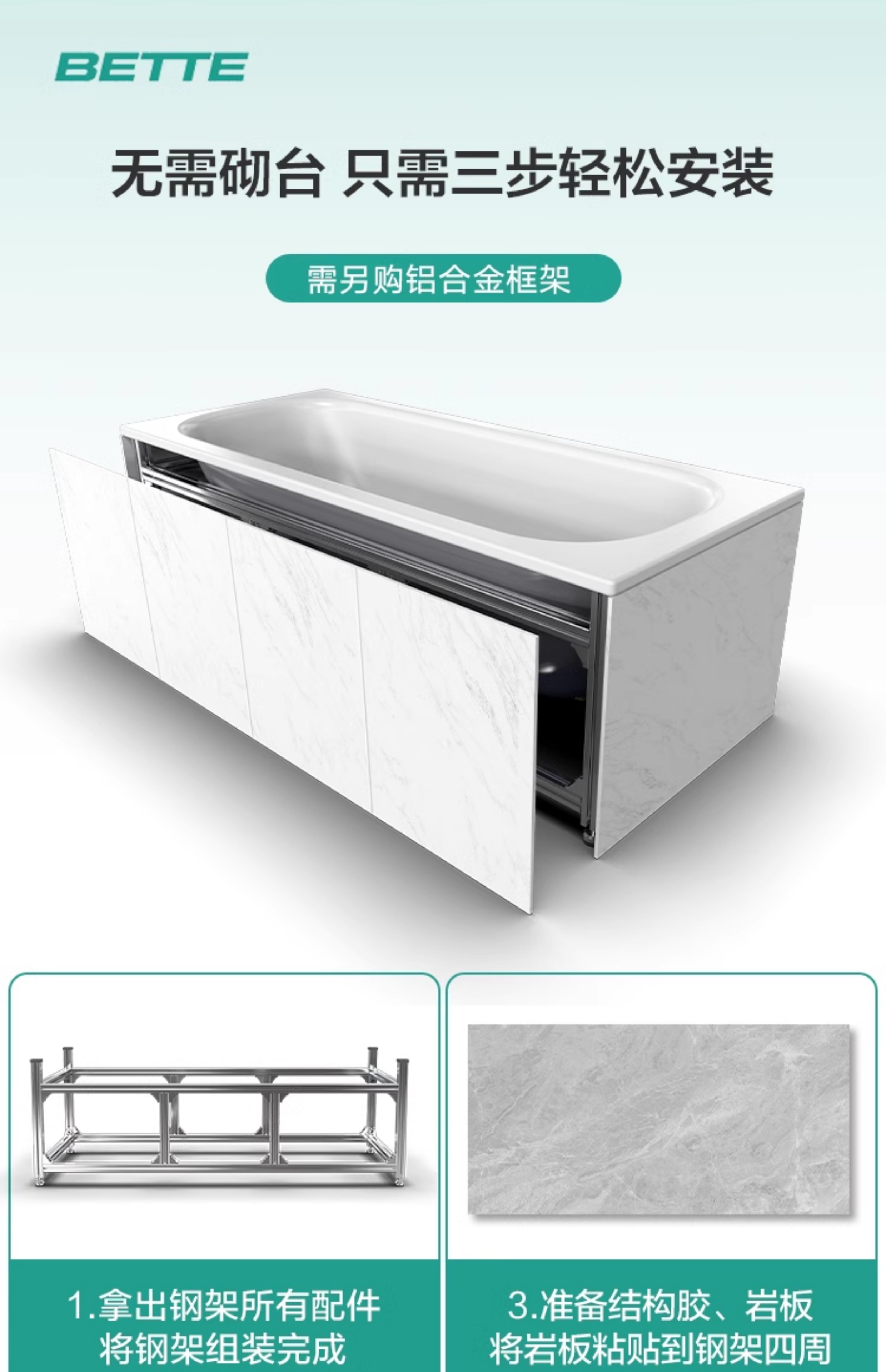Bette/贝缇德国进口钛钢瓷珐琅釉嵌入式浴缸家用成人泡澡搪瓷浴缸