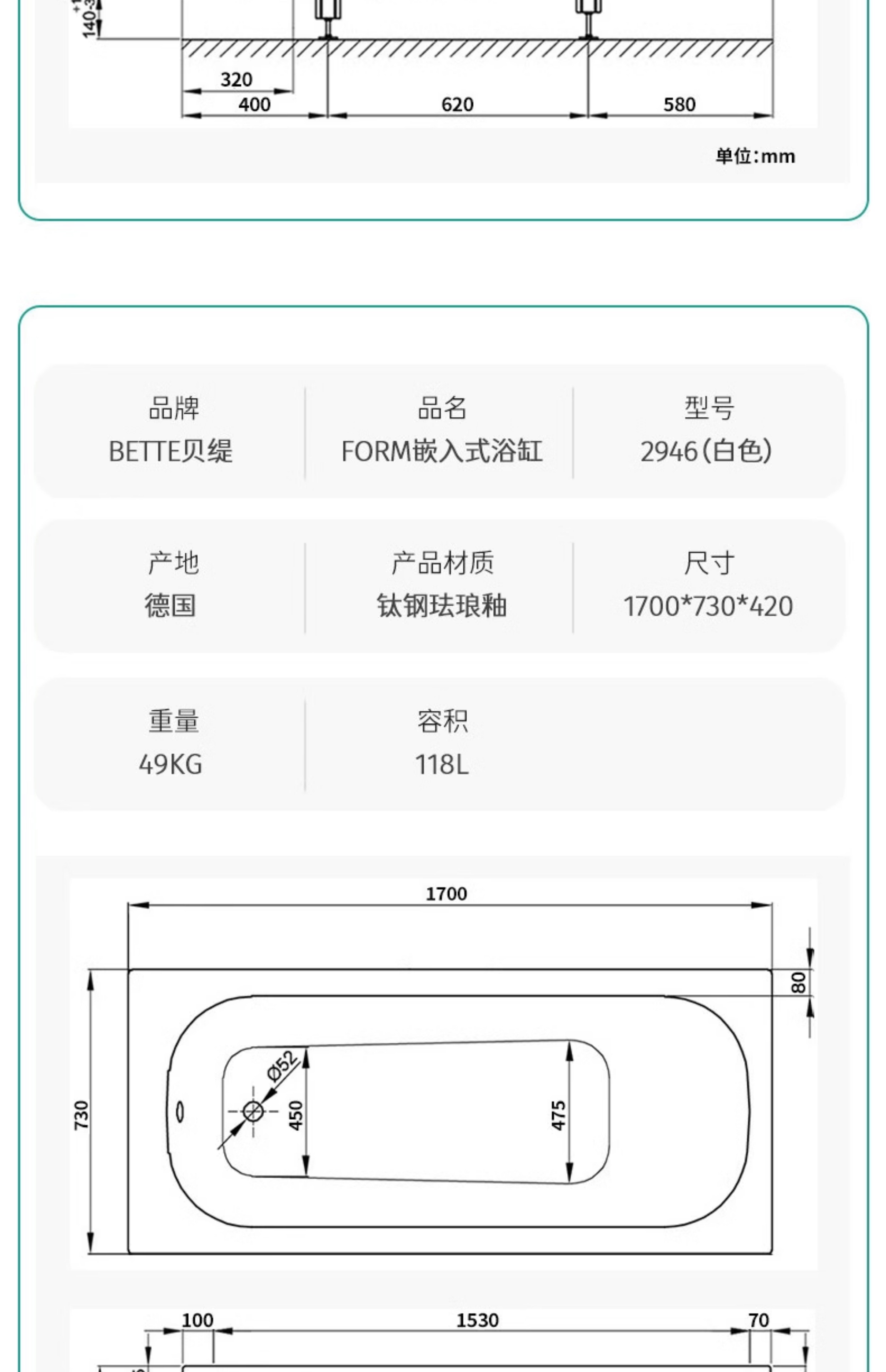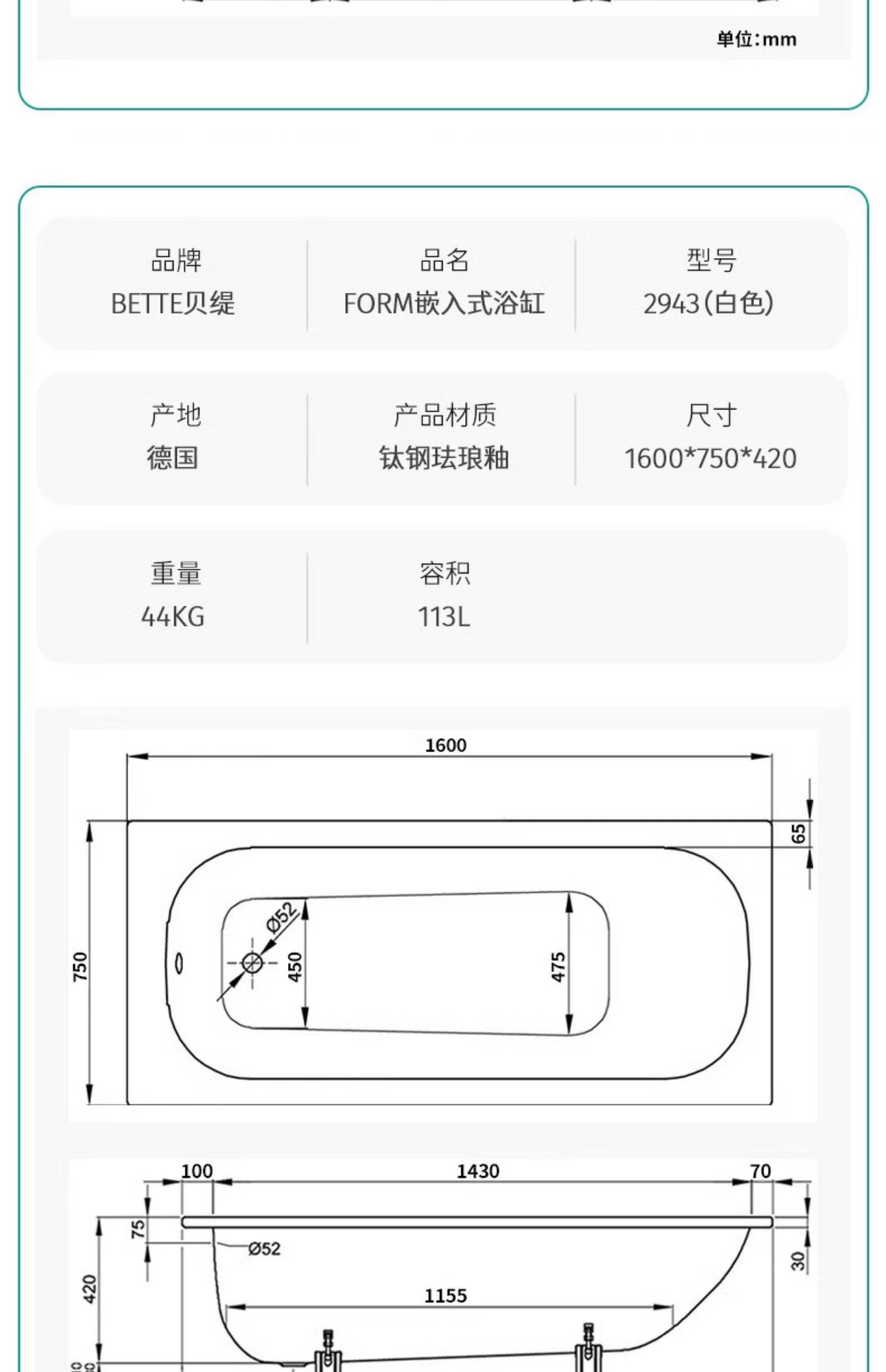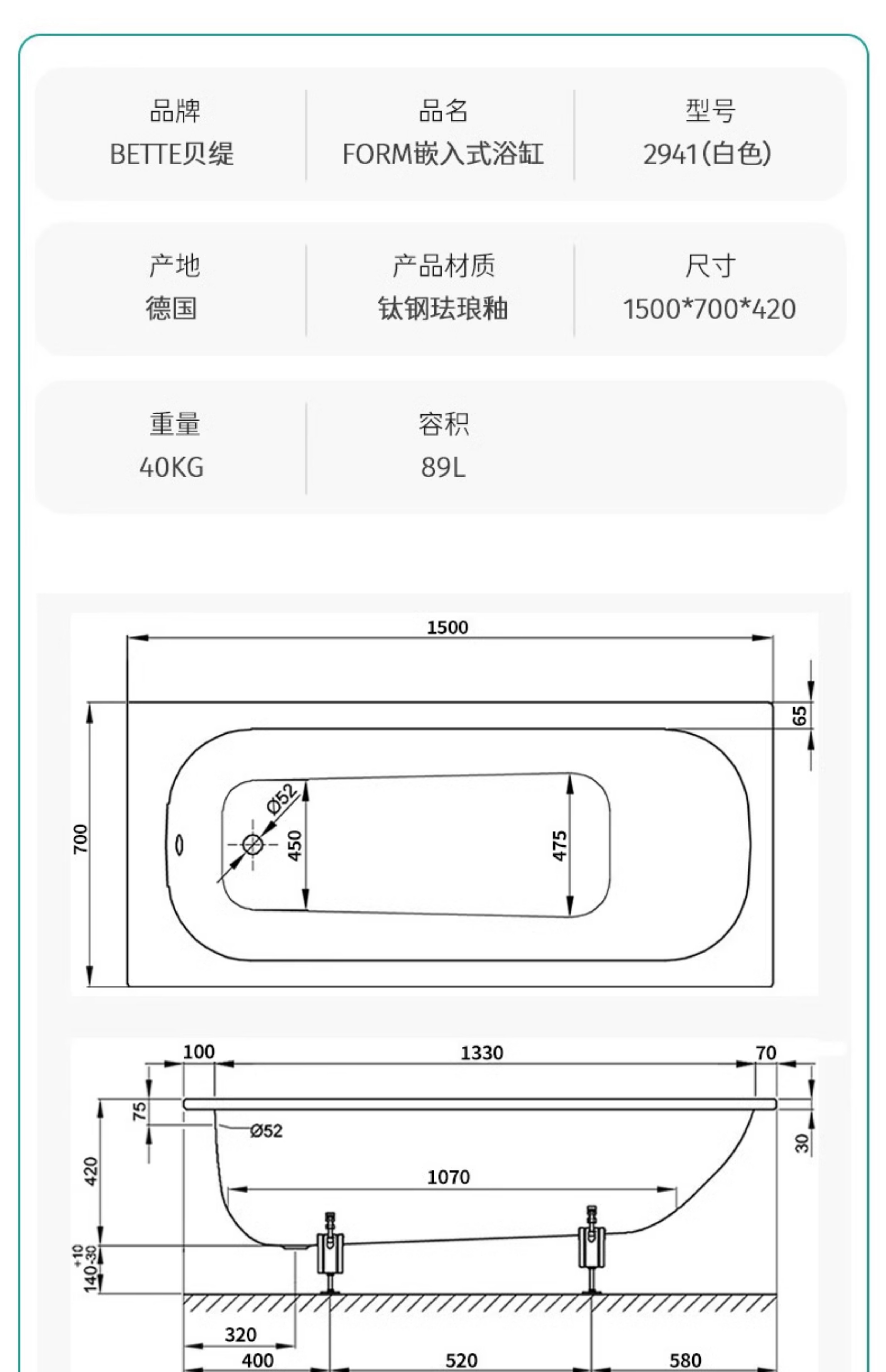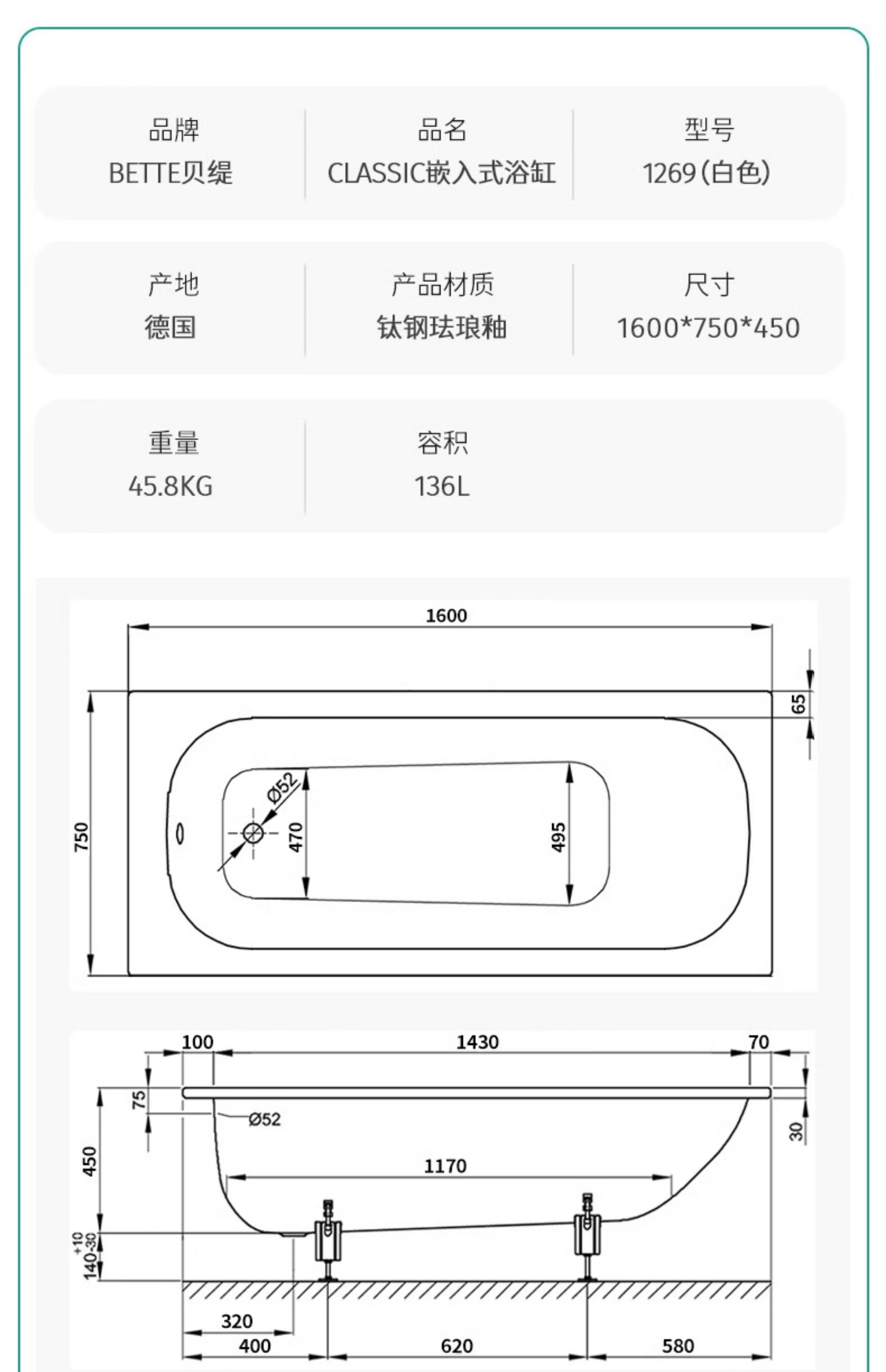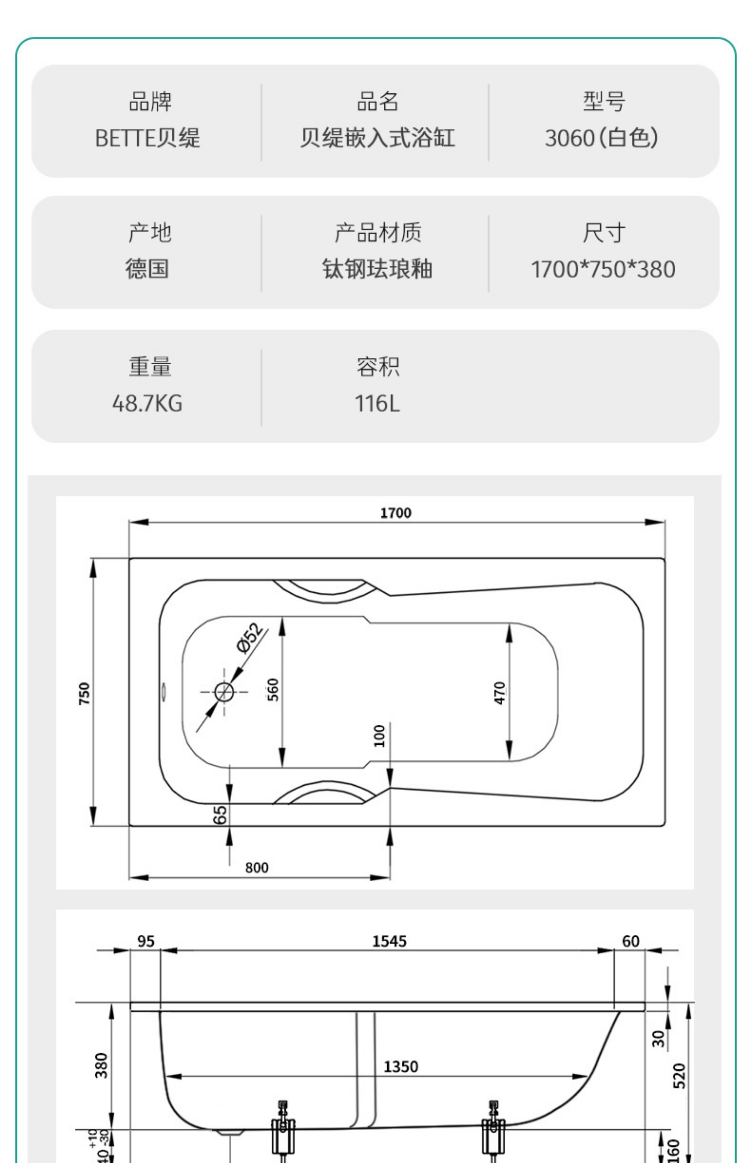 Bette/贝缇德国进口钛钢瓷珐琅釉嵌入式浴缸家用成人泡澡搪瓷浴缸