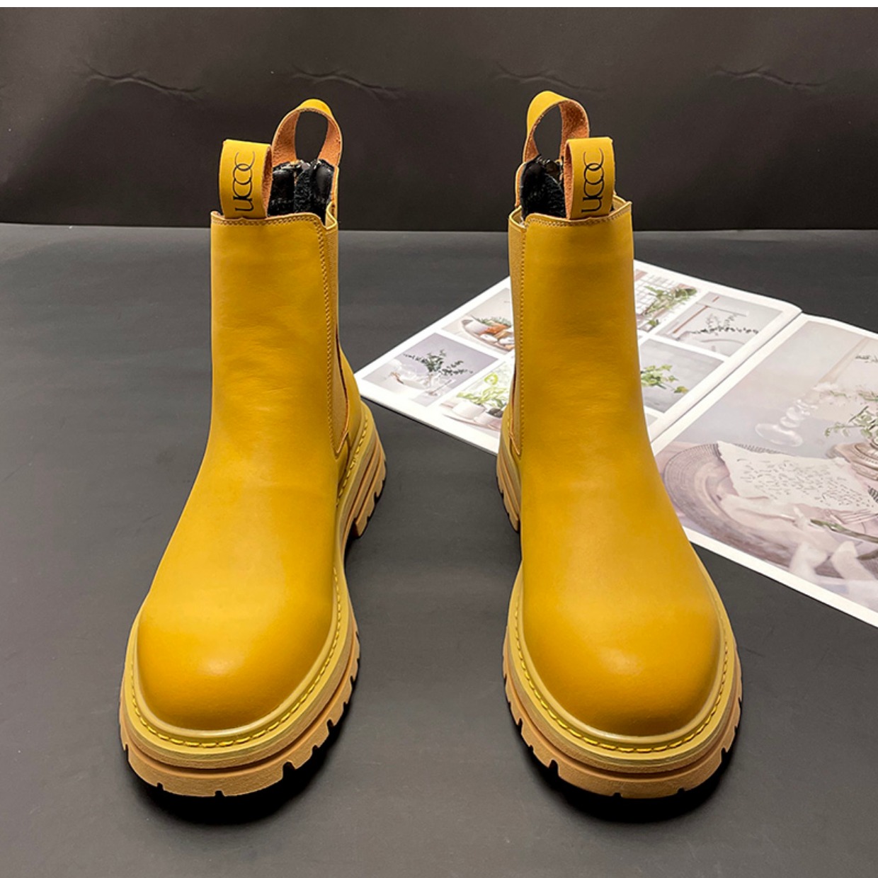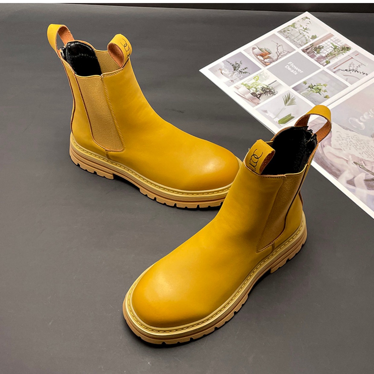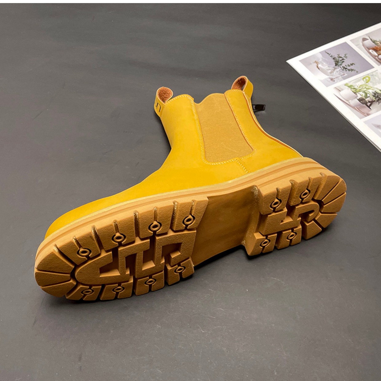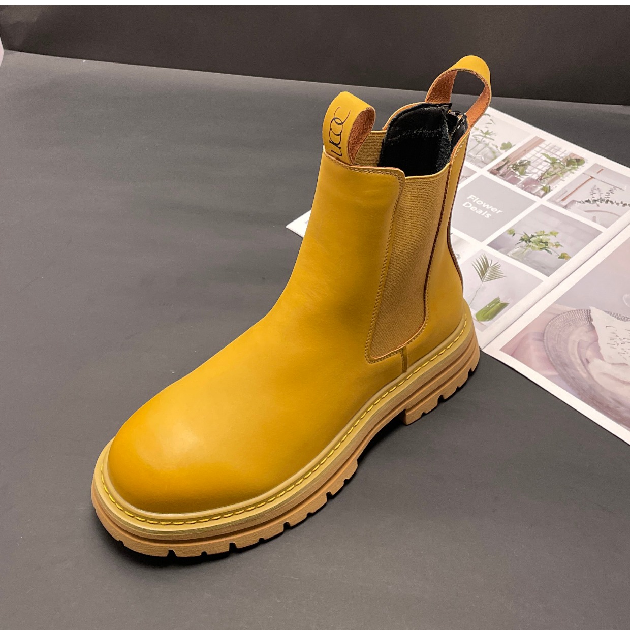马丁靴男春季新款中帮英伦风套脚时尚大黄靴子内增高软皮切尔西靴