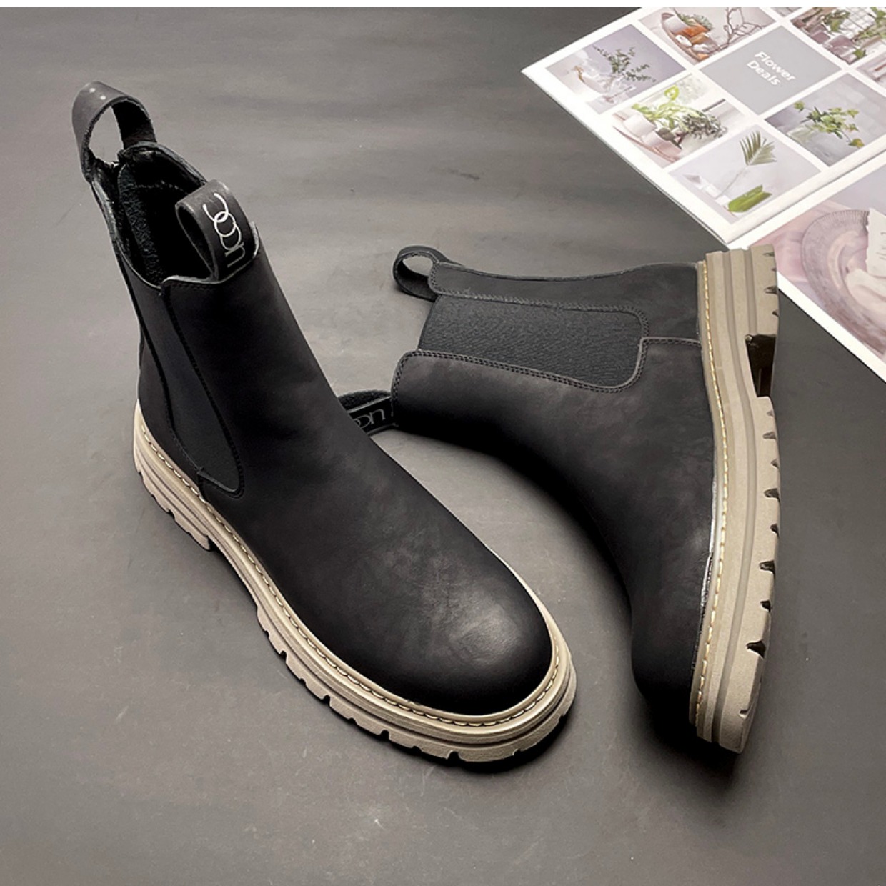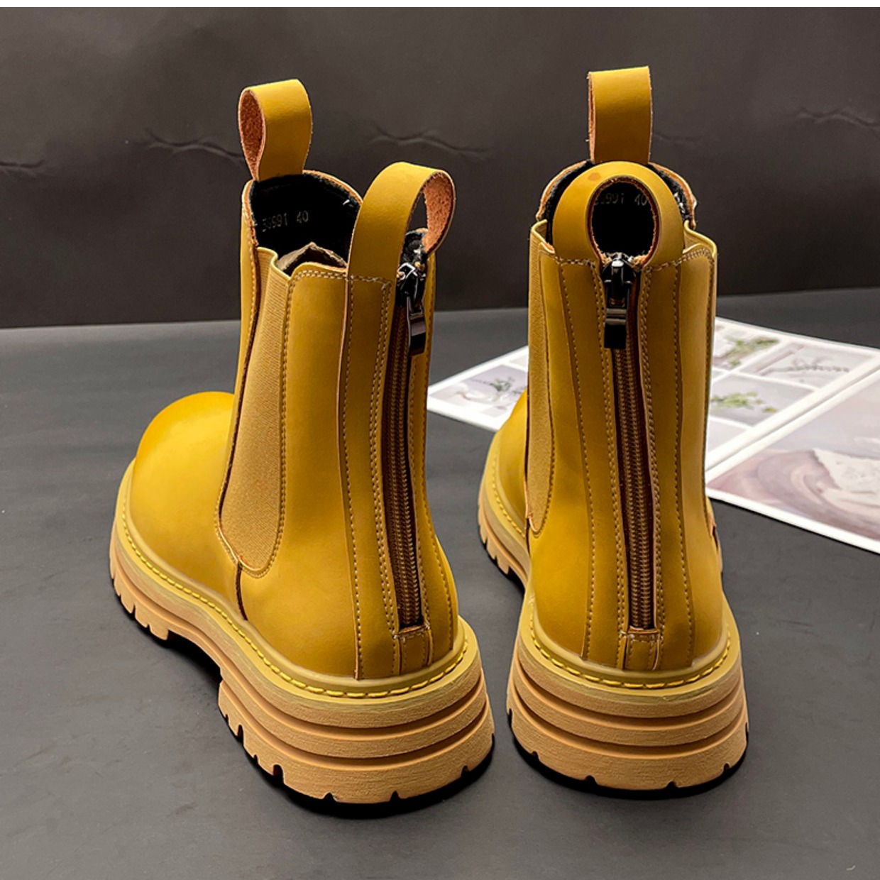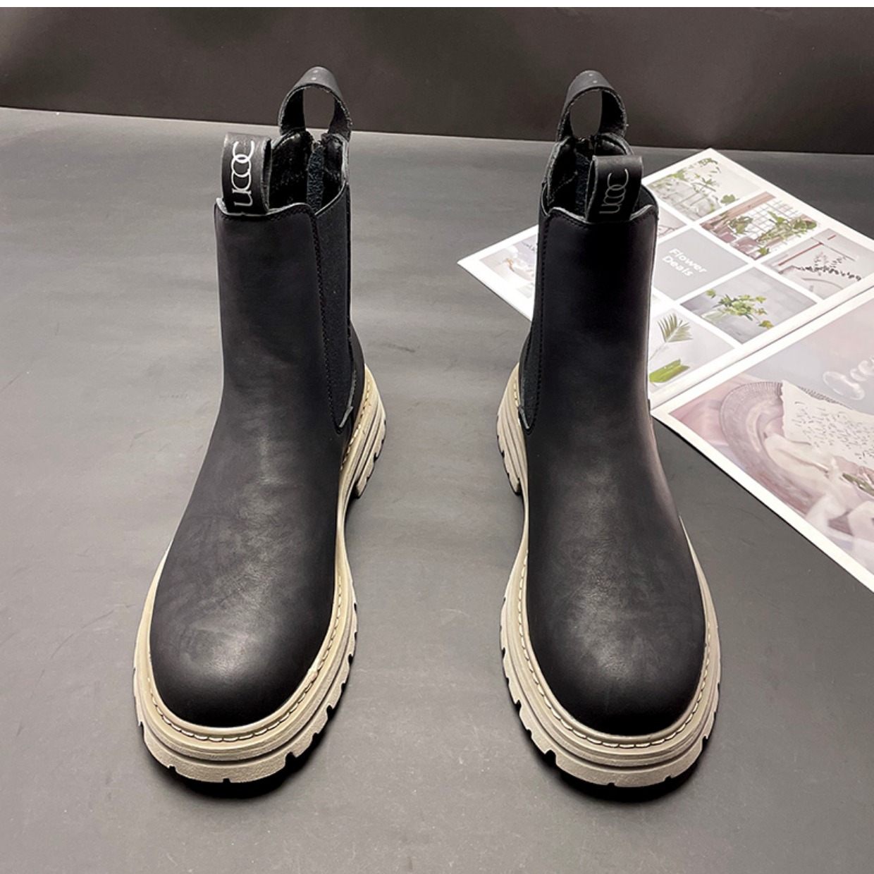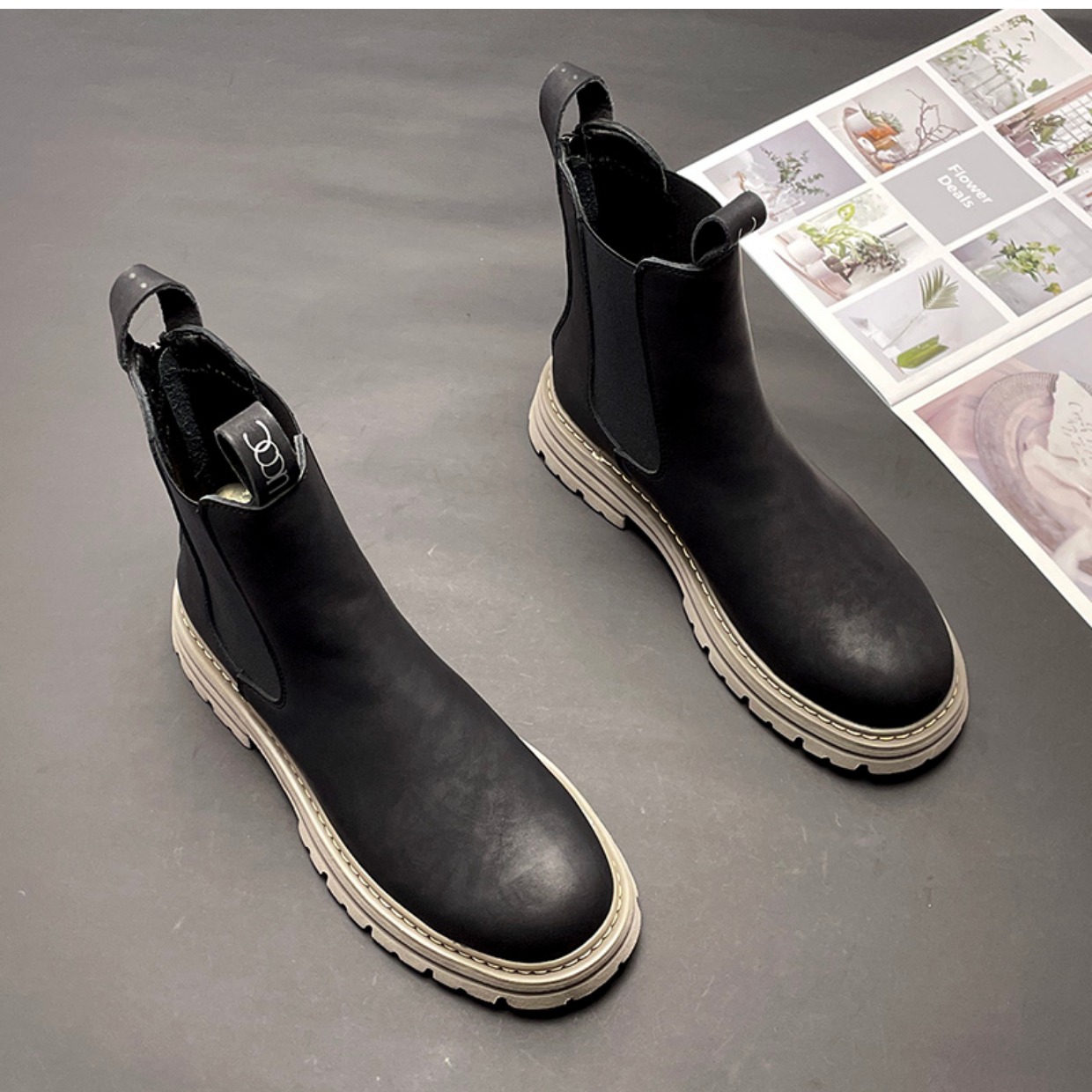 马丁靴男春季新款中帮英伦风套脚时尚大黄靴子内增高软皮切尔西靴