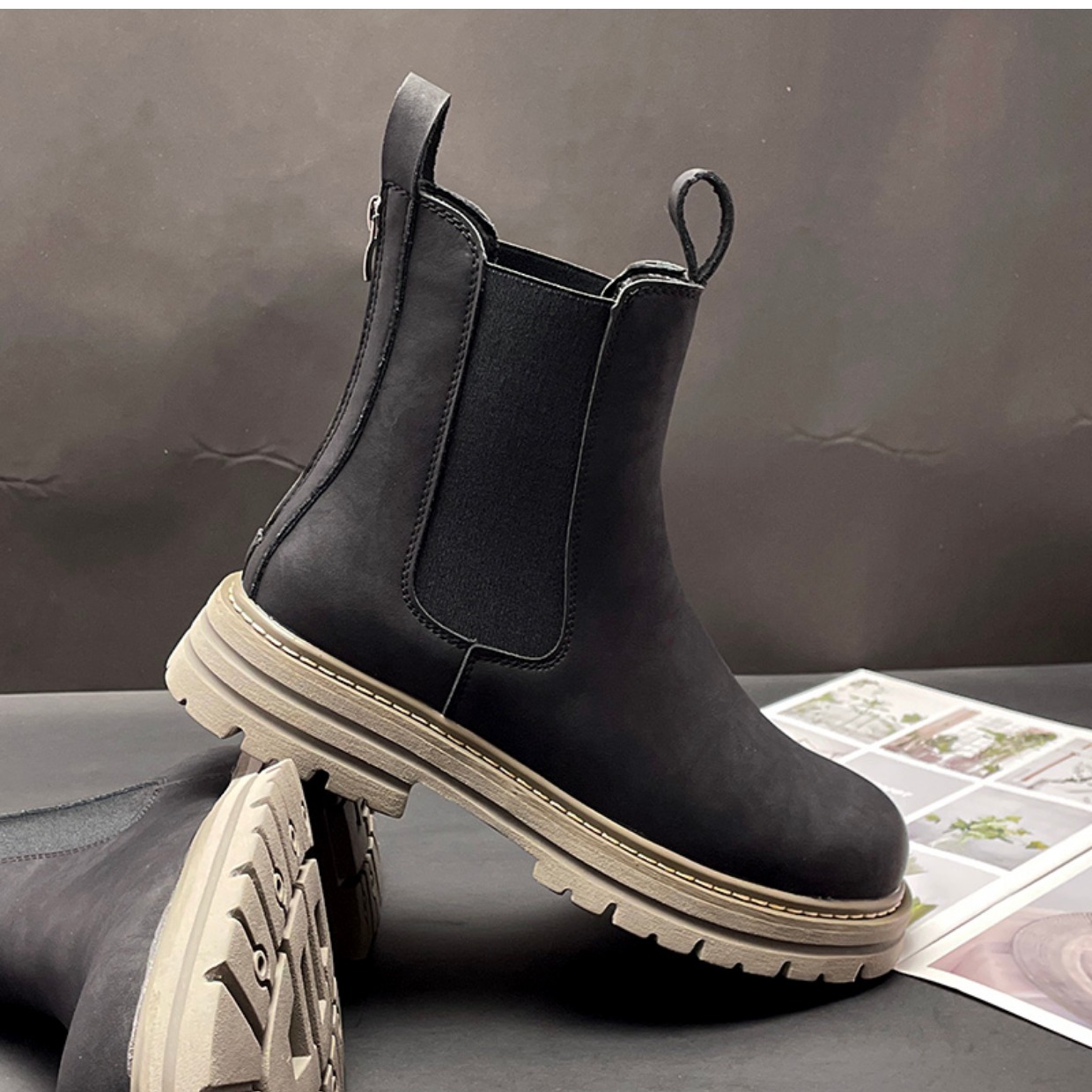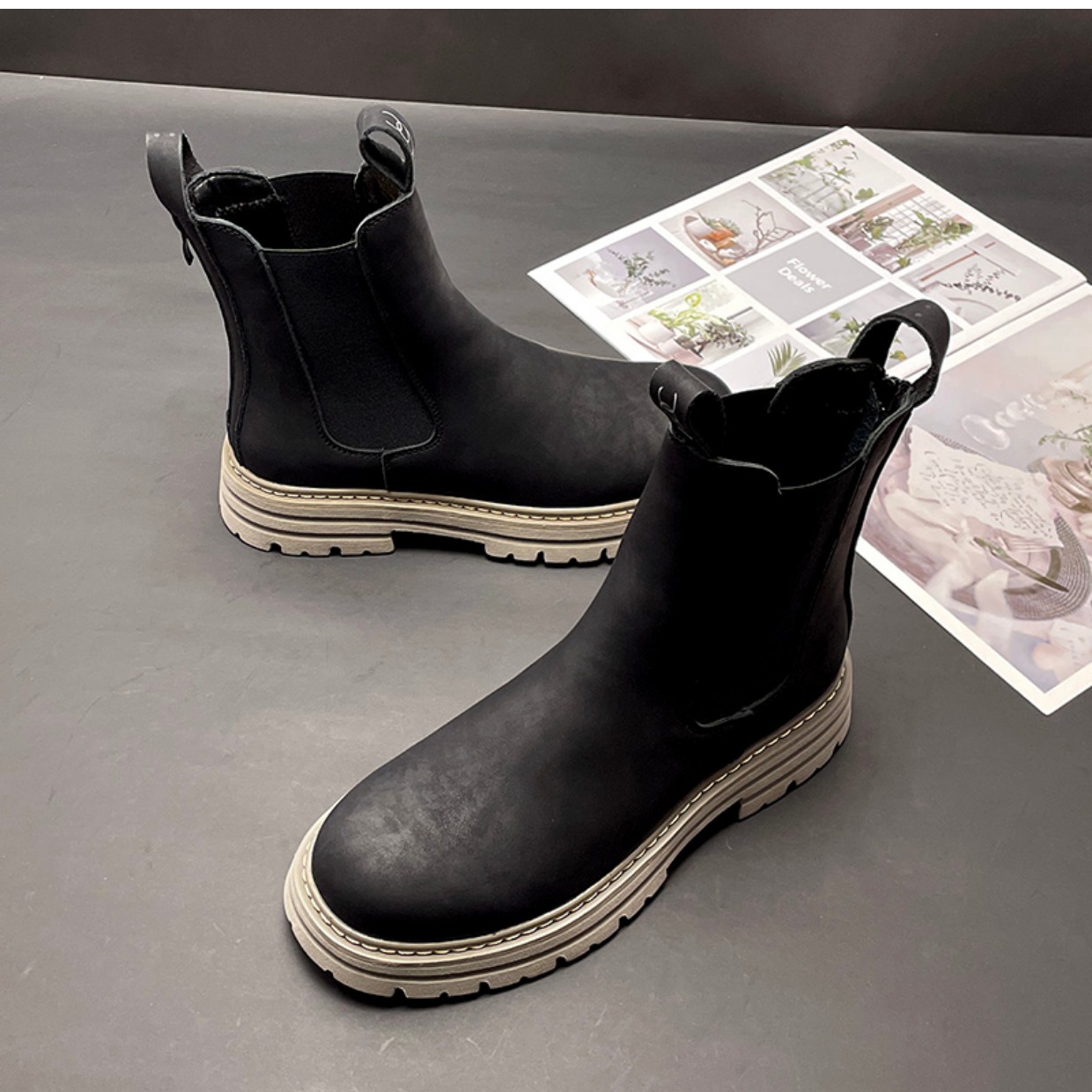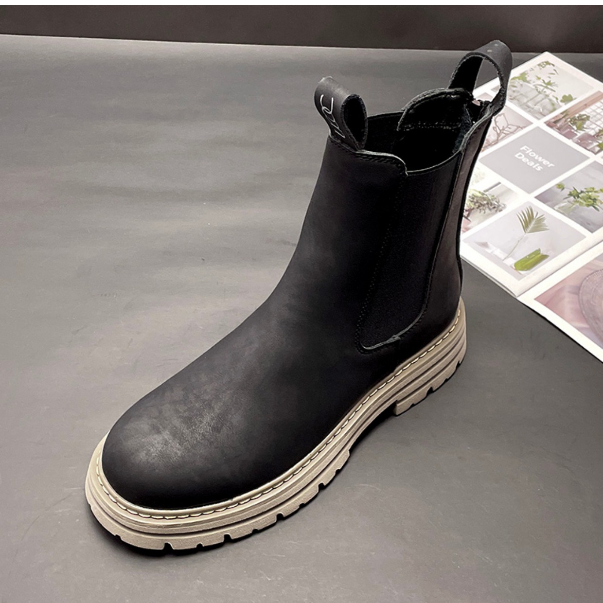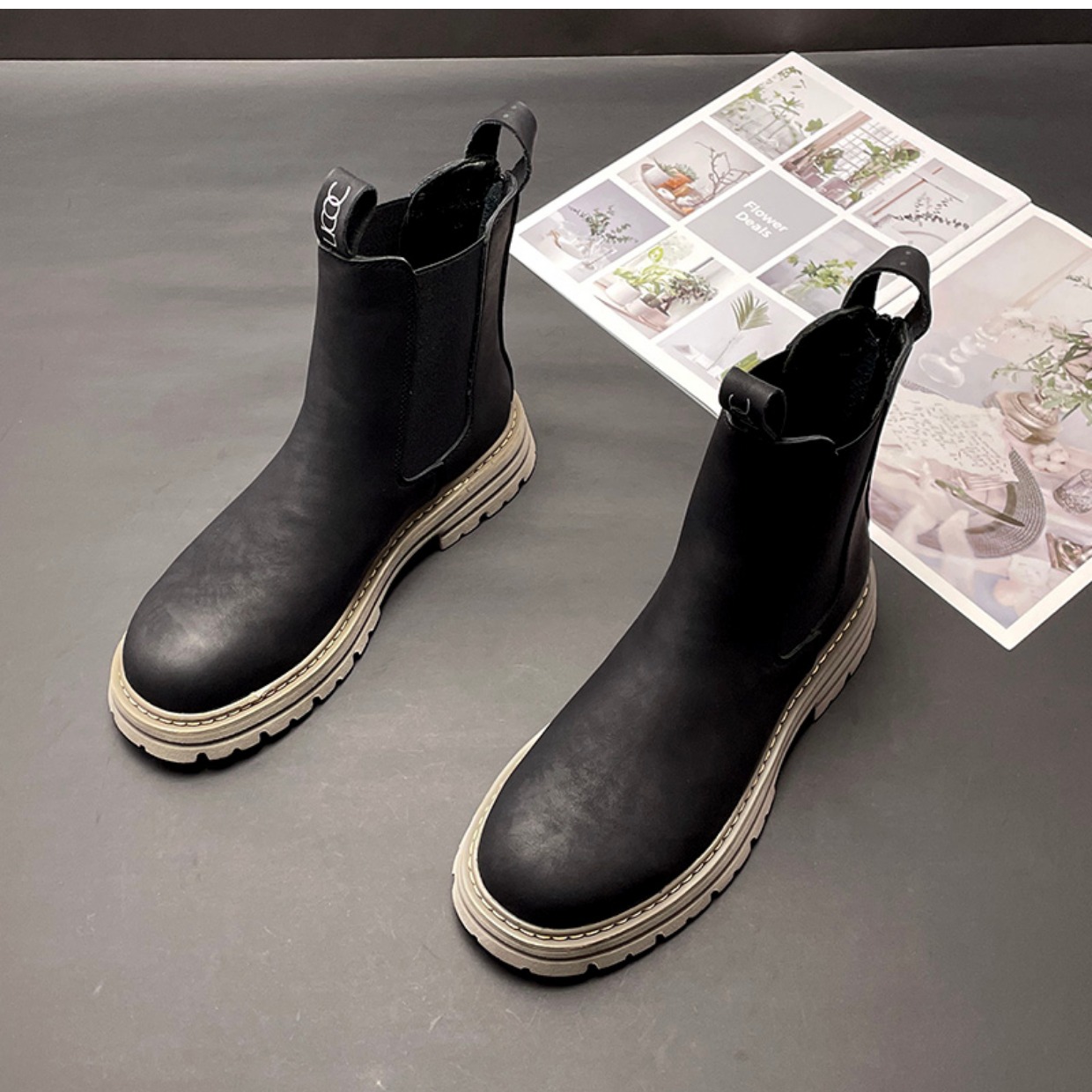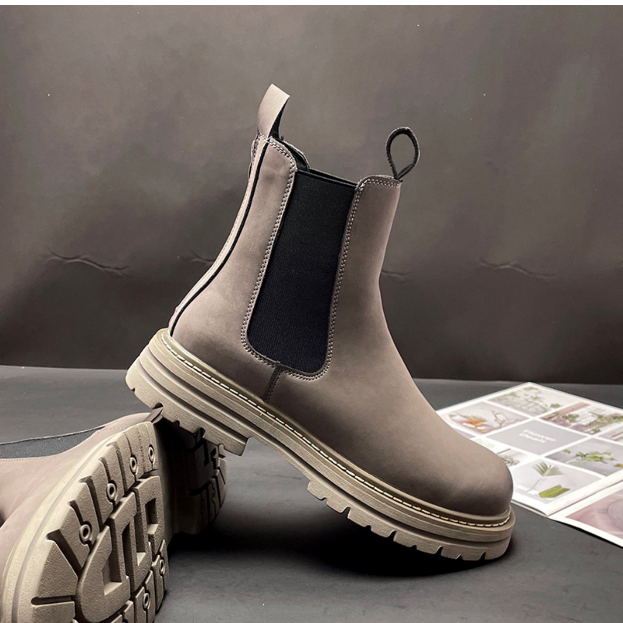 马丁靴男春季新款中帮英伦风套脚时尚大黄靴子内增高软皮切尔西靴
