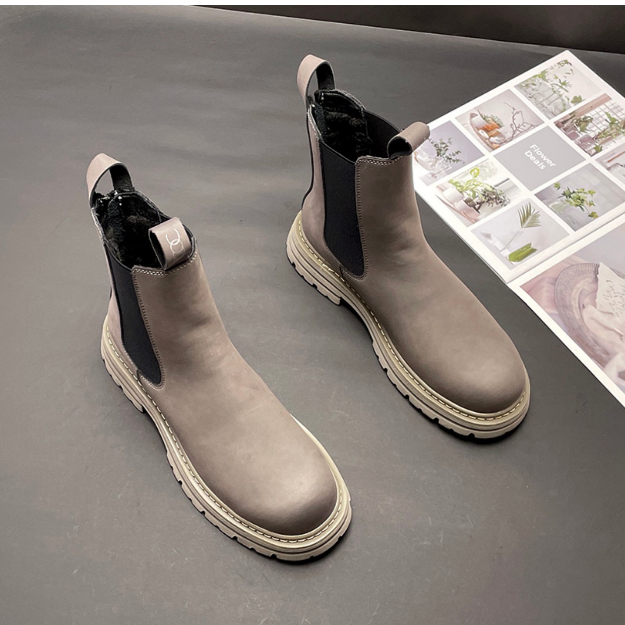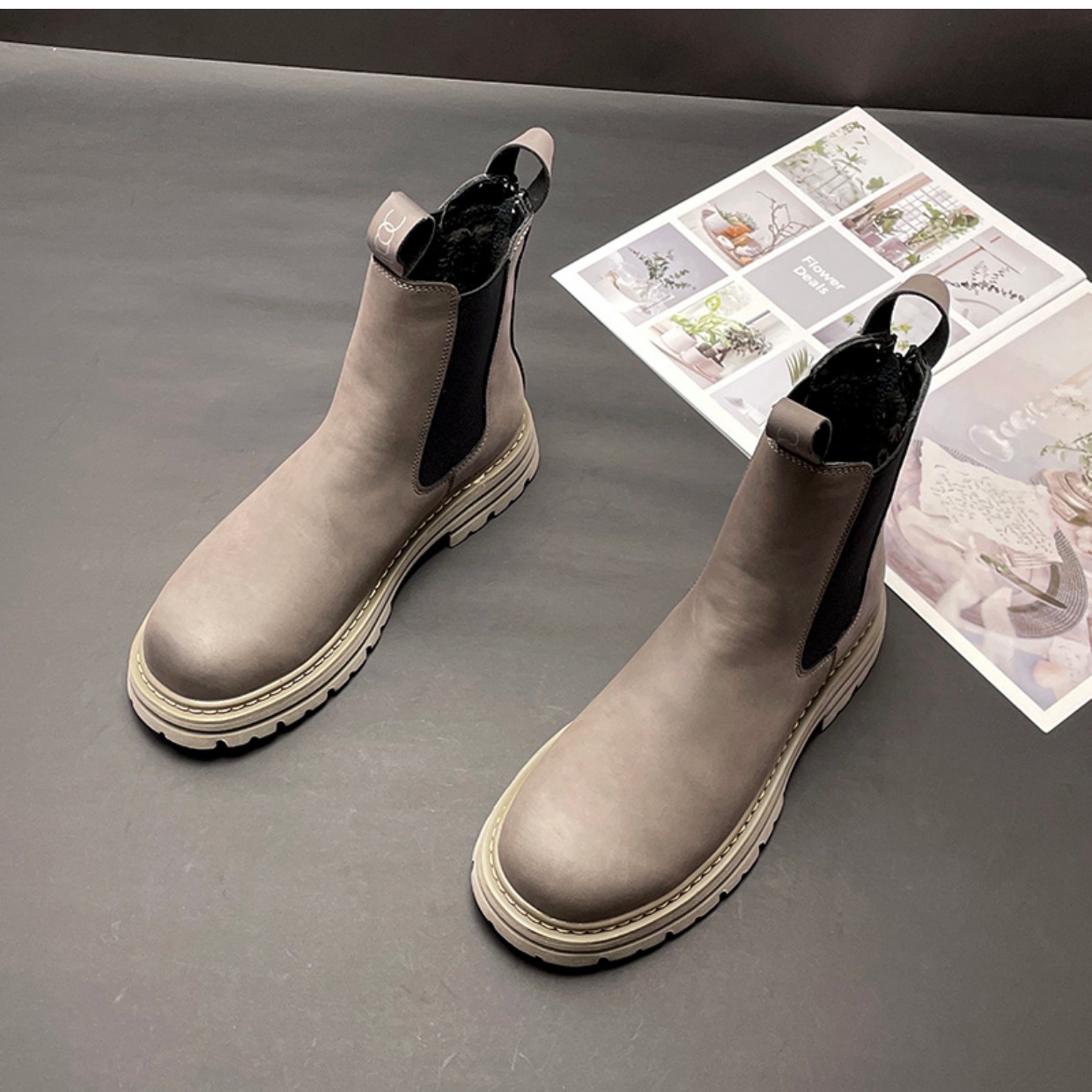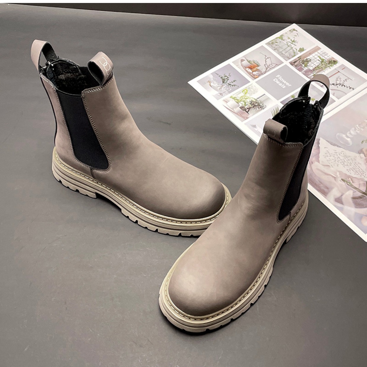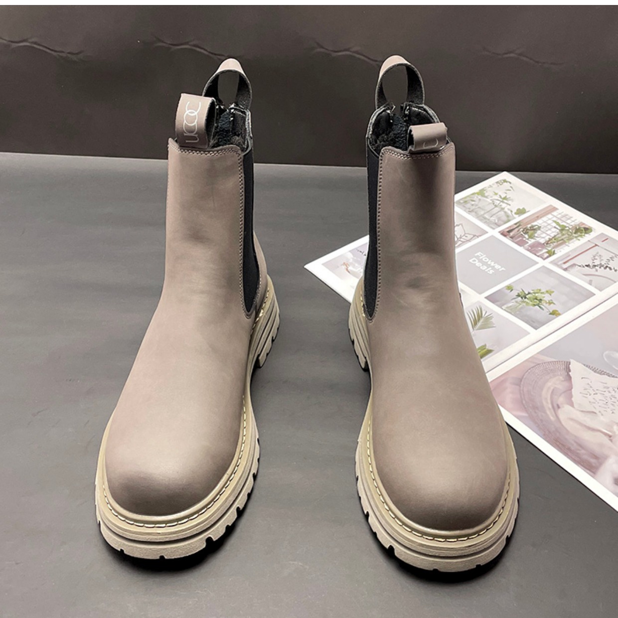 马丁靴男春季新款中帮英伦风套脚时尚大黄靴子内增高软皮切尔西靴