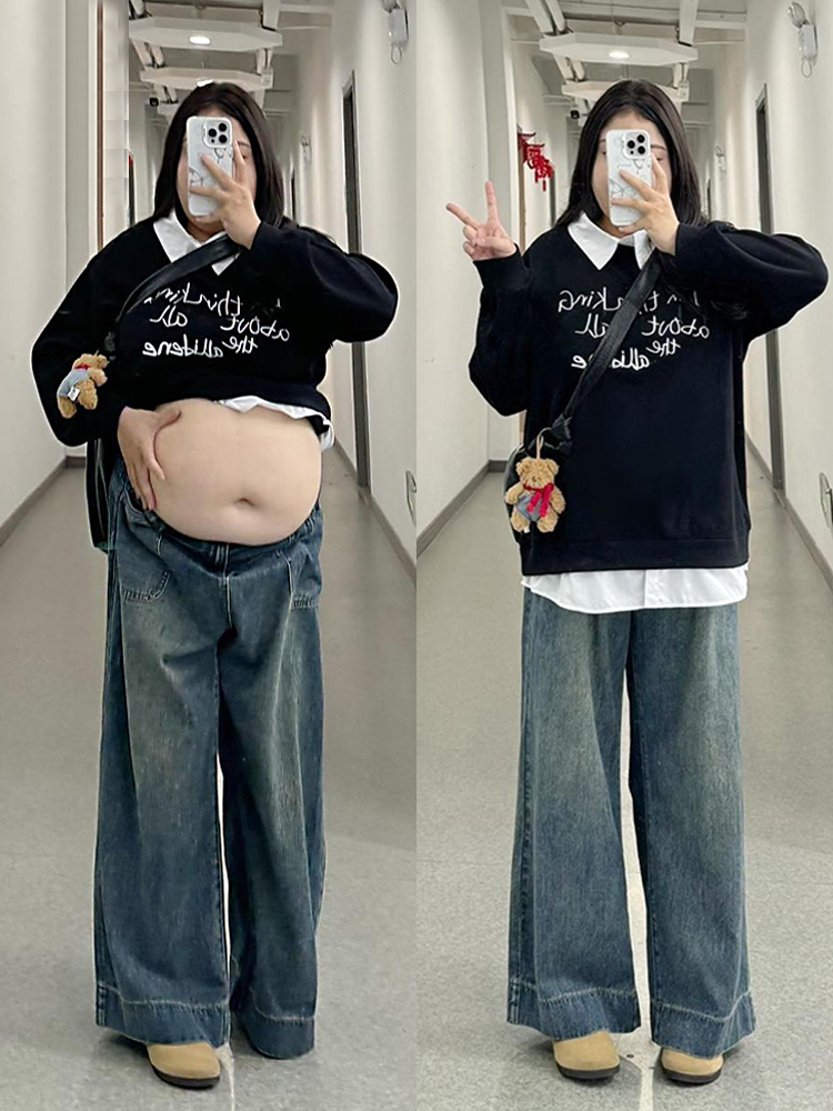 300斤大码女装胖mm复古深蓝色牛仔裤女新款裤子宽松显瘦阔腿长裤