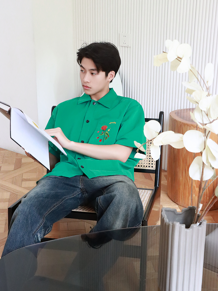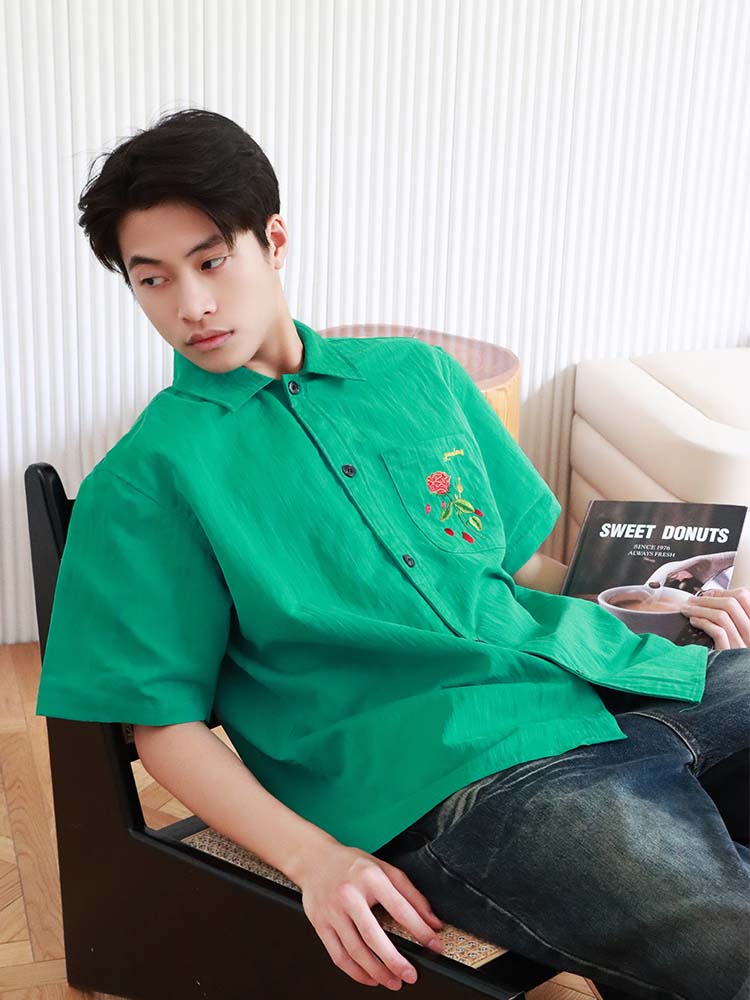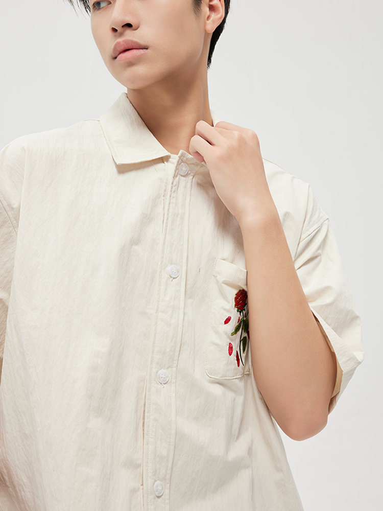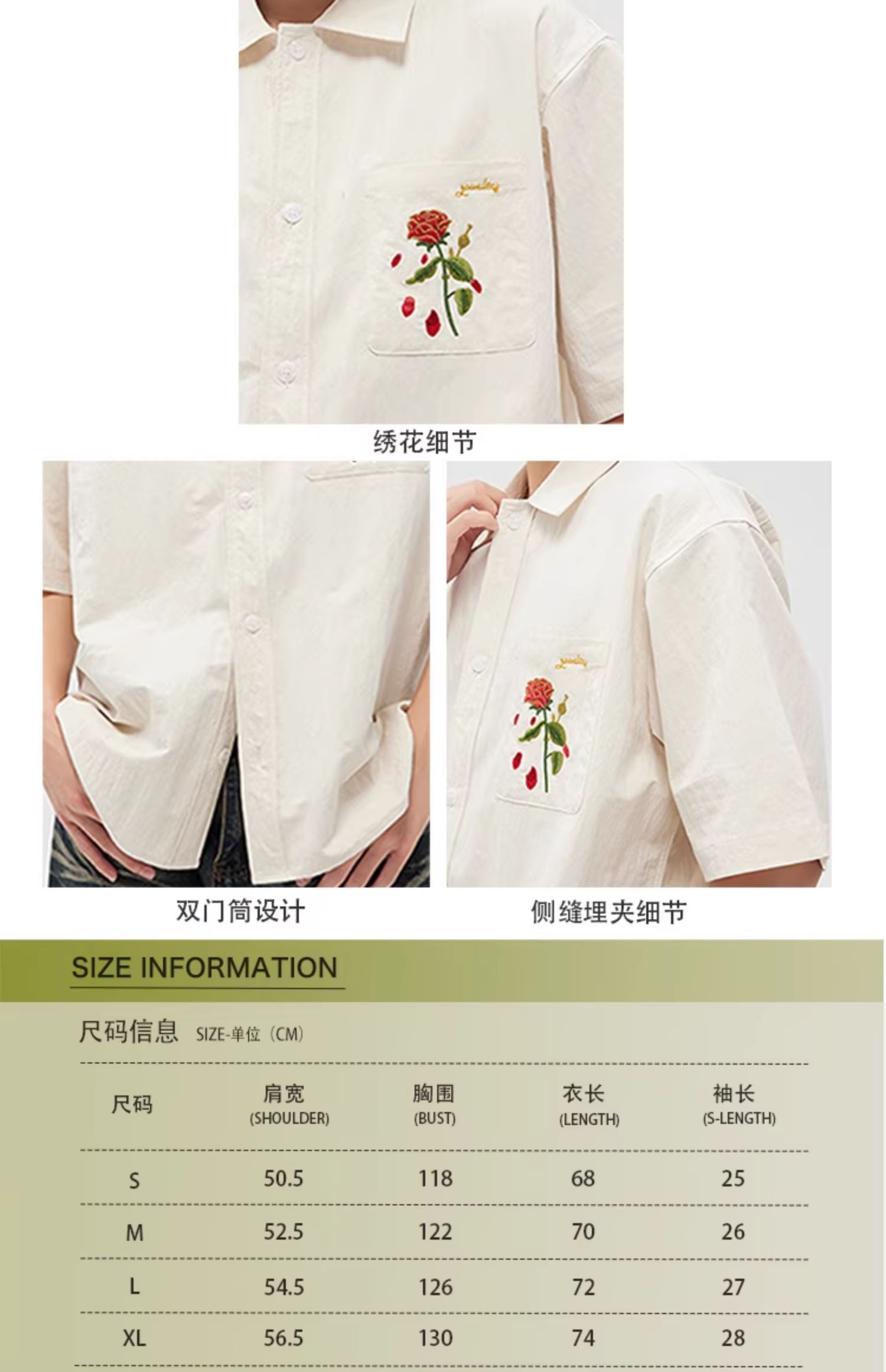 ZOOMLENS原创韩版手绘刺绣玫瑰花朵肌理感短袖宽松男女同款衬衫