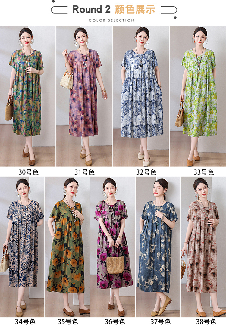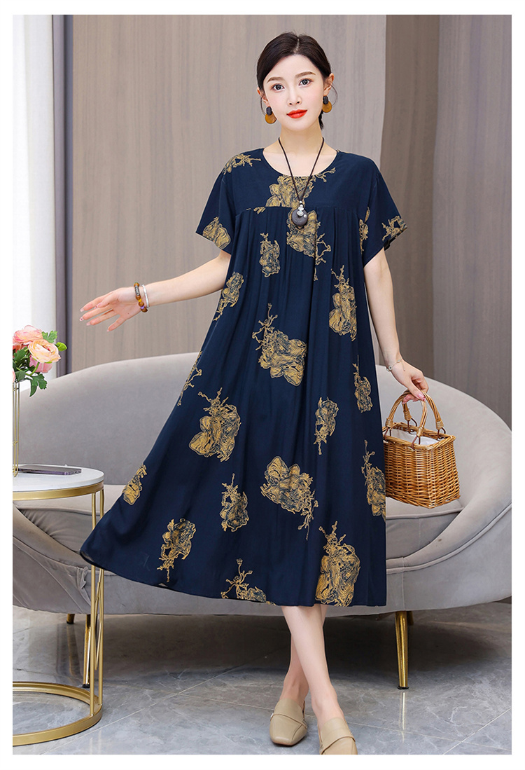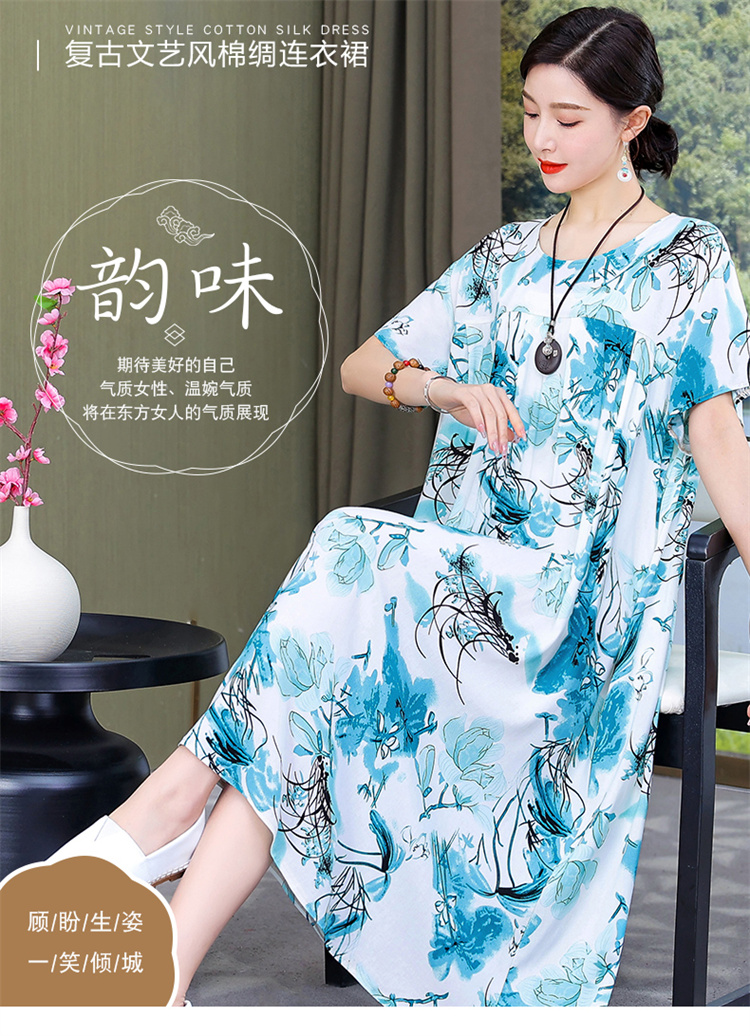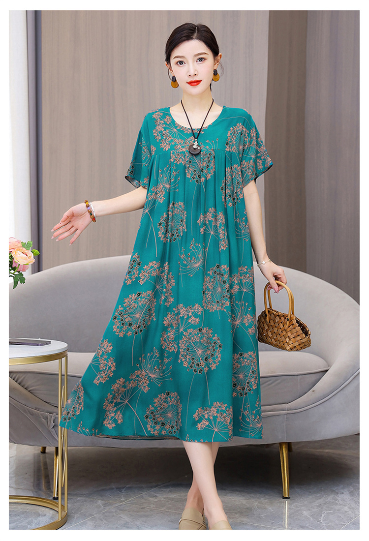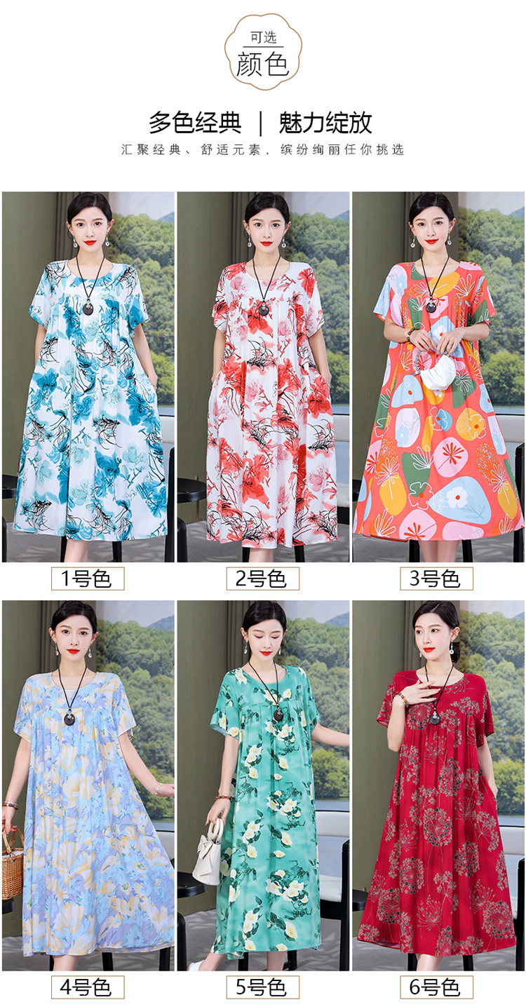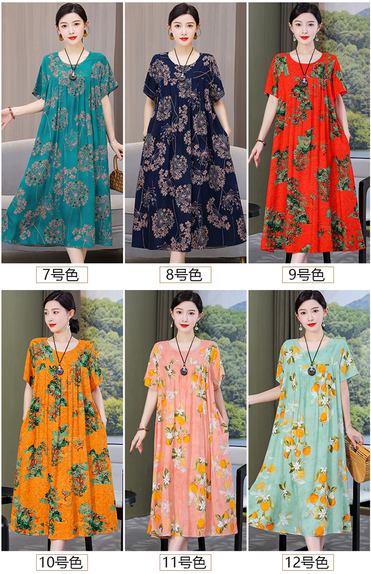 妈妈棉绸连衣裙短袖中老年夏装大码女装加肥加大宽松人造棉裙子女