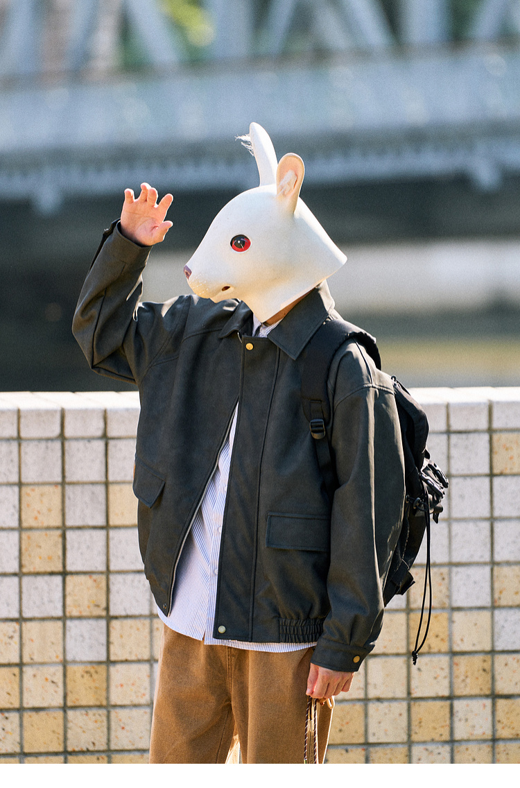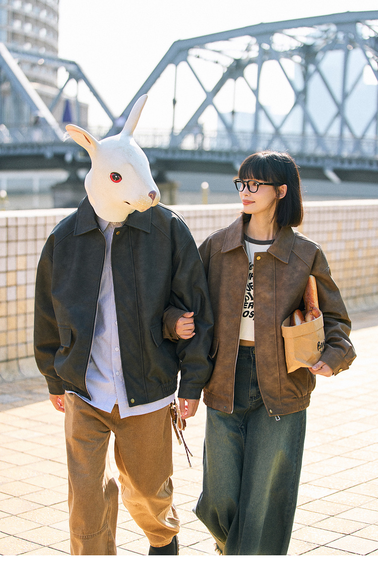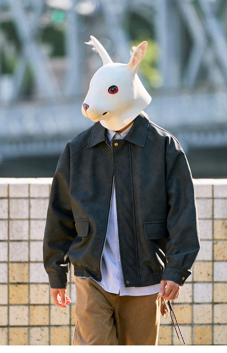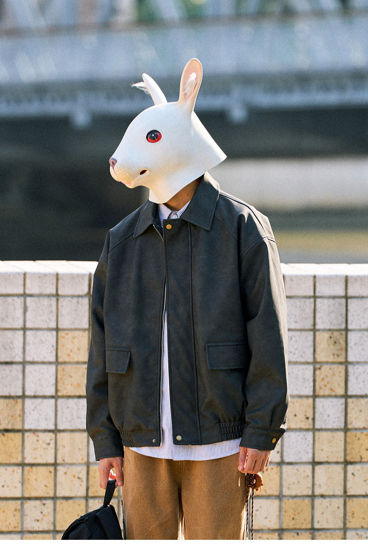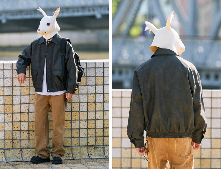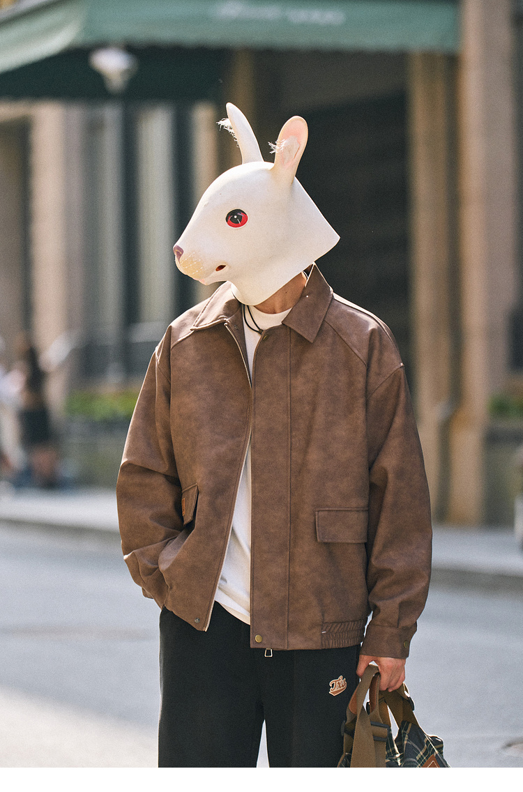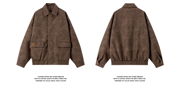 兔先森春秋款日系复古纯色翻领pu皮衣外套男工装皮夹克痞帅机车服