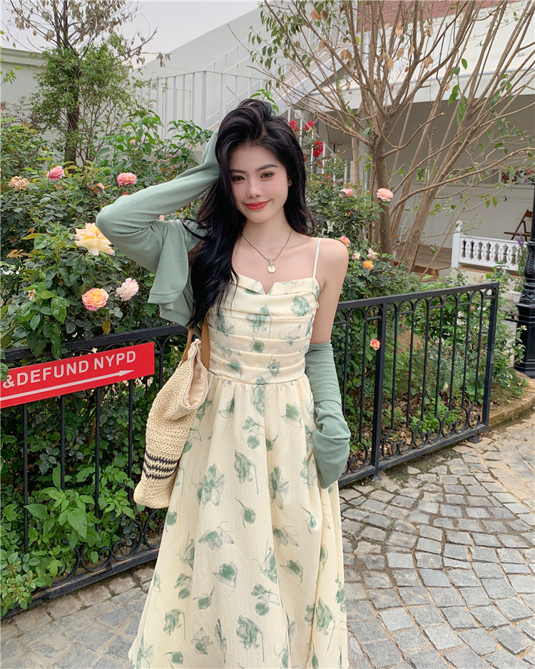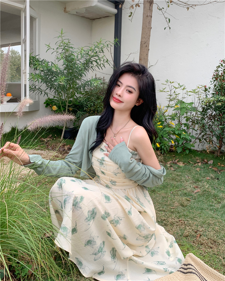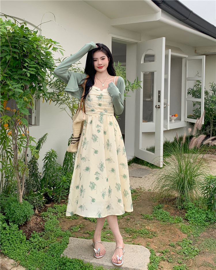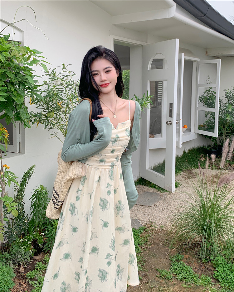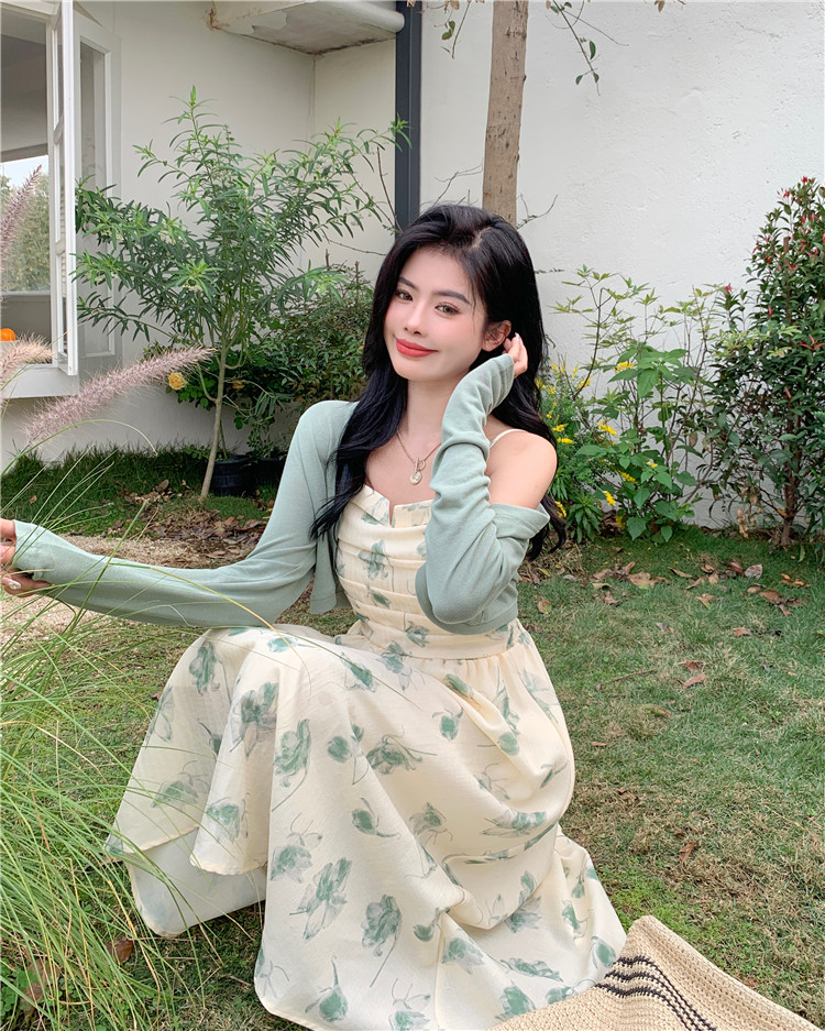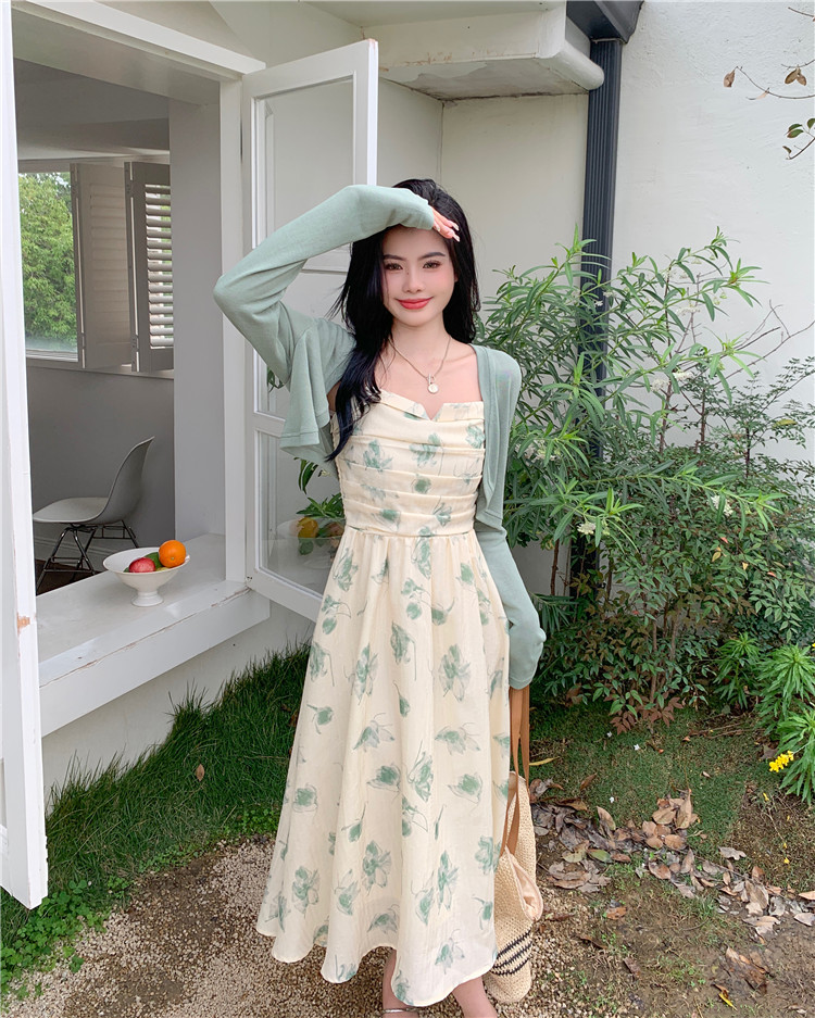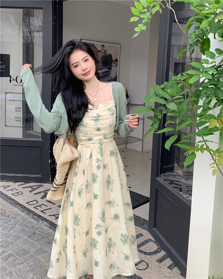 小吉家大码女装高级感绿色碎花吊带连衣裙长袖防晒开衫显瘦两件套