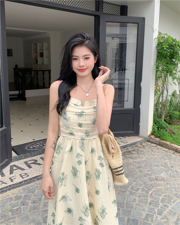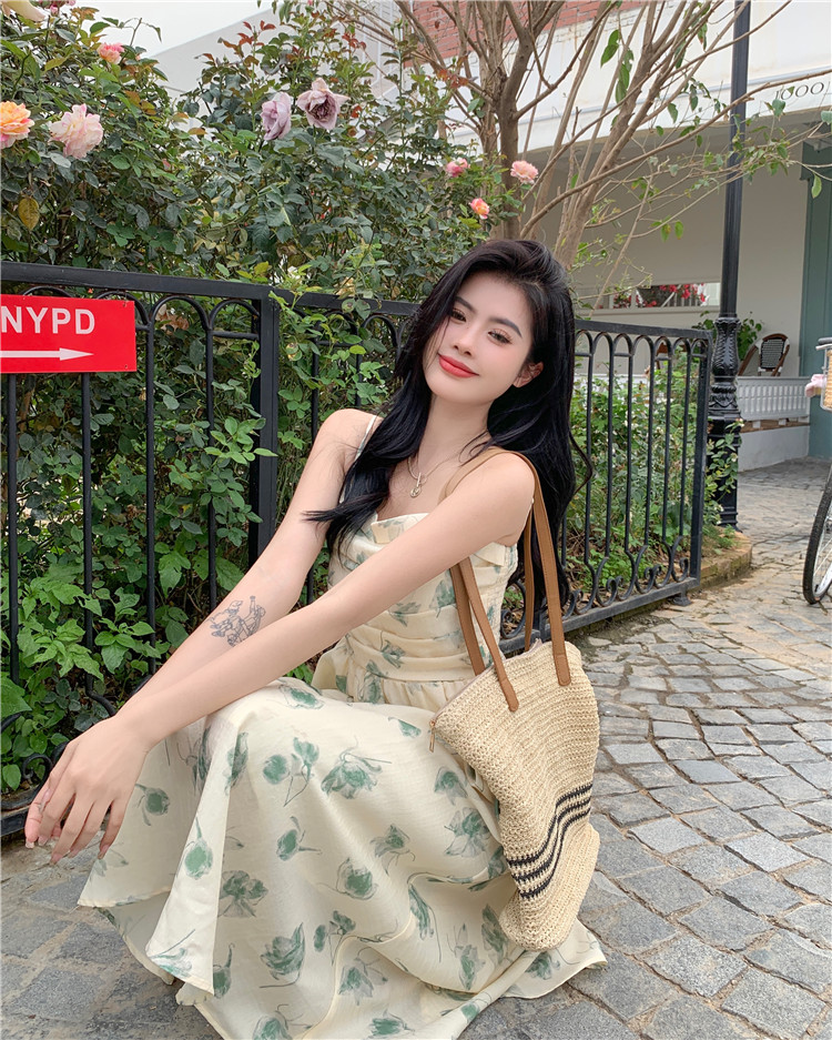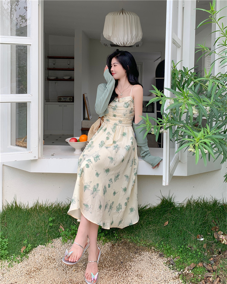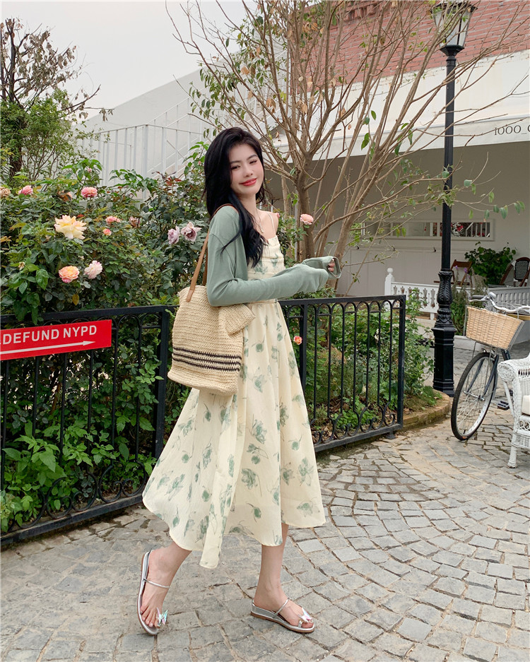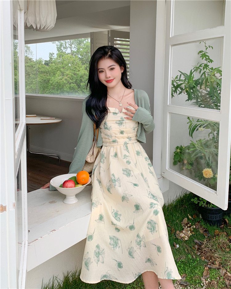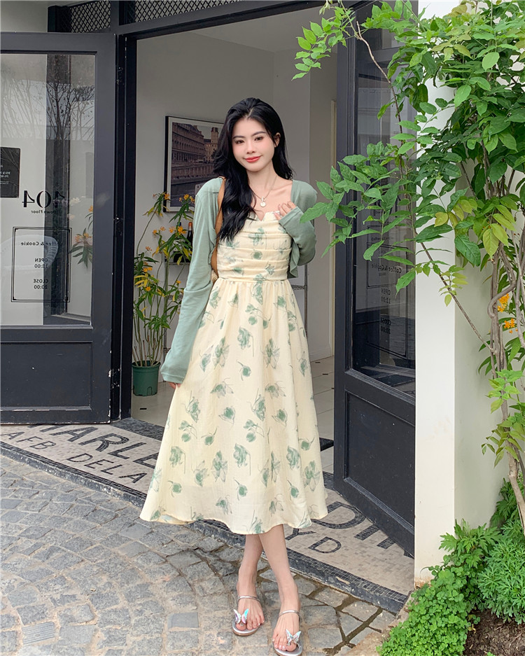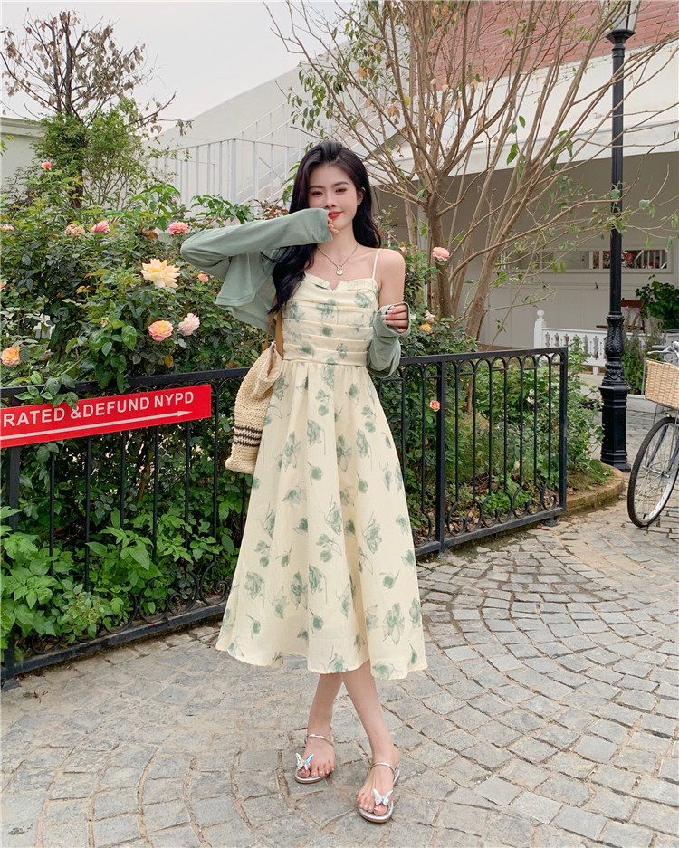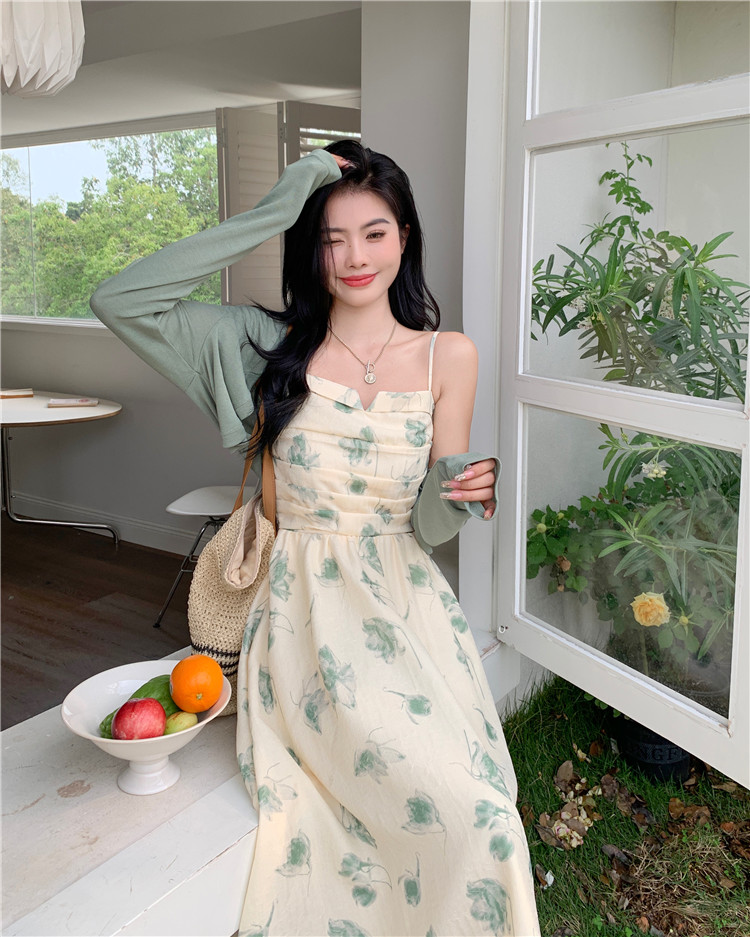 小吉家大码女装高级感绿色碎花吊带连衣裙长袖防晒开衫显瘦两件套