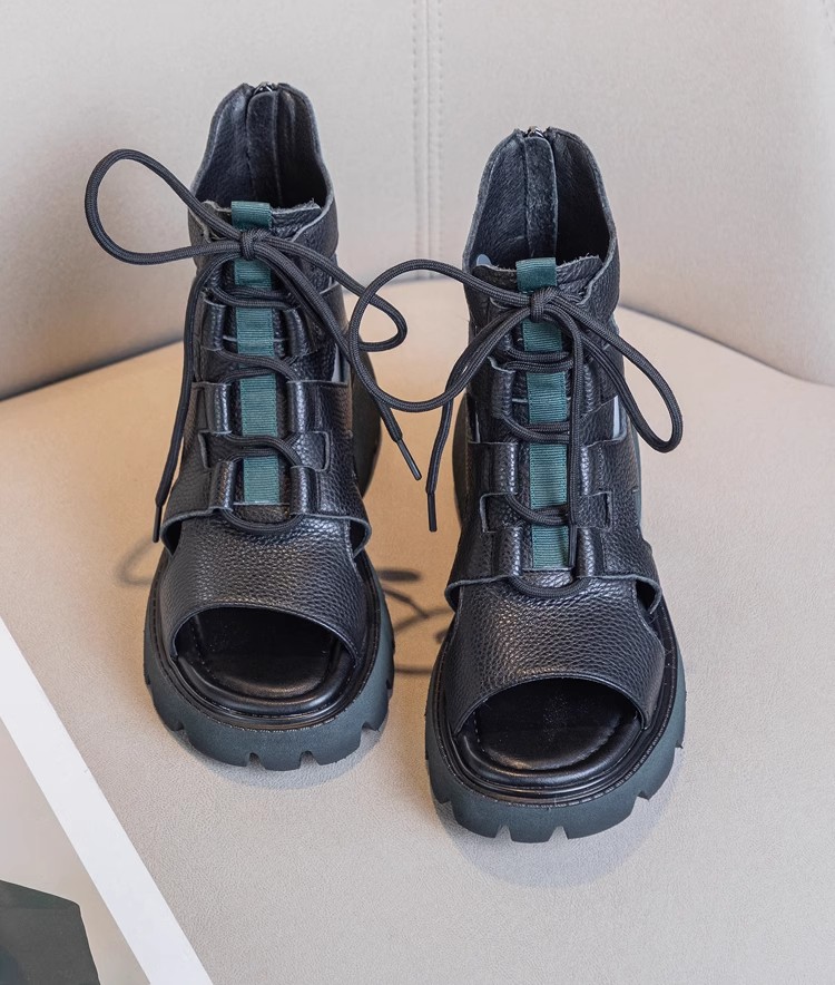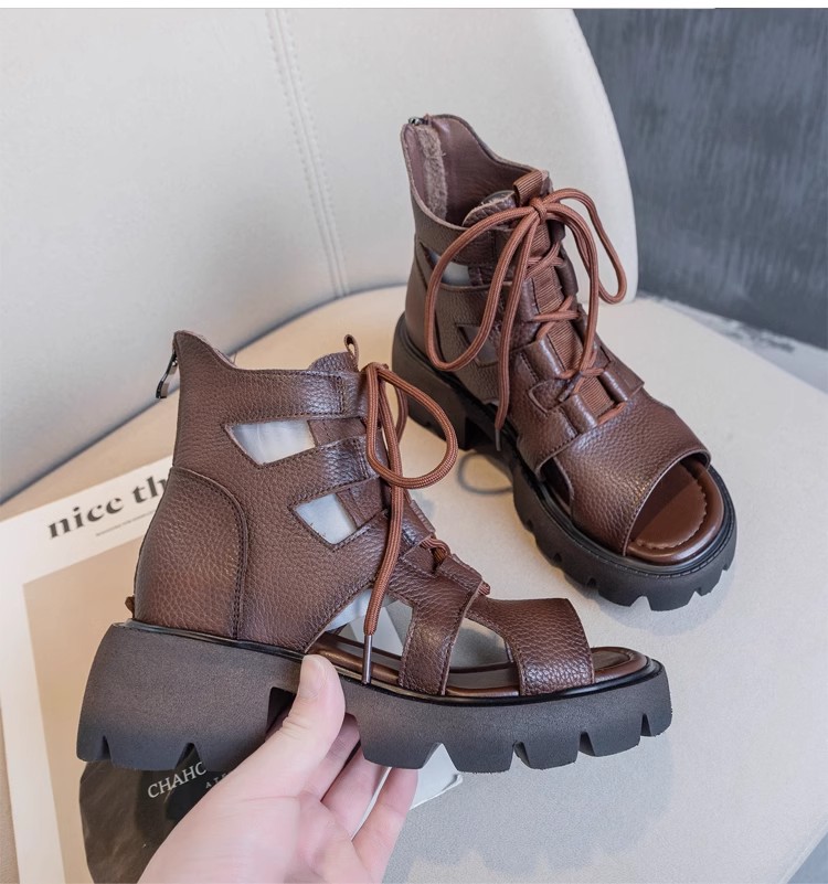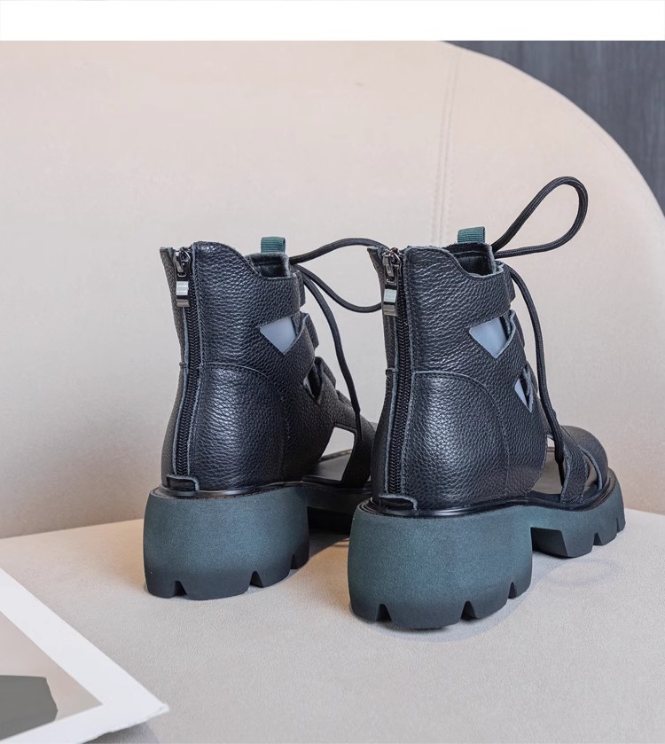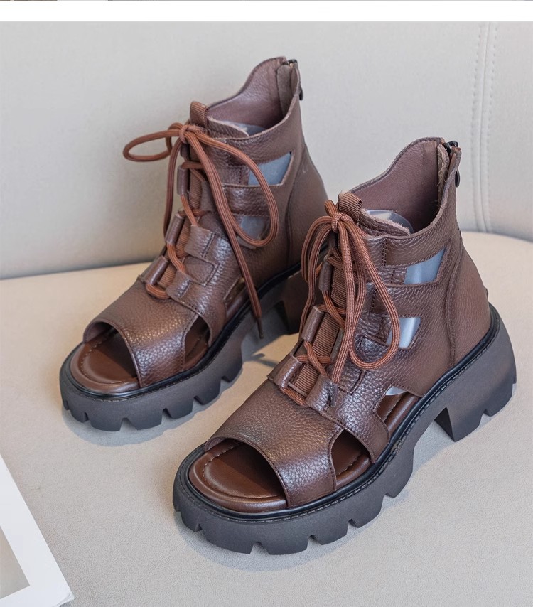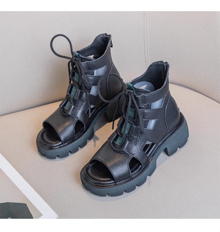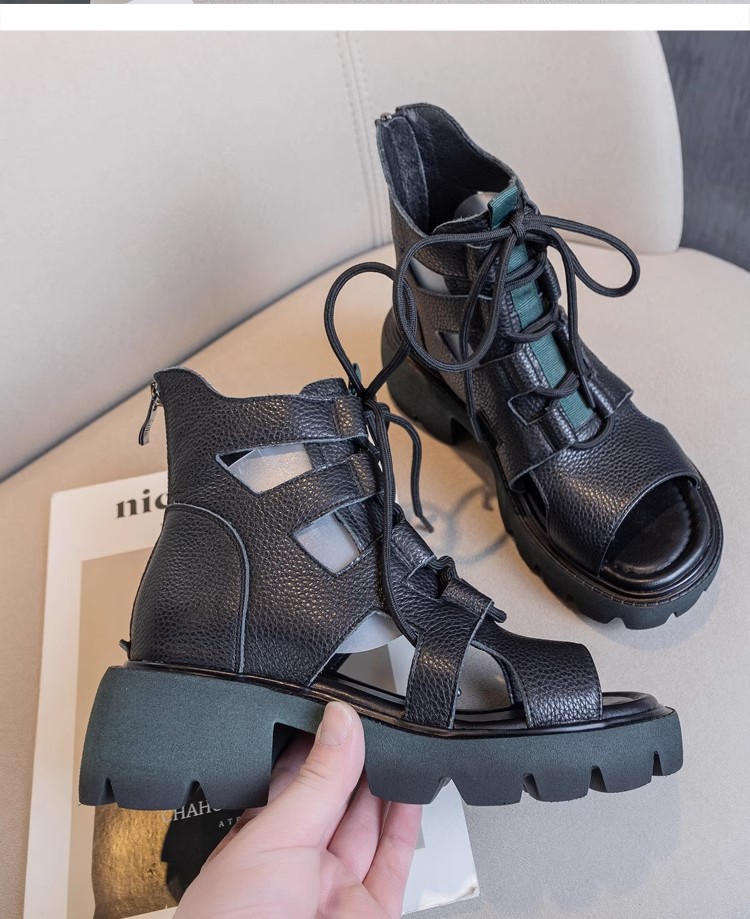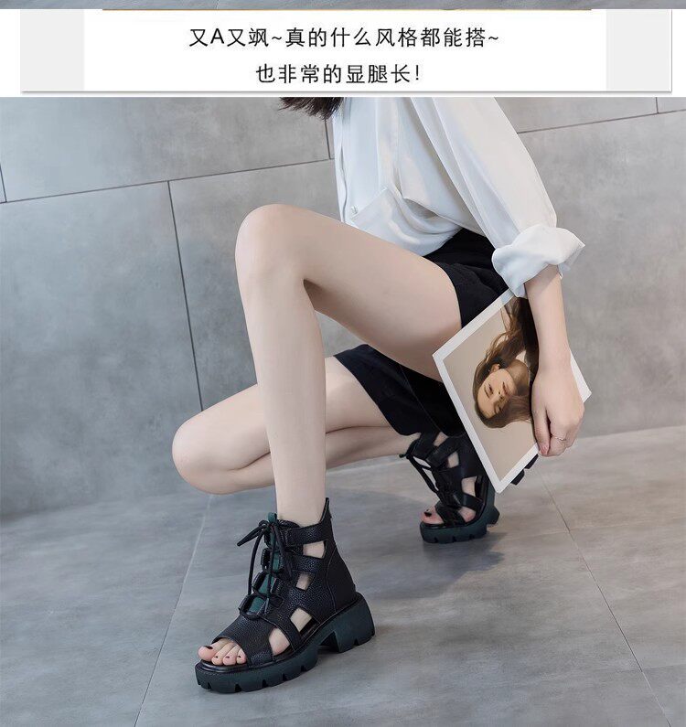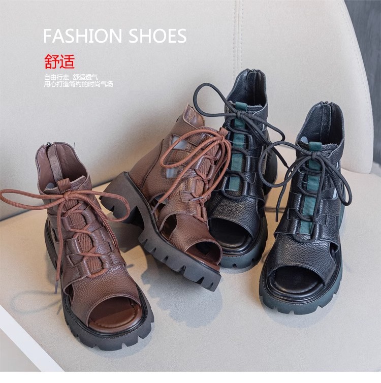凉鞋真皮女高跟2025夏季新款粗跟增高鱼嘴镂空露趾软高帮罗马凉鞋