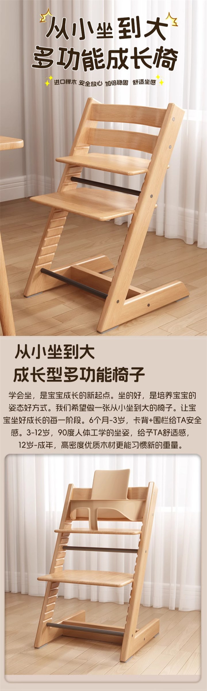 实木成长椅儿童椅宝宝餐椅多功能可升降家用便携式儿童吃饭座椅