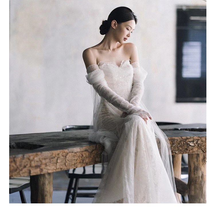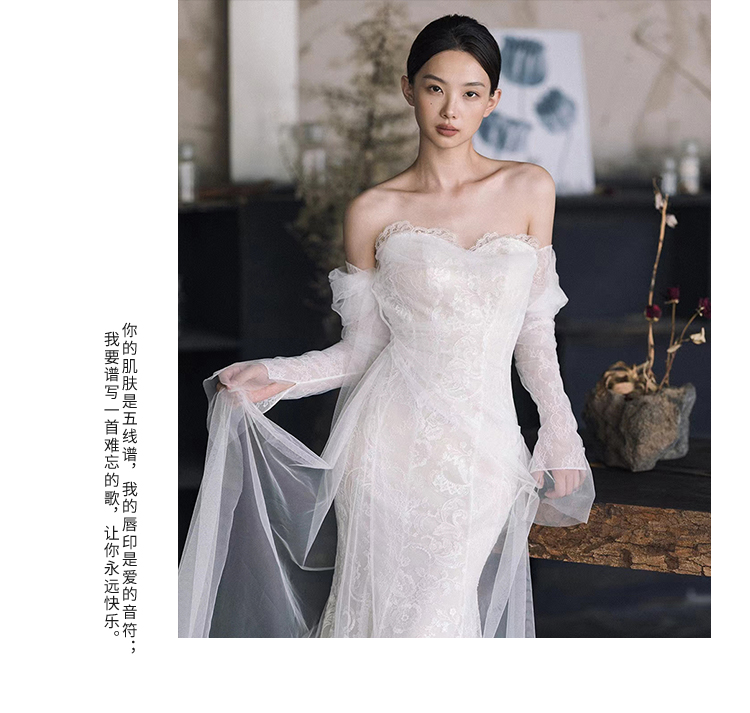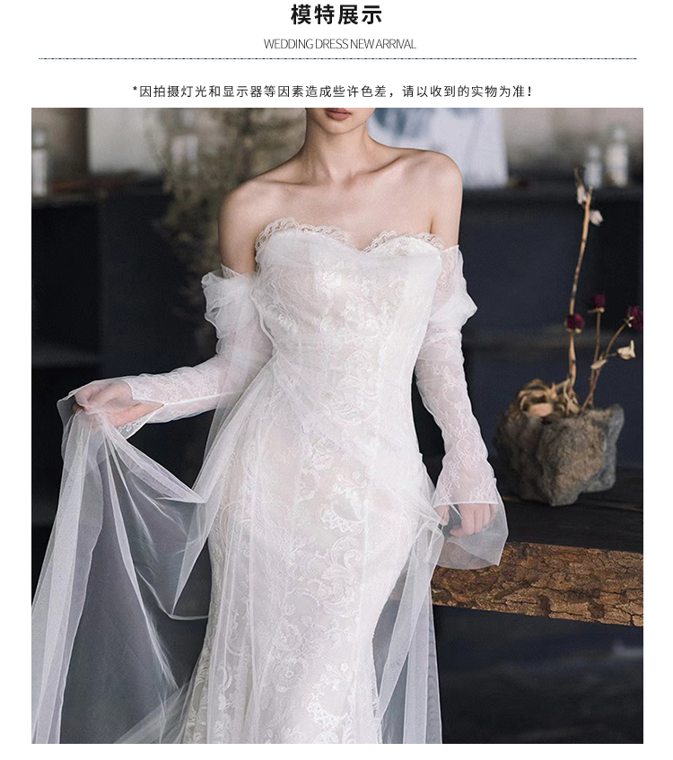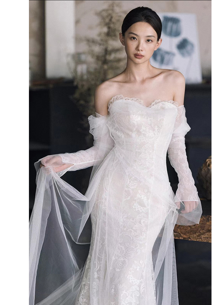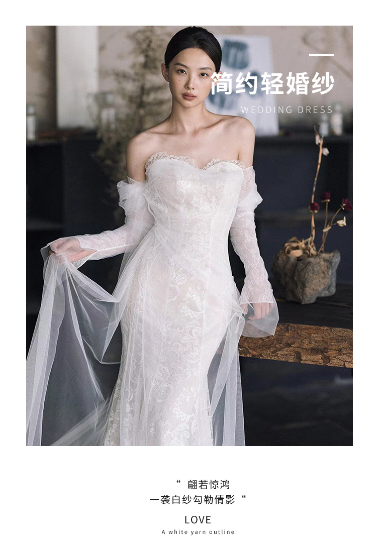 一字肩轻婚纱蕾丝法式鱼尾主婚纱高级感新娘新款结婚迎宾出门纱
