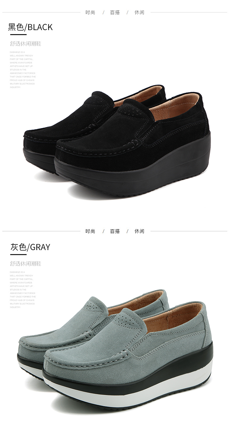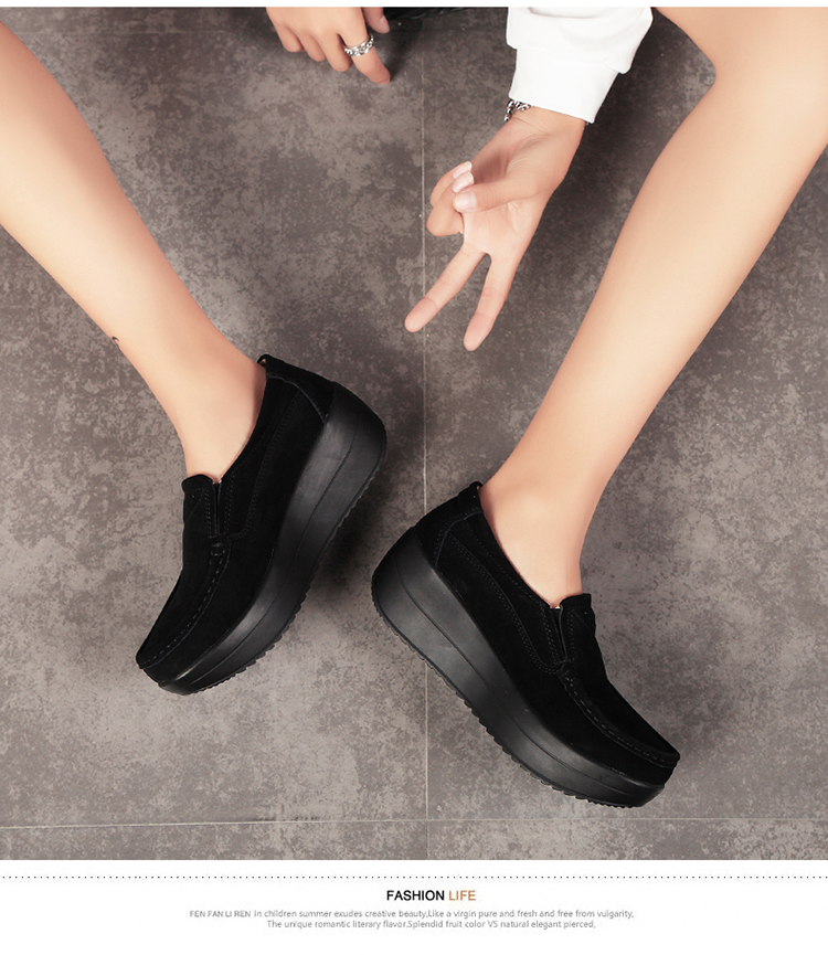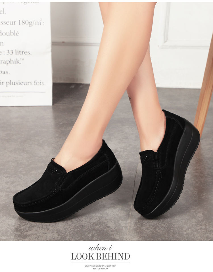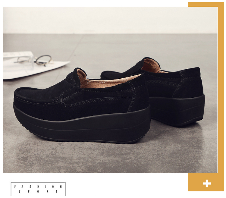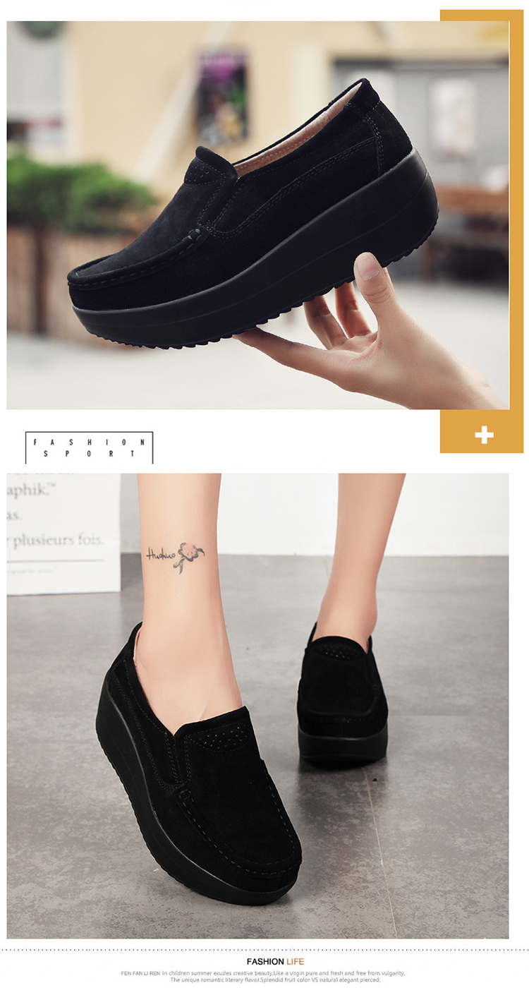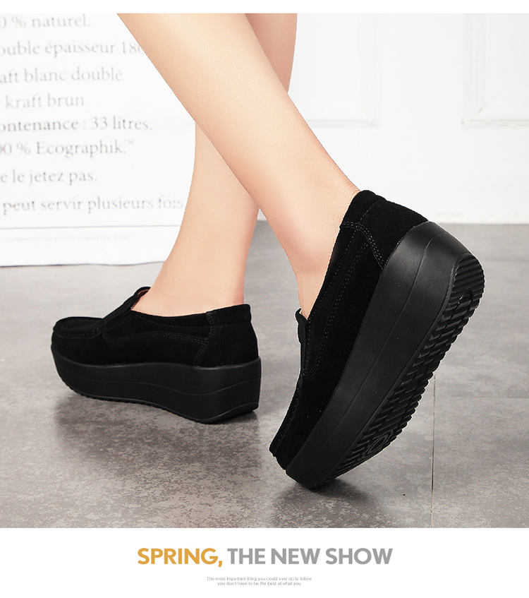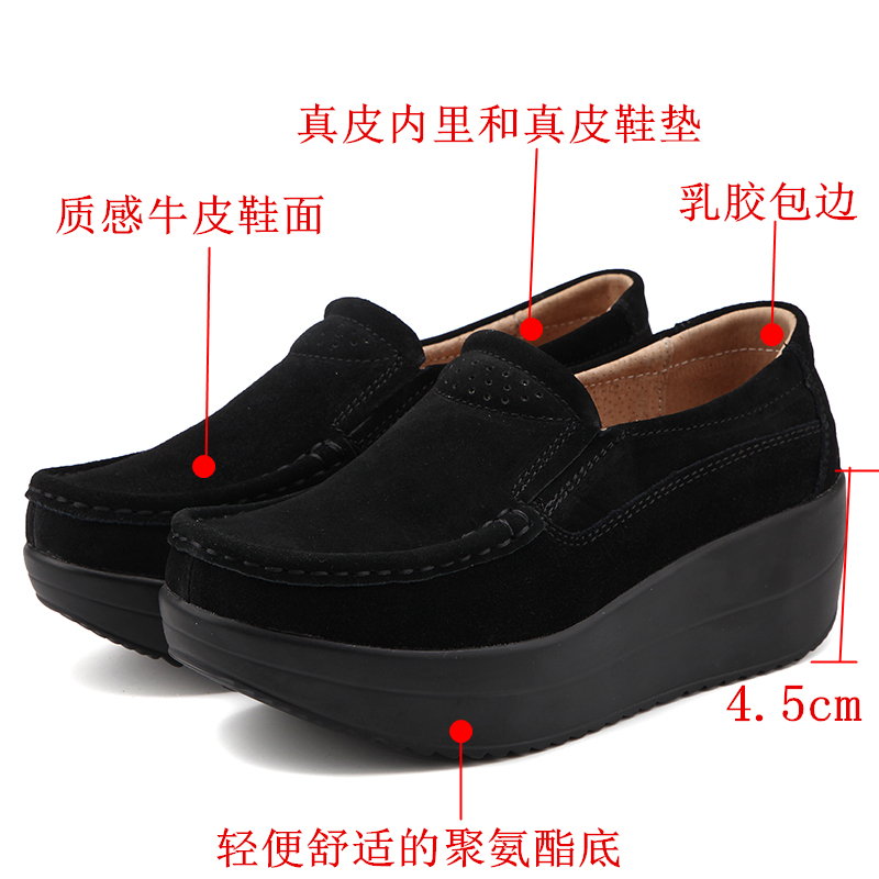 真皮休闲摇摇坡跟一脚蹬工作鞋女黑色职业女单鞋妈妈软底舒适春秋