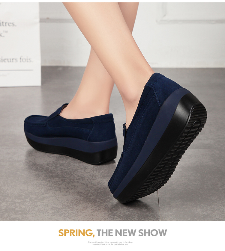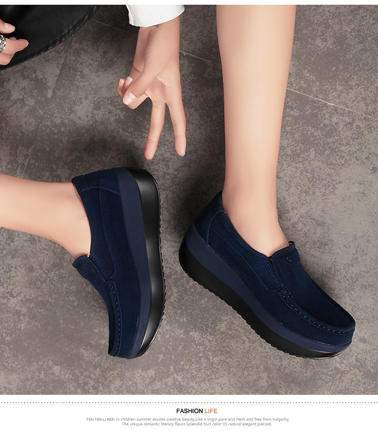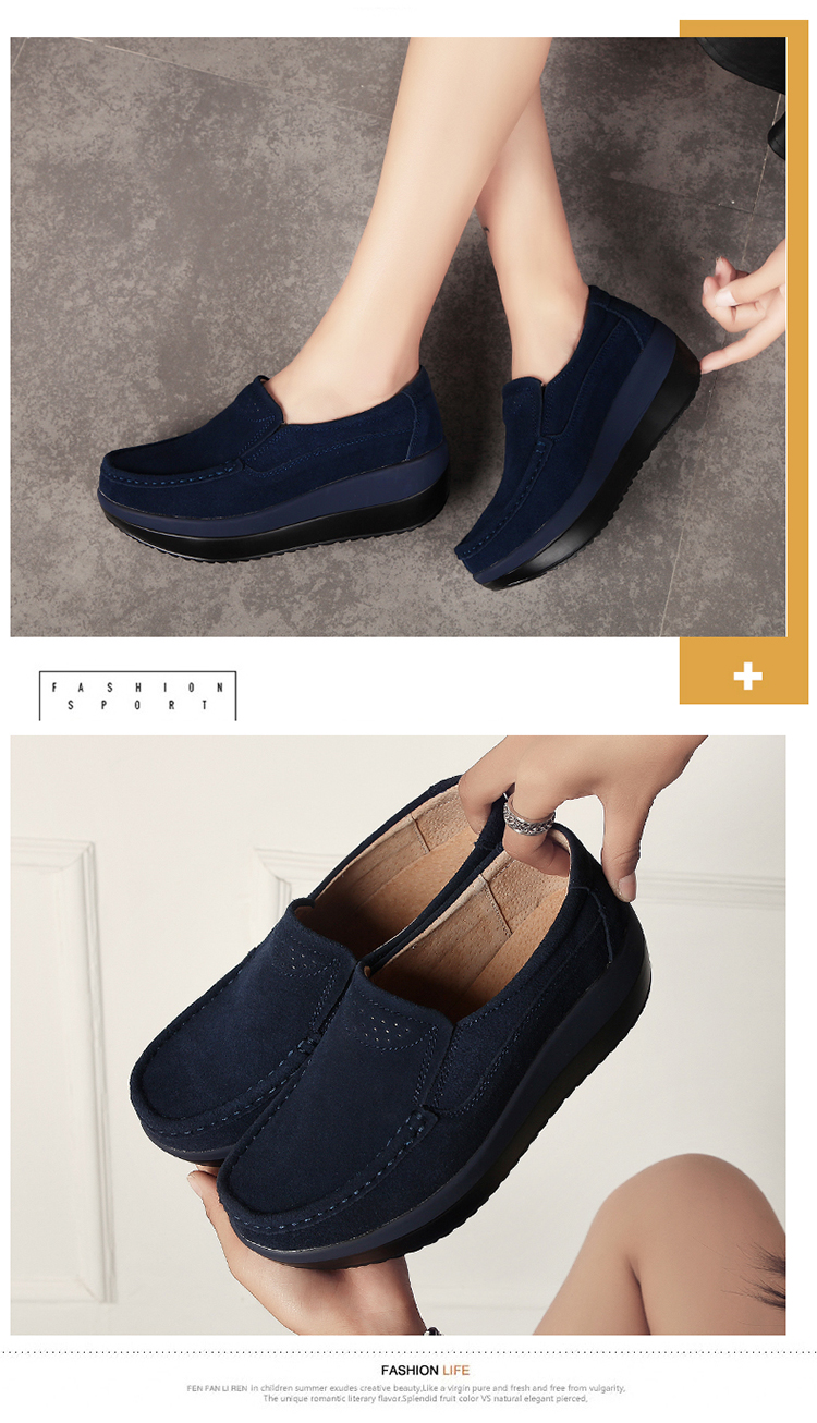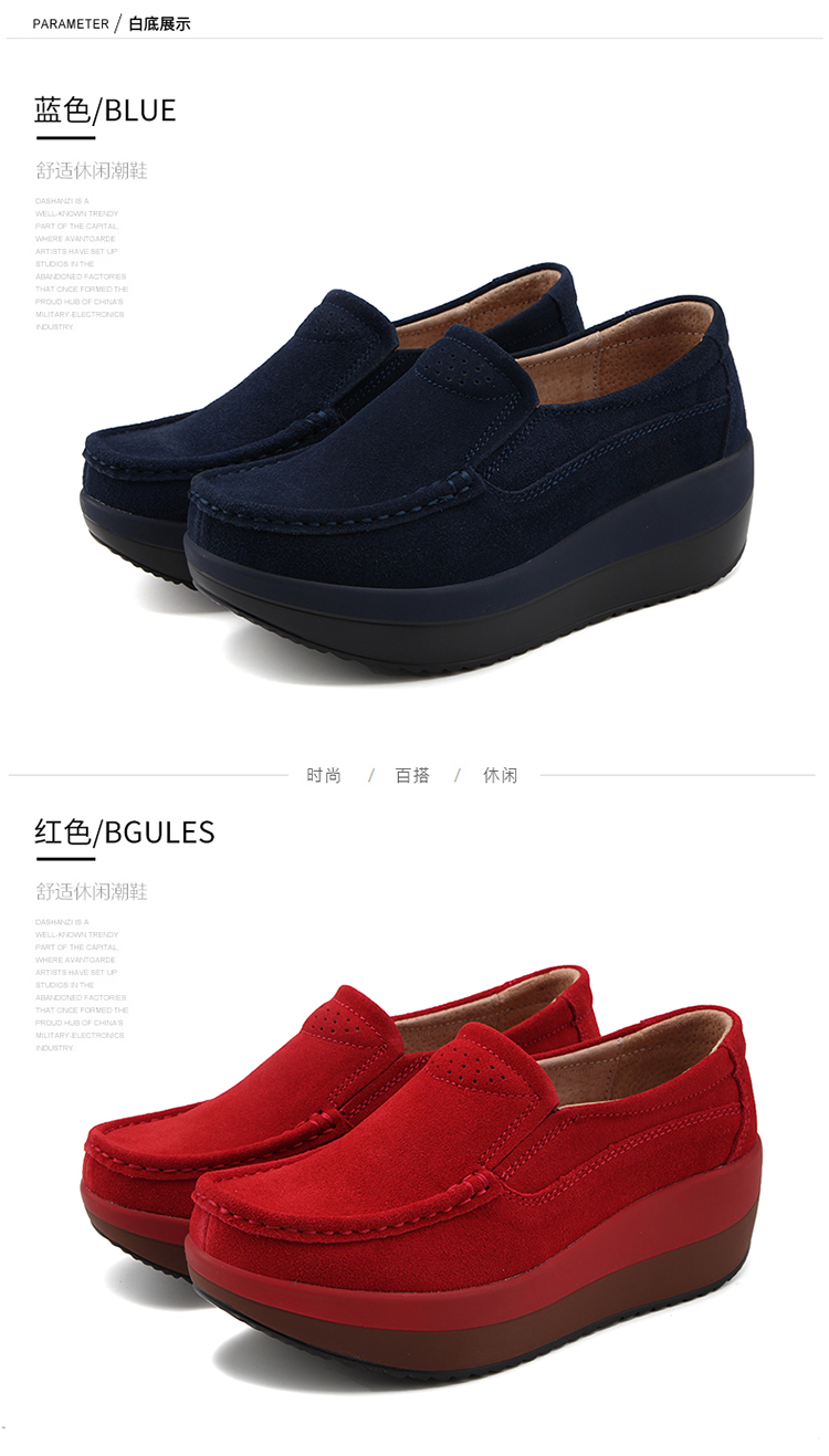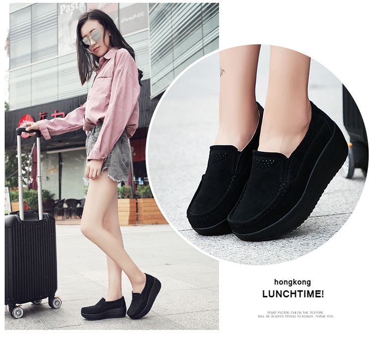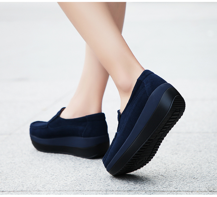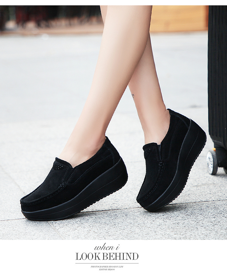 真皮休闲摇摇坡跟一脚蹬工作鞋女黑色职业女单鞋妈妈软底舒适春秋