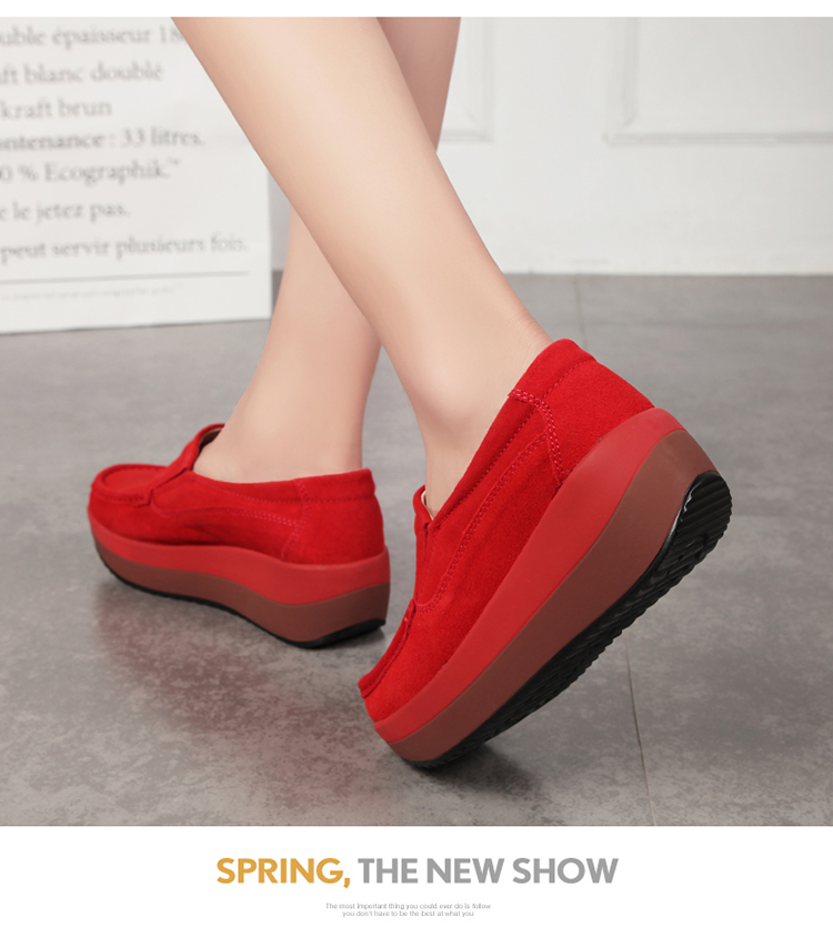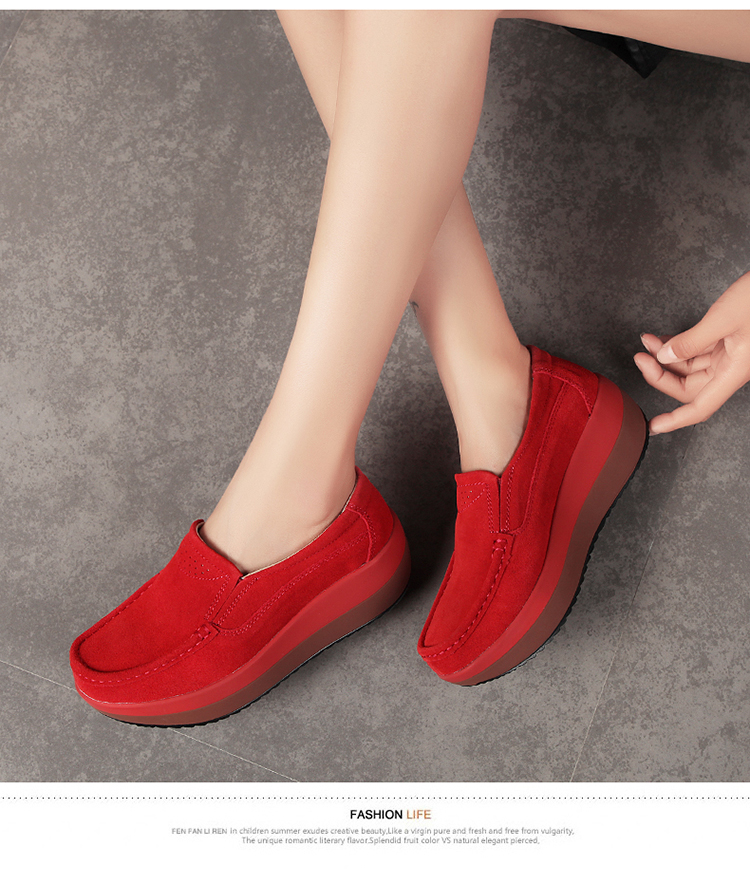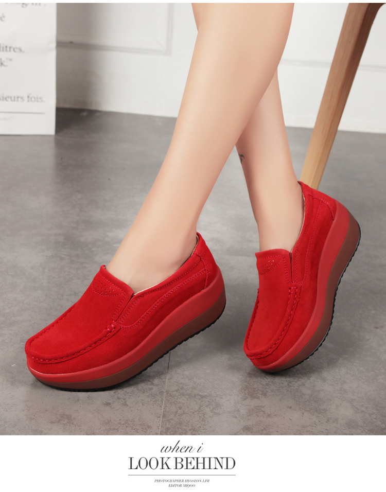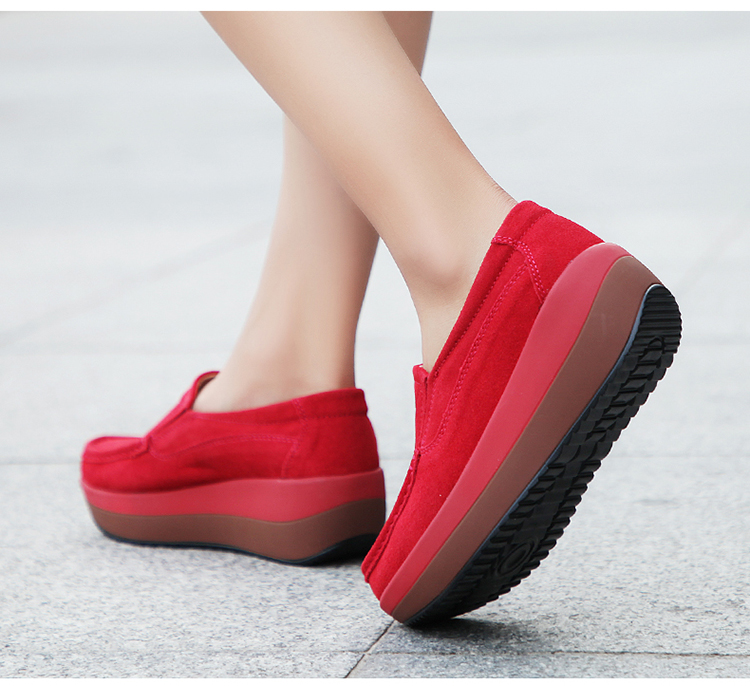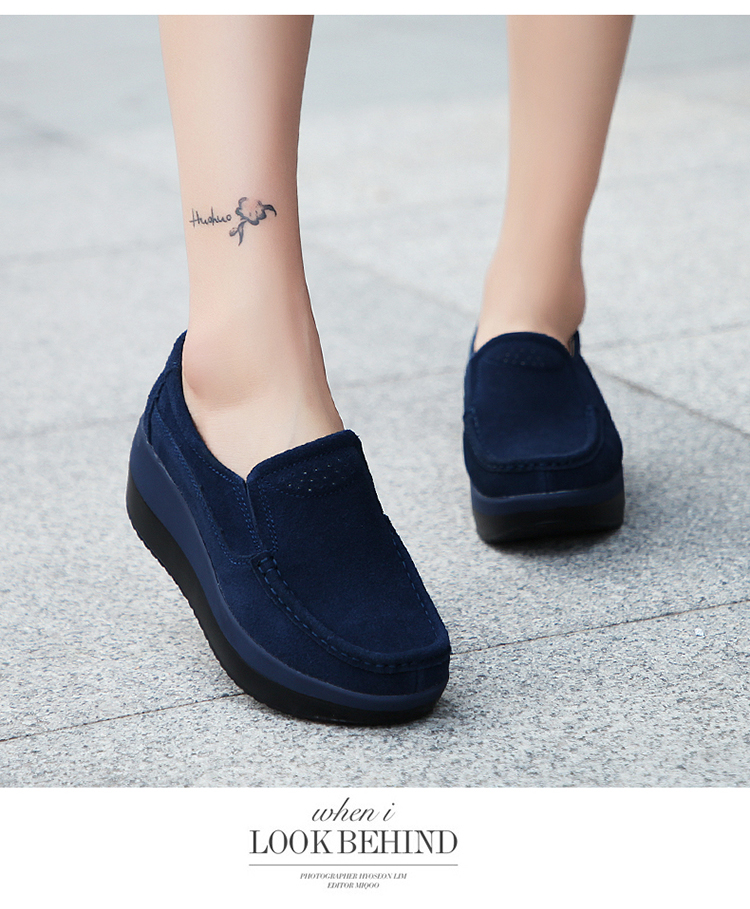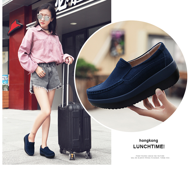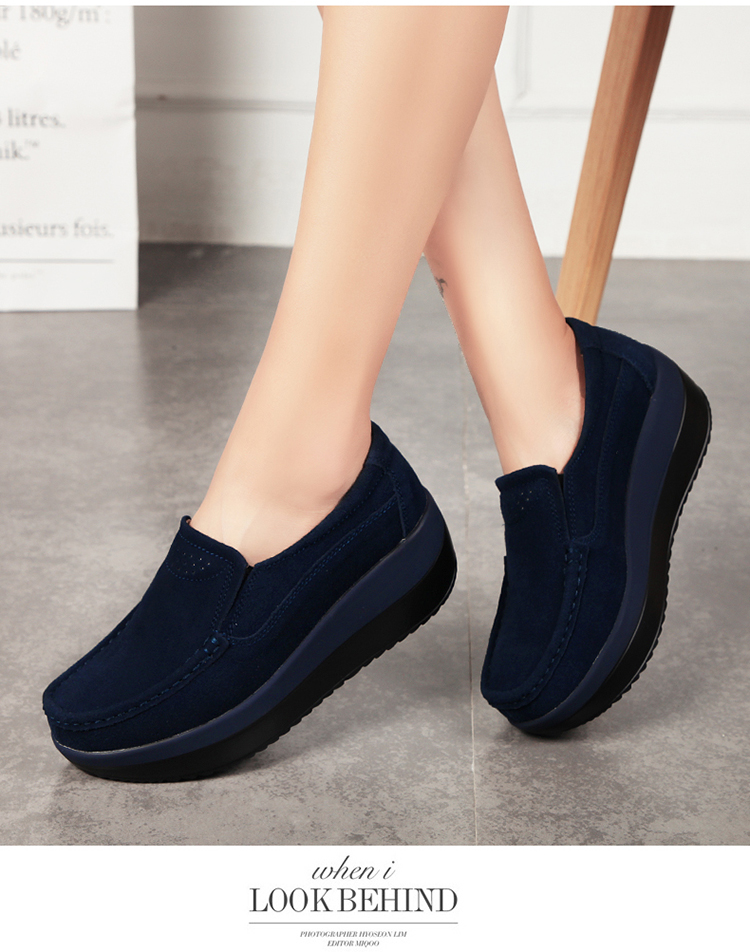 真皮休闲摇摇坡跟一脚蹬工作鞋女黑色职业女单鞋妈妈软底舒适春秋