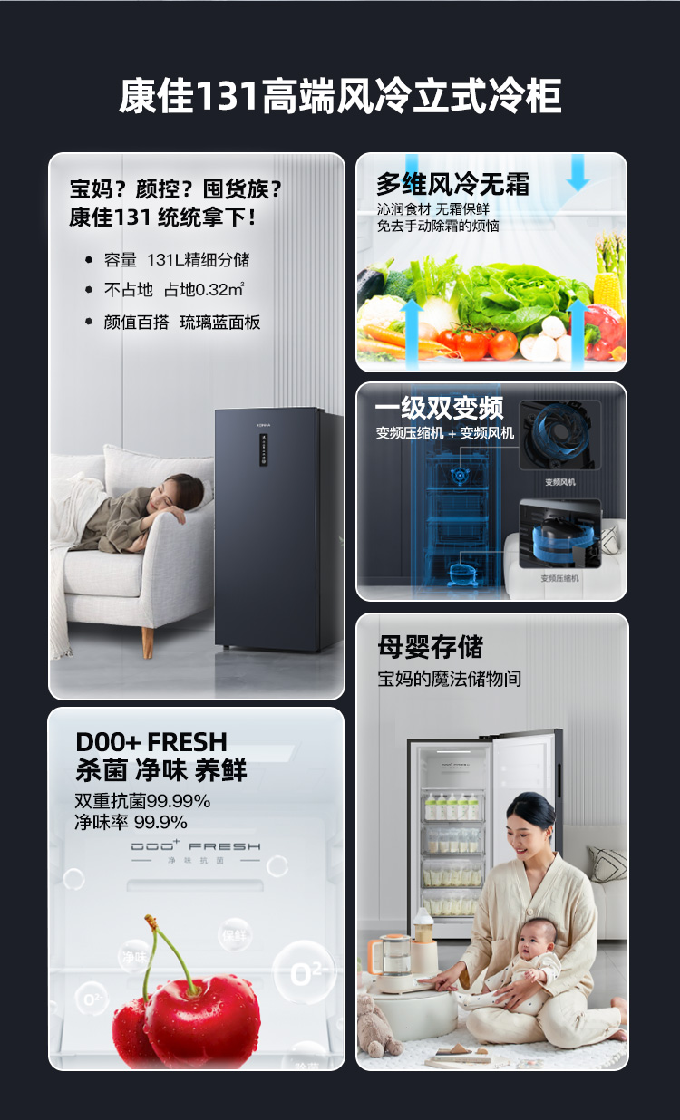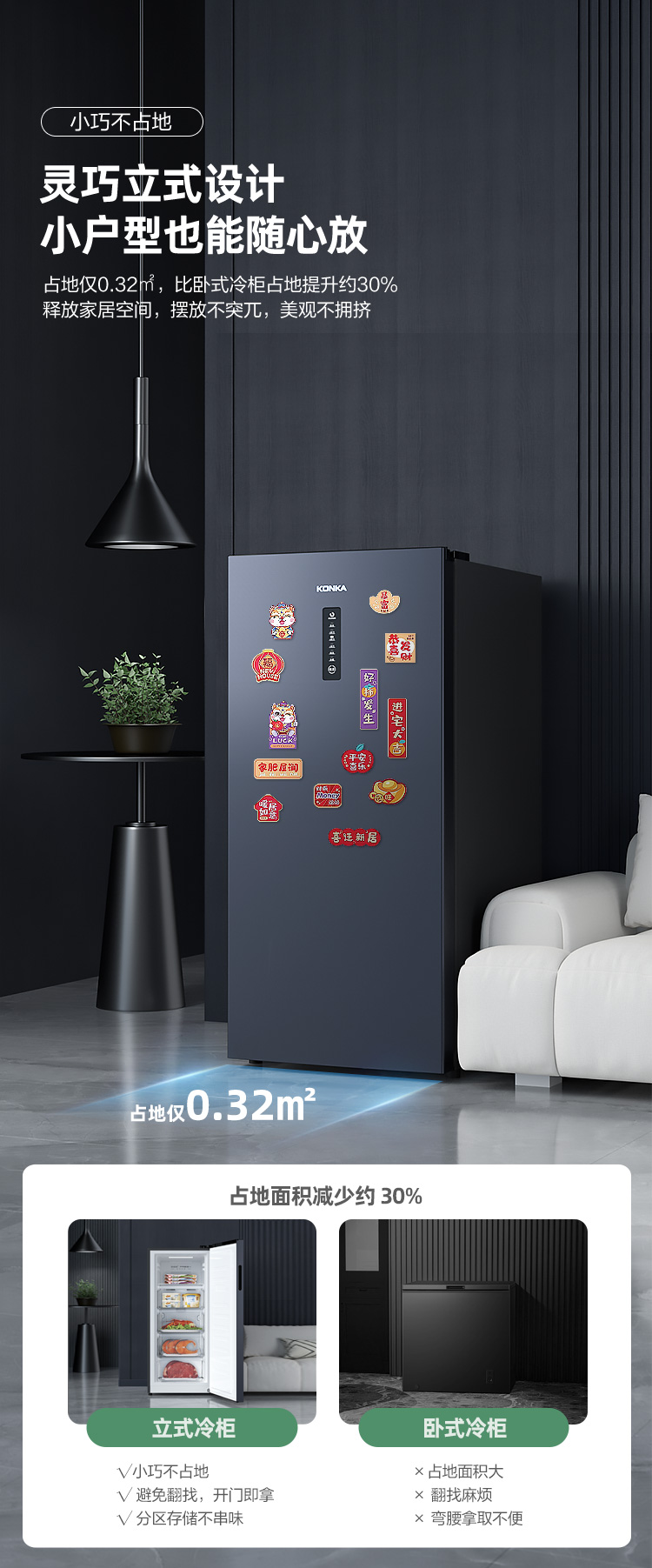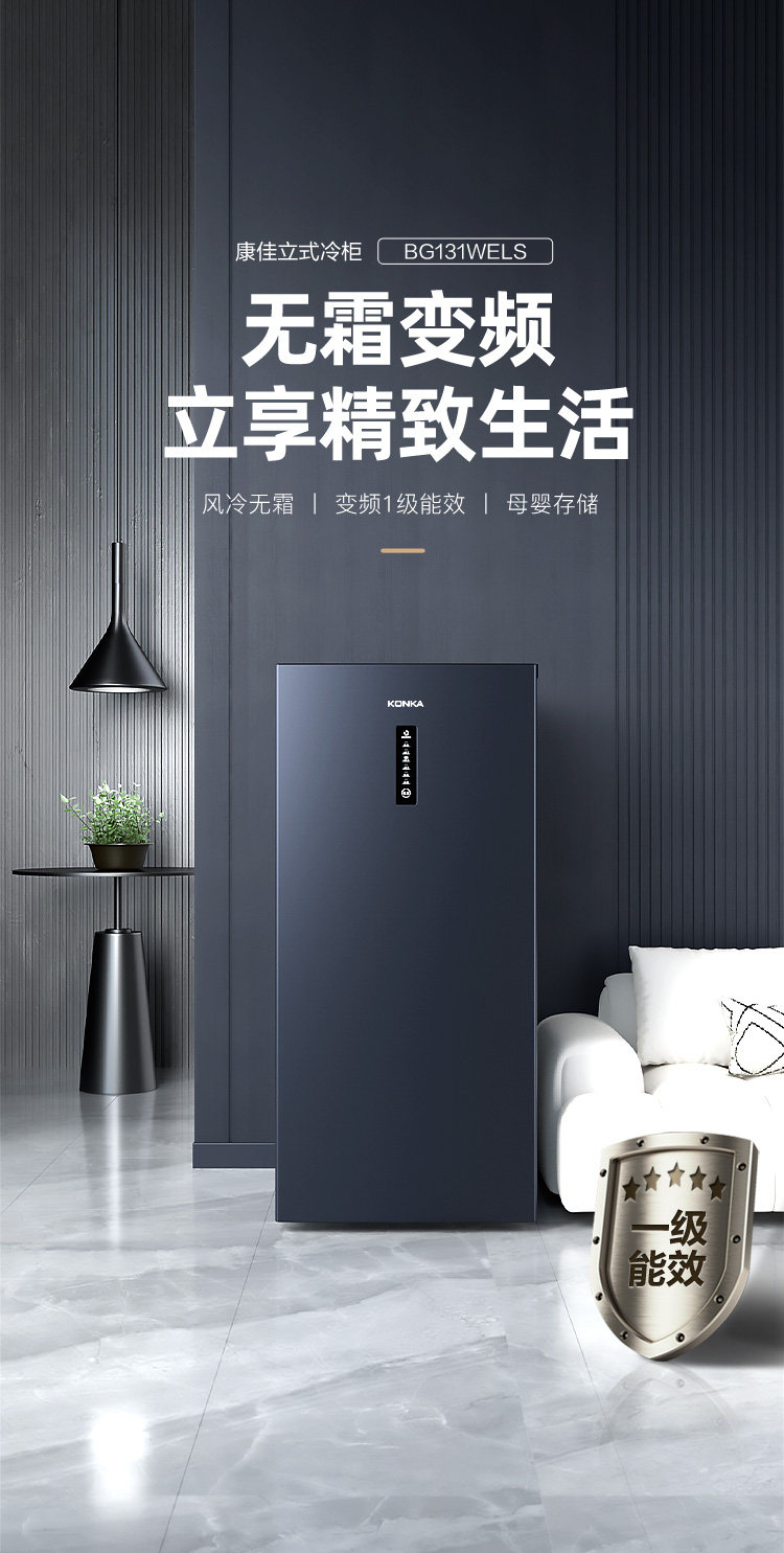 康佳131升立式冷柜家用节能冷藏冷冻保鲜母婴抑菌除味风冷变频