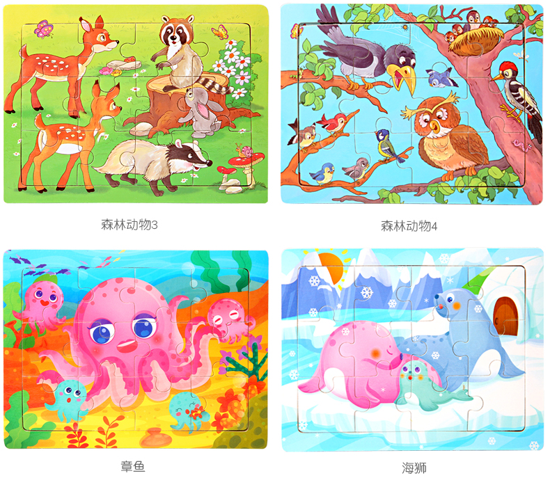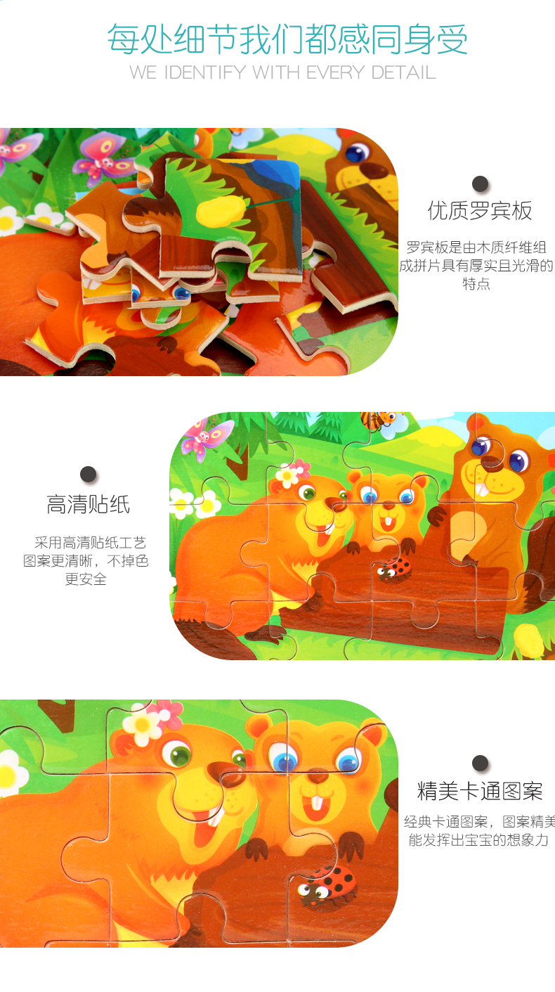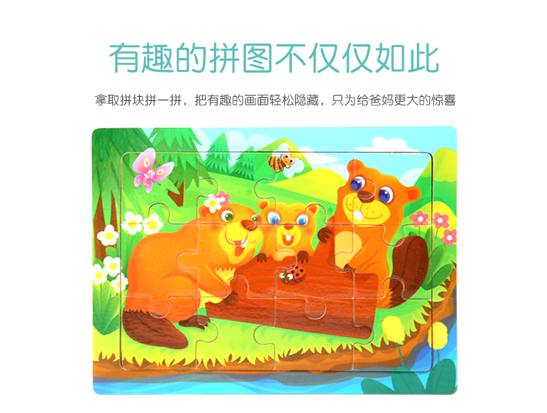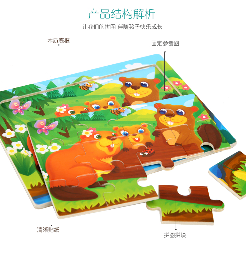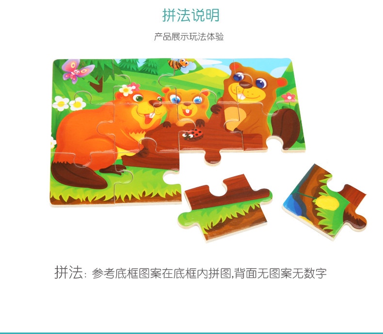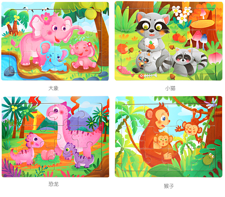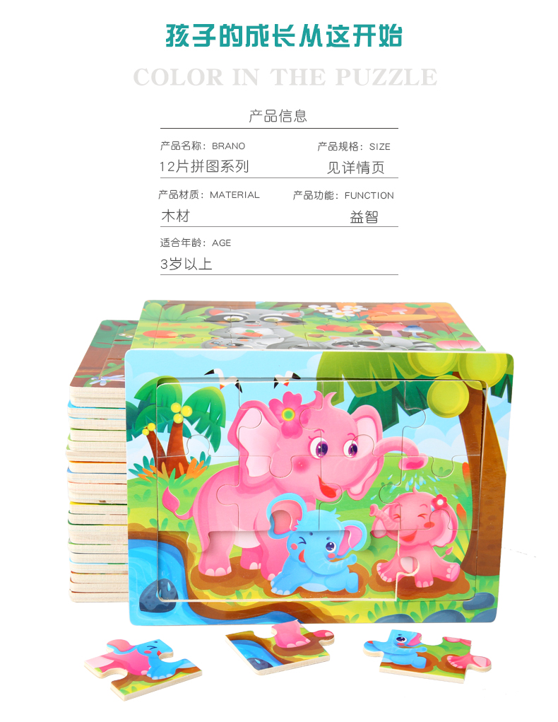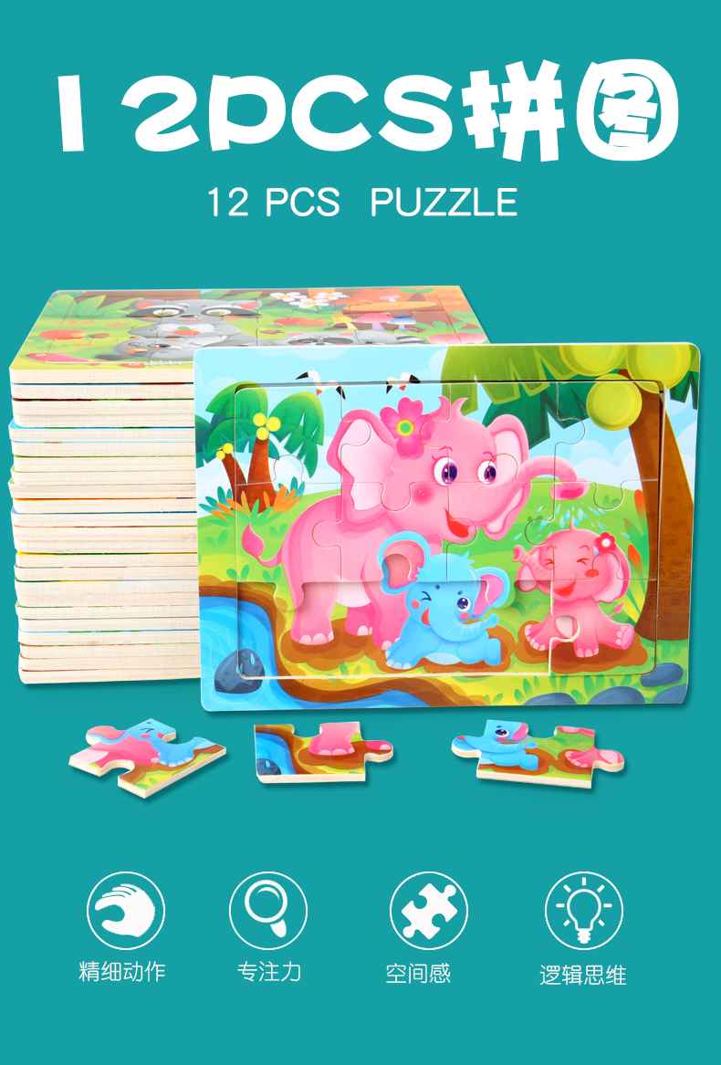 幼儿童拼图12片早教益智2-4岁3宝宝男女智力开发卡通动物木制拼板