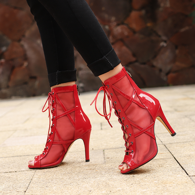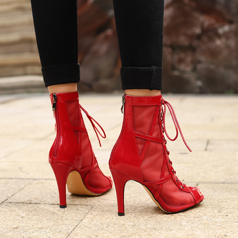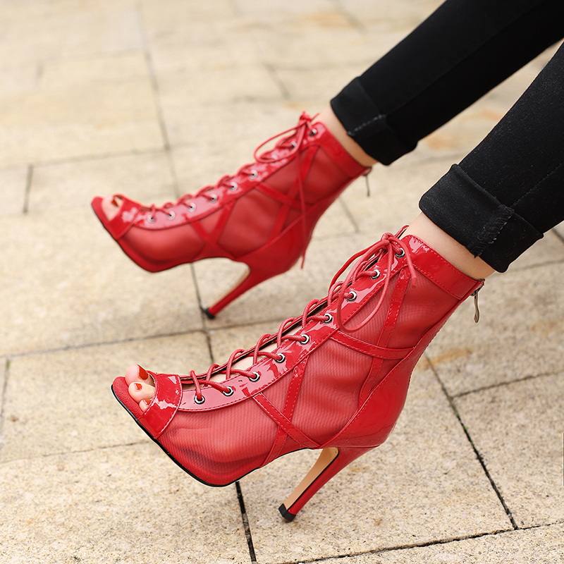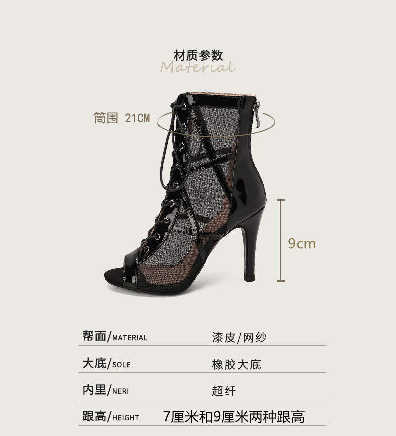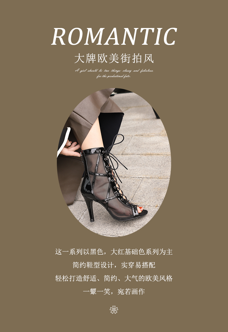 网纱凉靴女细跟鱼嘴凉鞋夏季镂空短靴系带爵士跳舞蹈高跟网靴大码