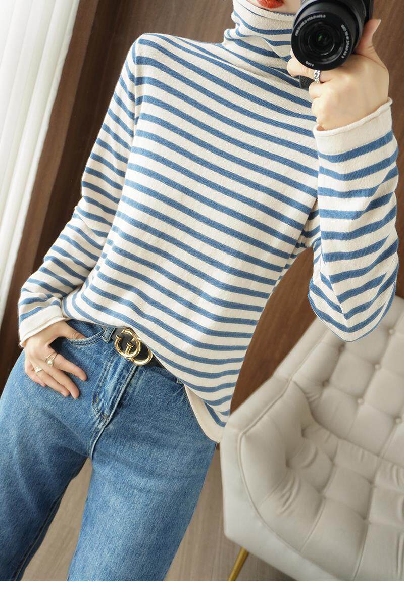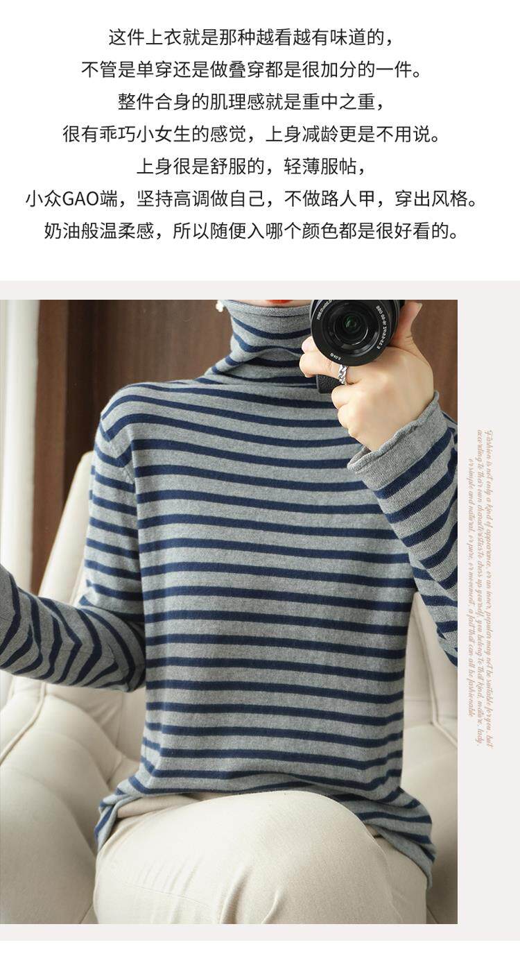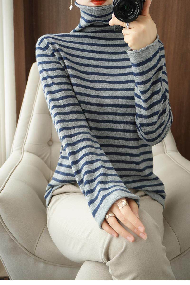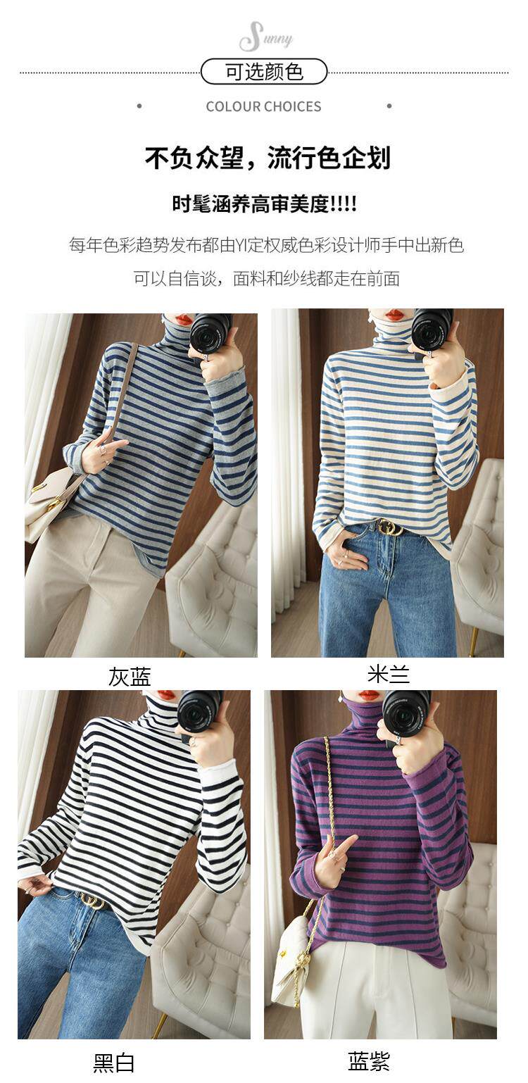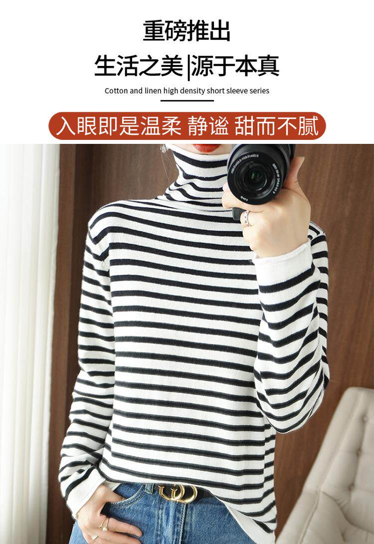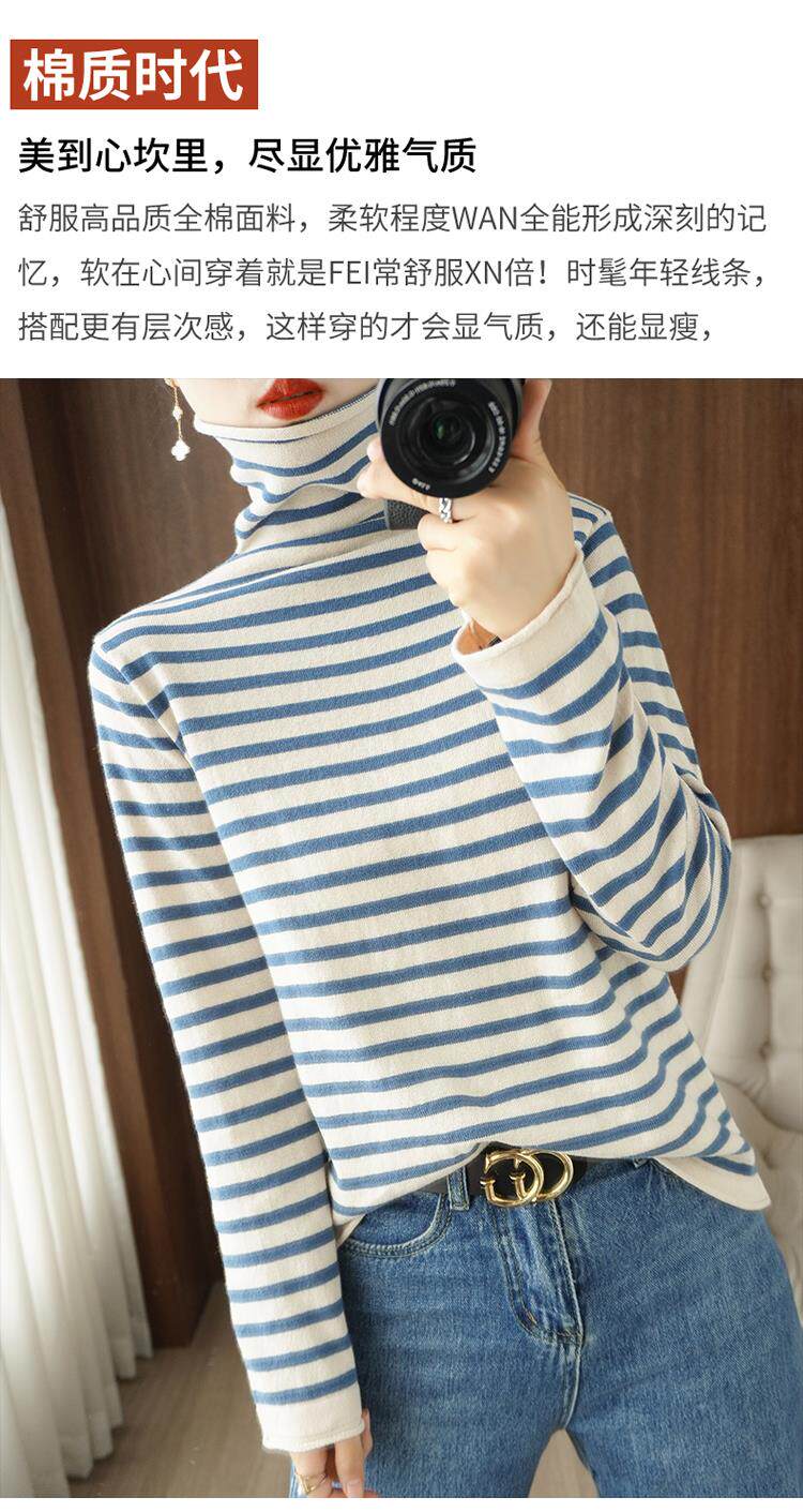 100%纯棉上衣堆堆领套头针织毛衣打底衫条纹卷边新款时尚休闲宽松