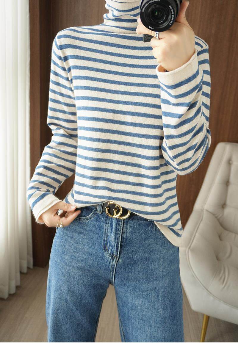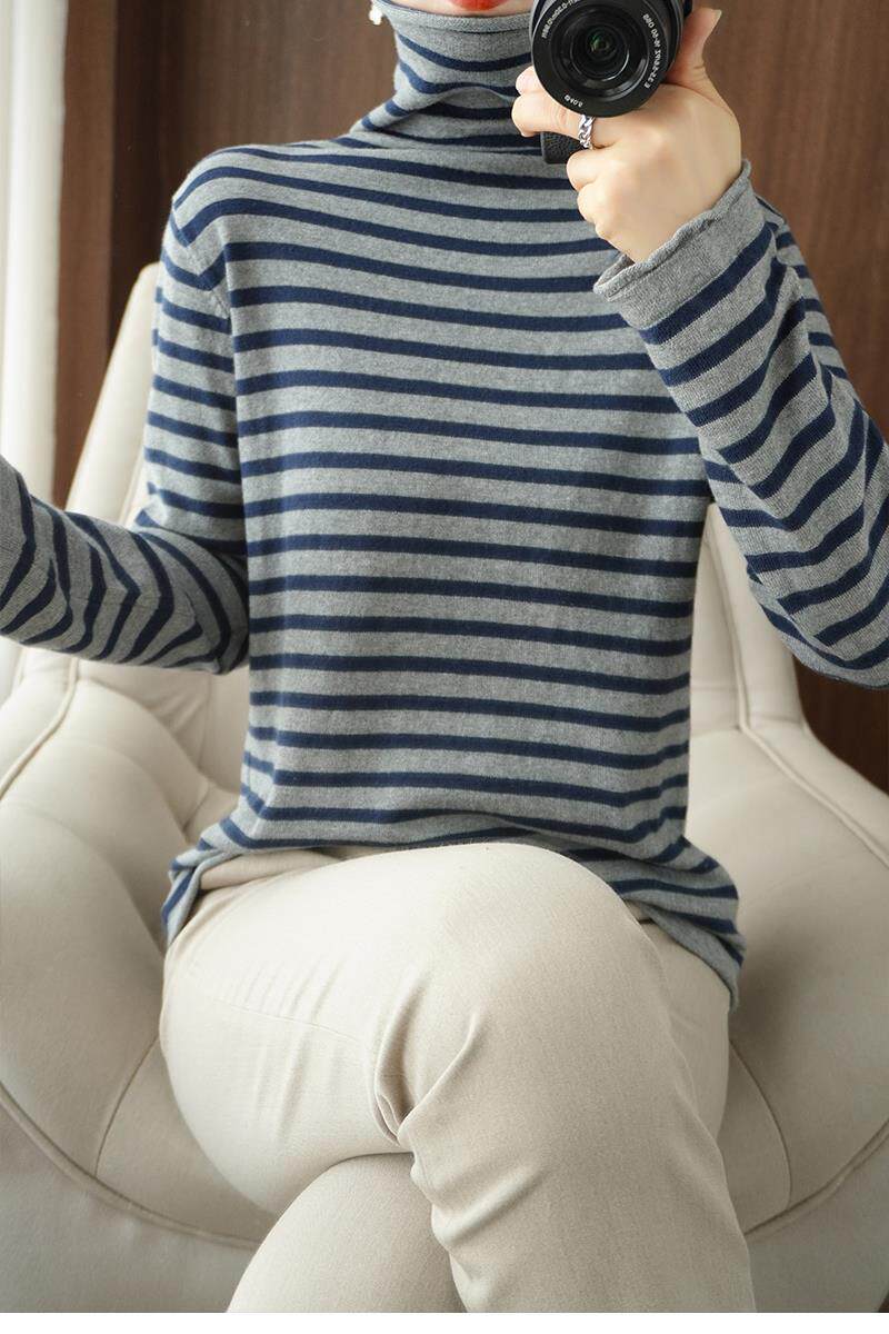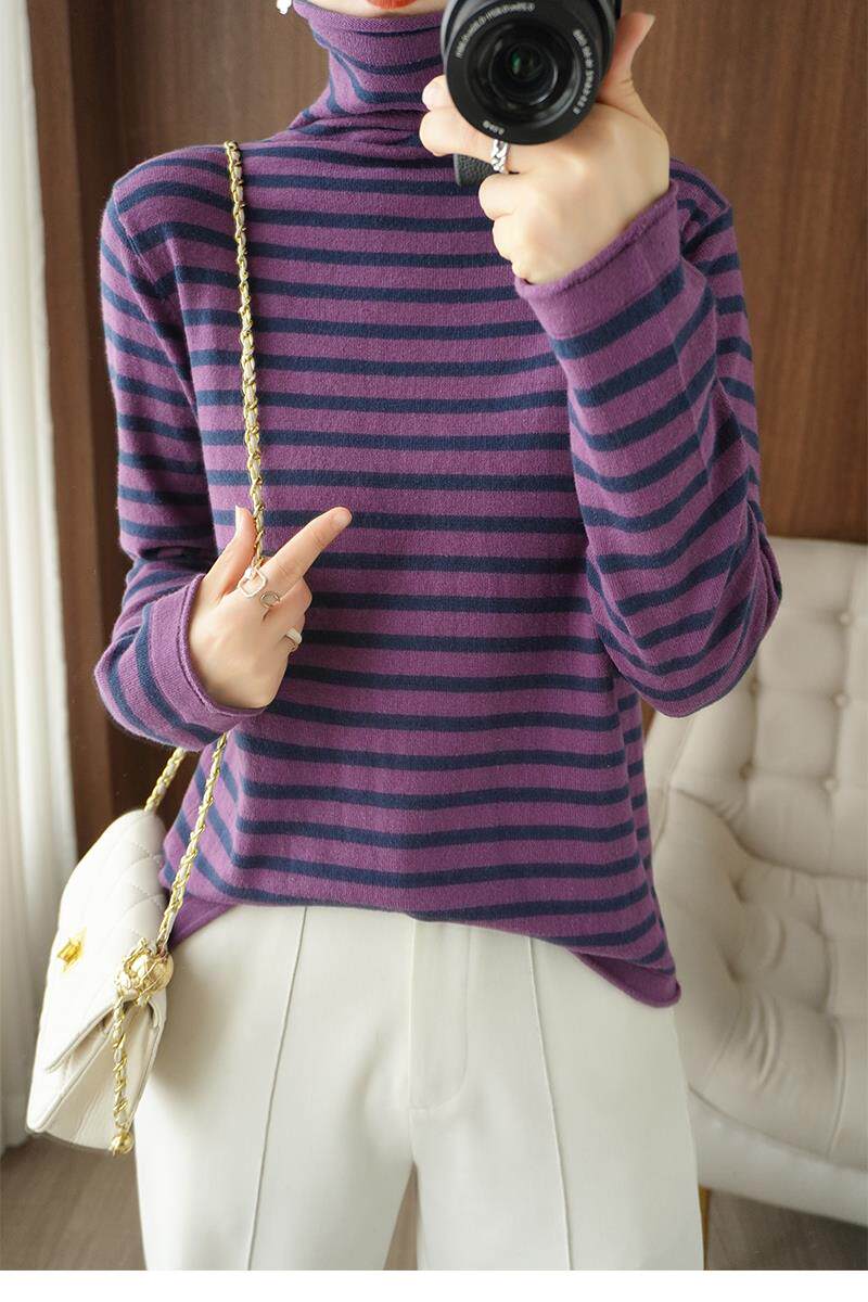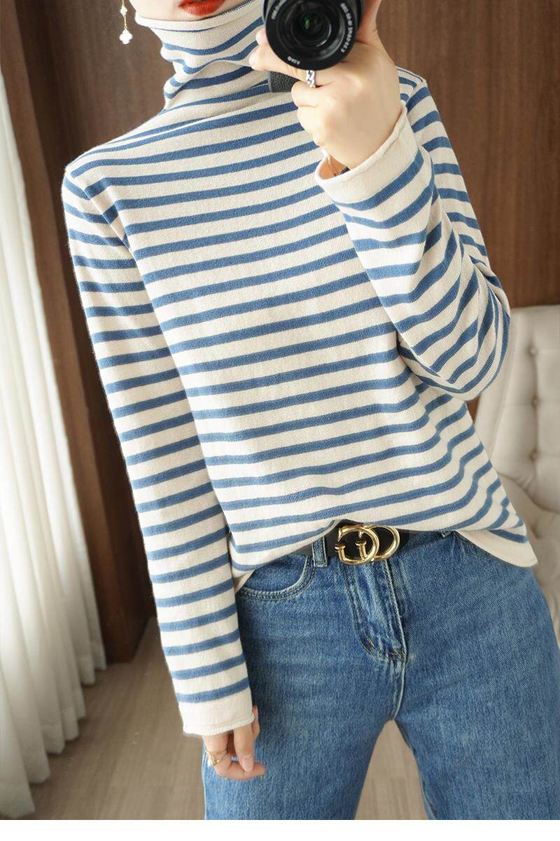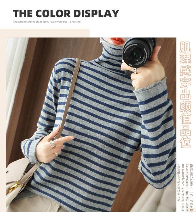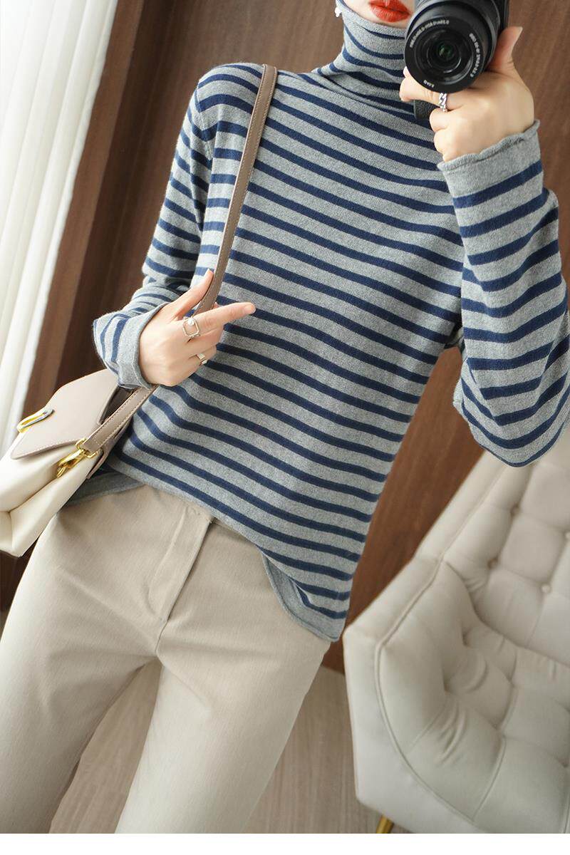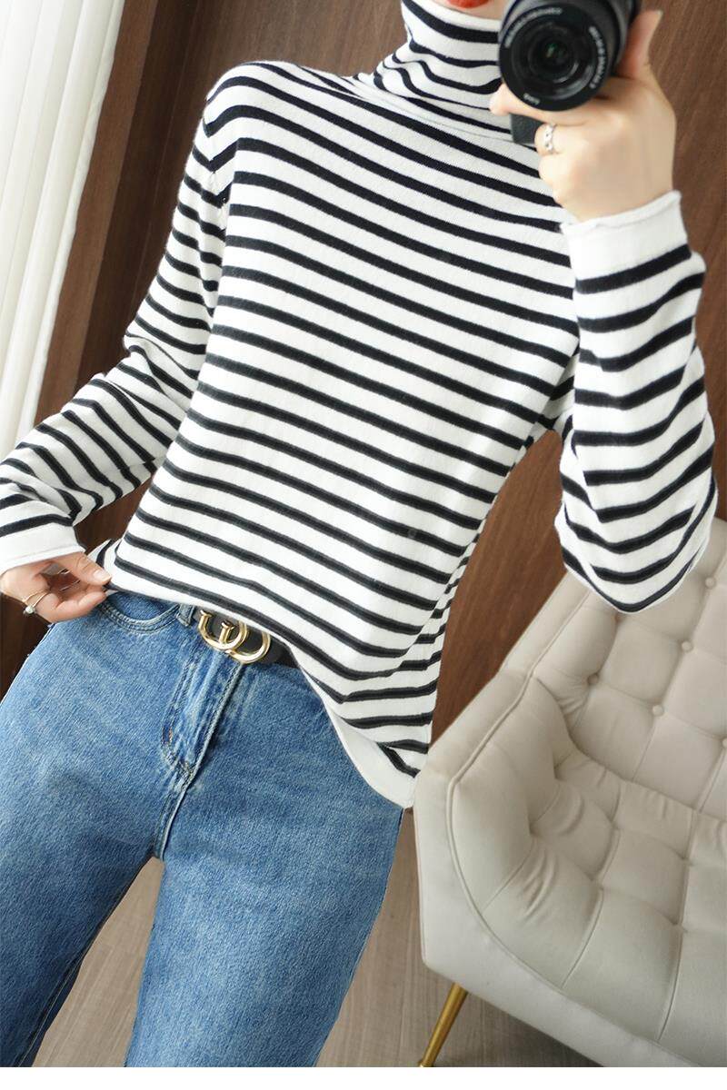 100%纯棉上衣堆堆领套头针织毛衣打底衫条纹卷边新款时尚休闲宽松