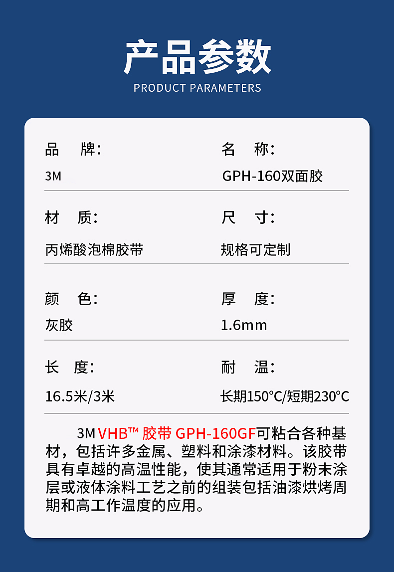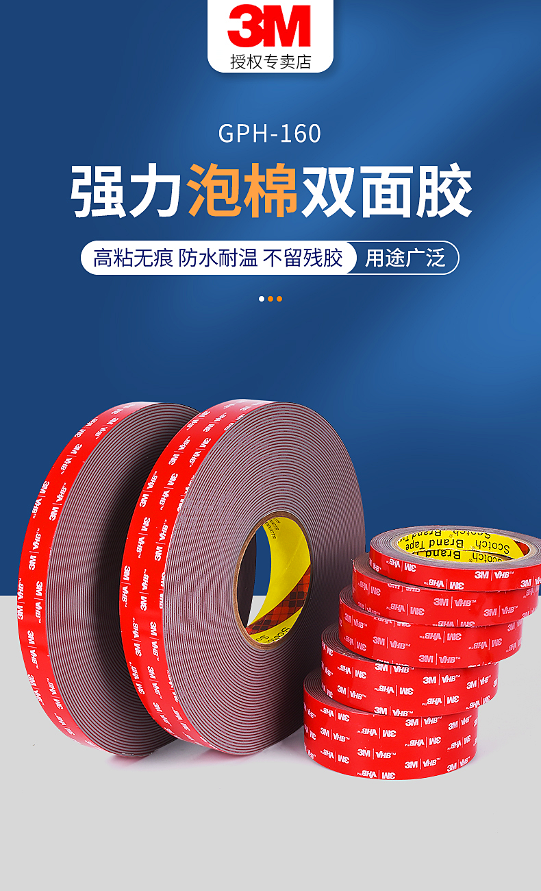 3M GPH160双面胶高粘度车用强力加厚灰色1.6毫米无痕固定厚款胶带