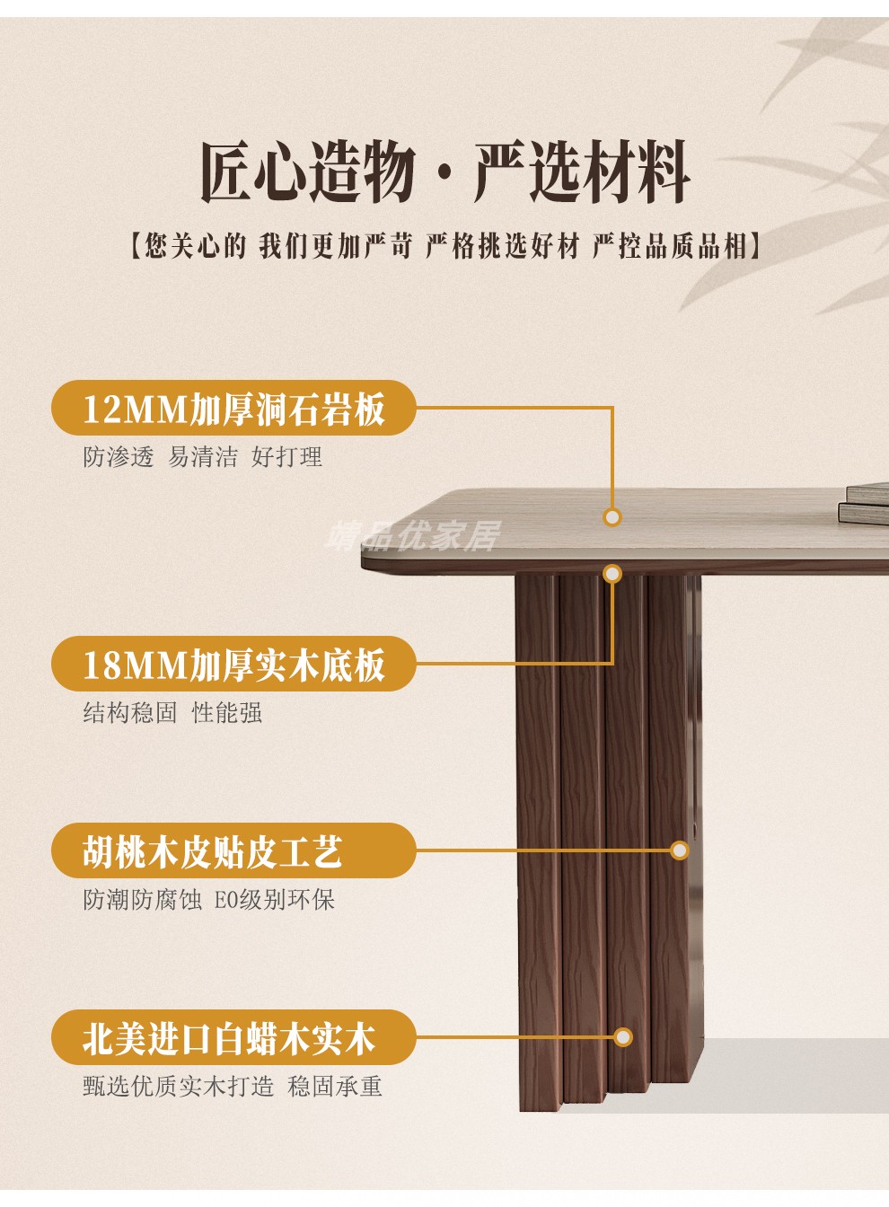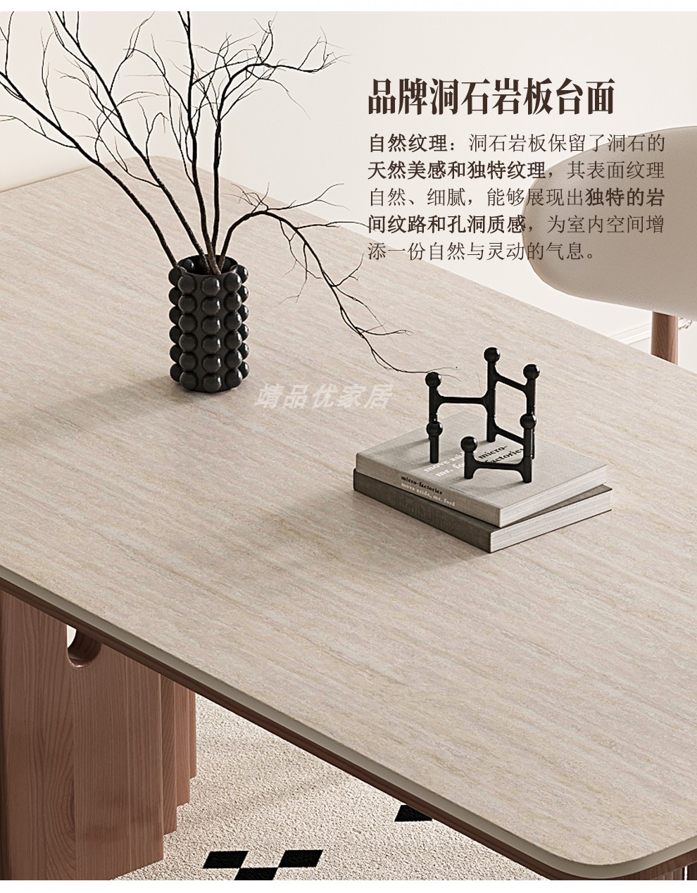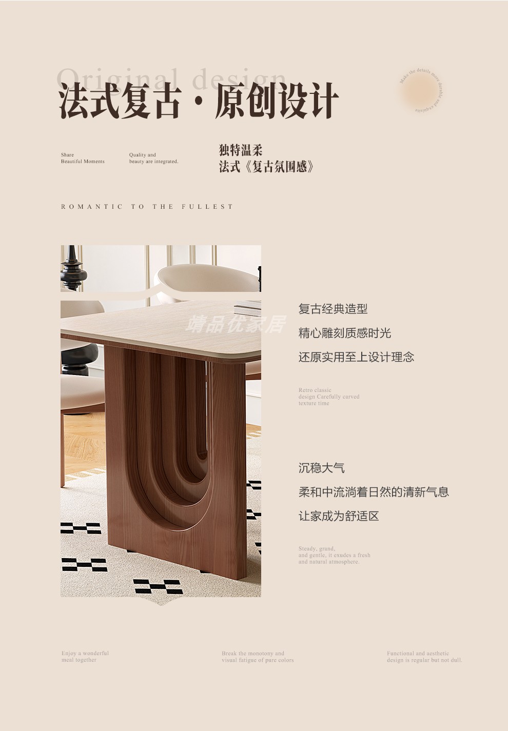 靖品优中古风洞石岩板餐桌法式复古实木饭桌长方形家用胡桃色桌椅