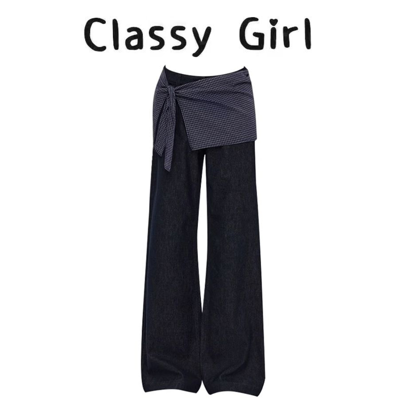 小众设计叠穿真两件直筒牛仔裤女春季方巾格纹绑带宽松拖地长裤子