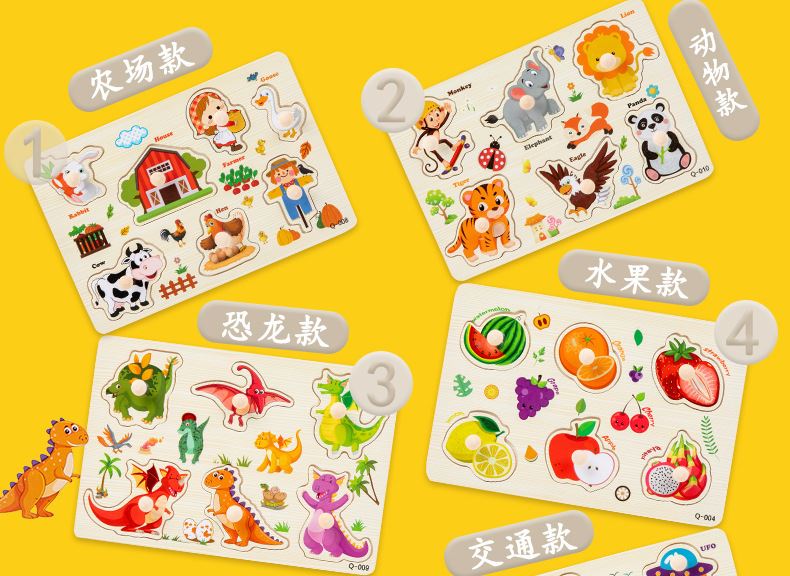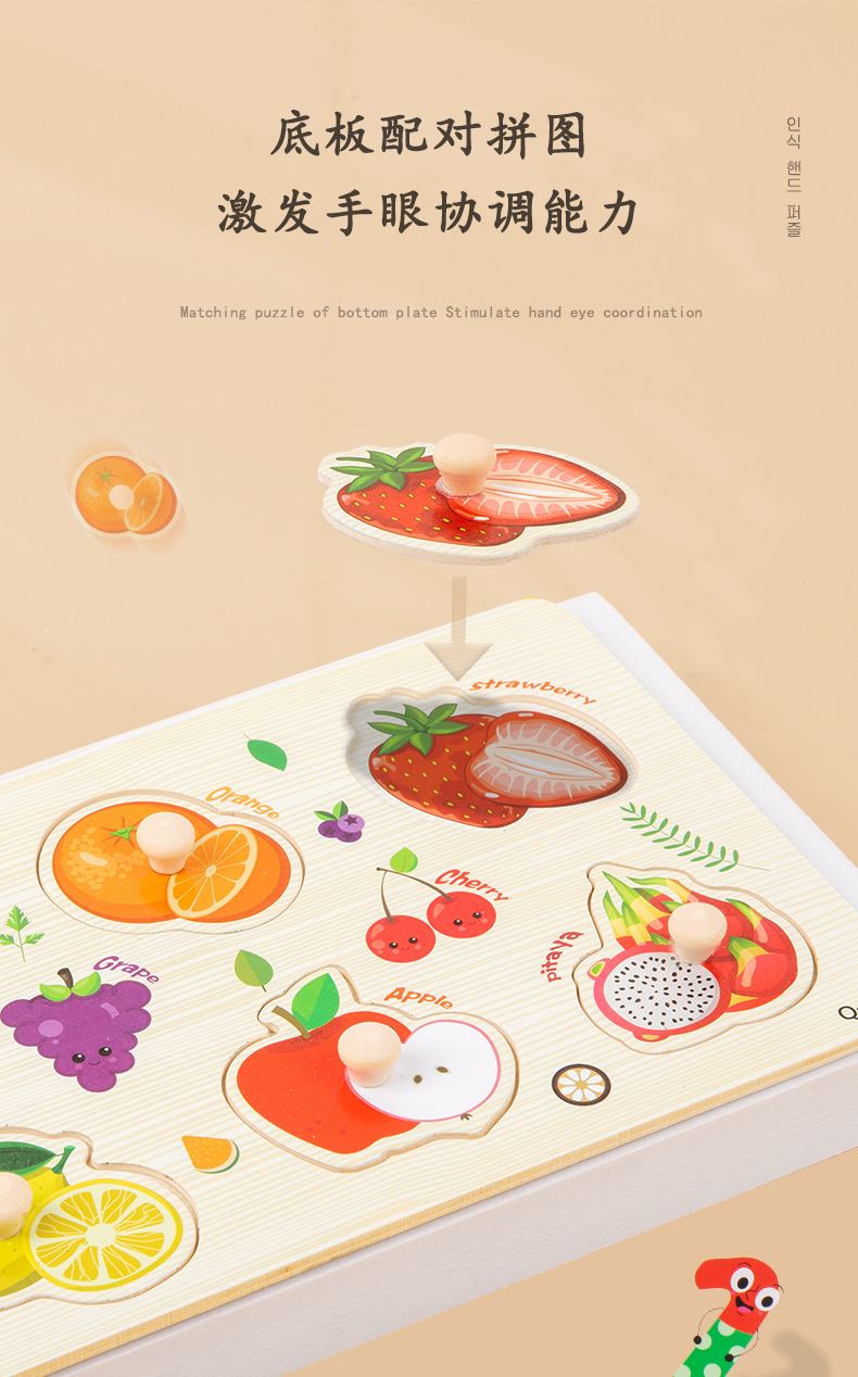 儿童早教益智木制玩具蘑菇钉手抓板拼图水果蔬菜昆虫认知拼板