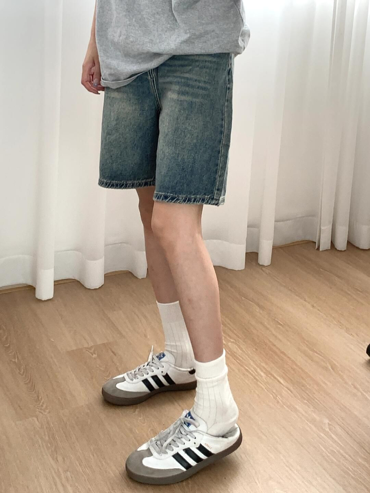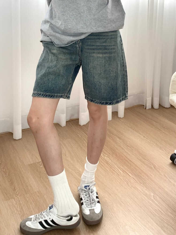 大码美式高街复古牛仔五分裤男女夏季新款直筒宽松做旧休闲短裤潮