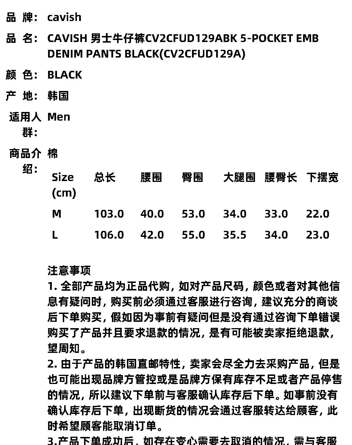 韩国直邮CAVISH 男士牛仔裤CV2CFUD129ABK 5-POCKET EMB DENIM PA