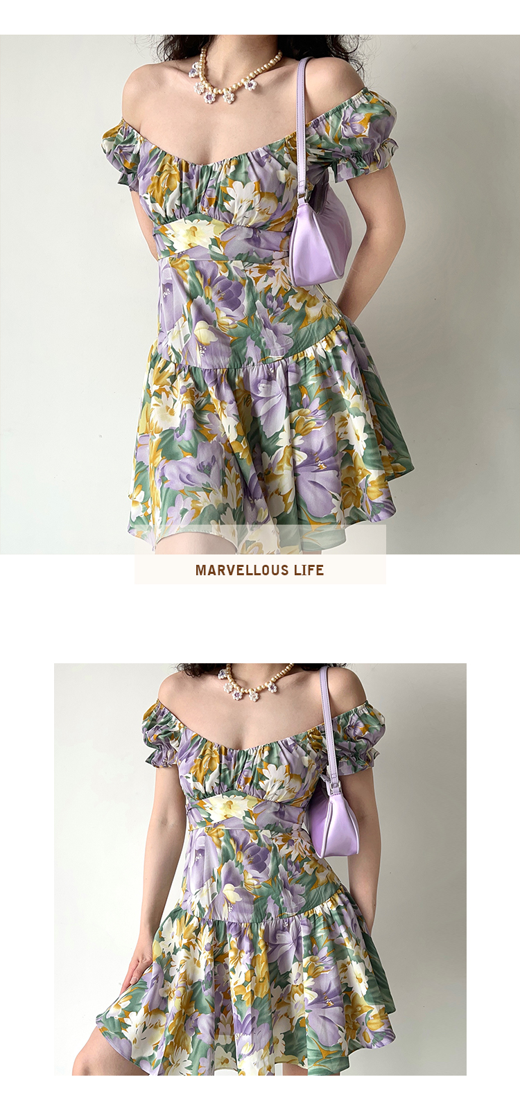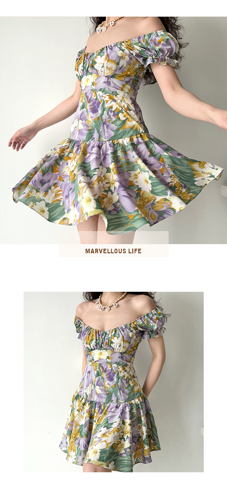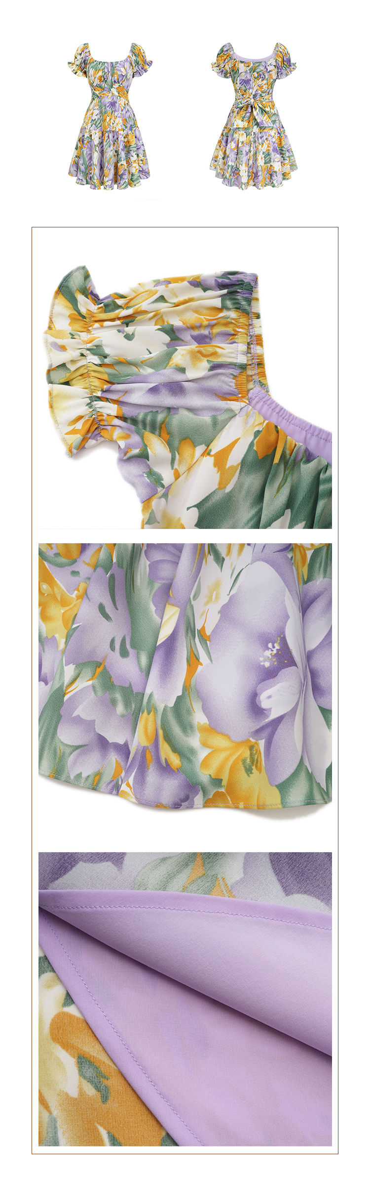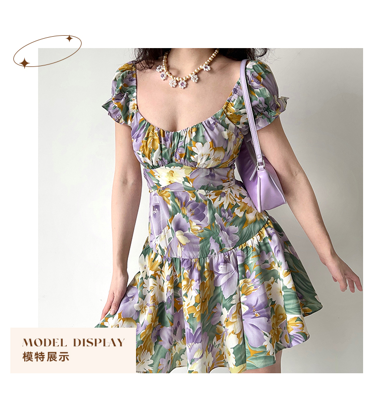 Go Girl Go自制法式复古油画花朵泡泡袖短袖连衣裙女后背绑带短裙