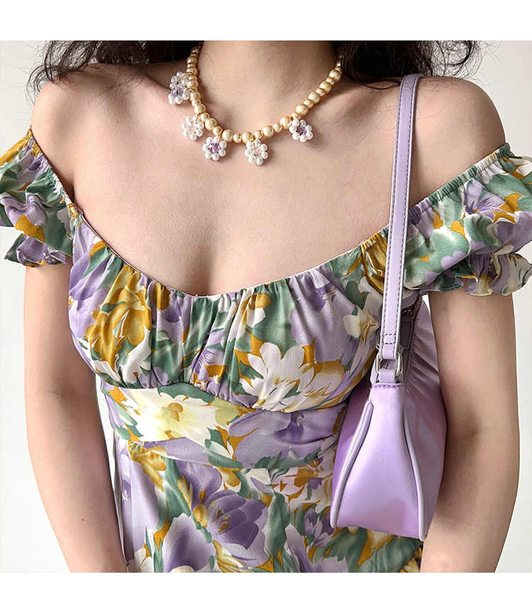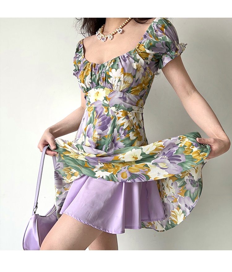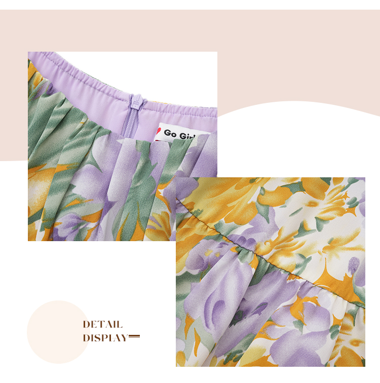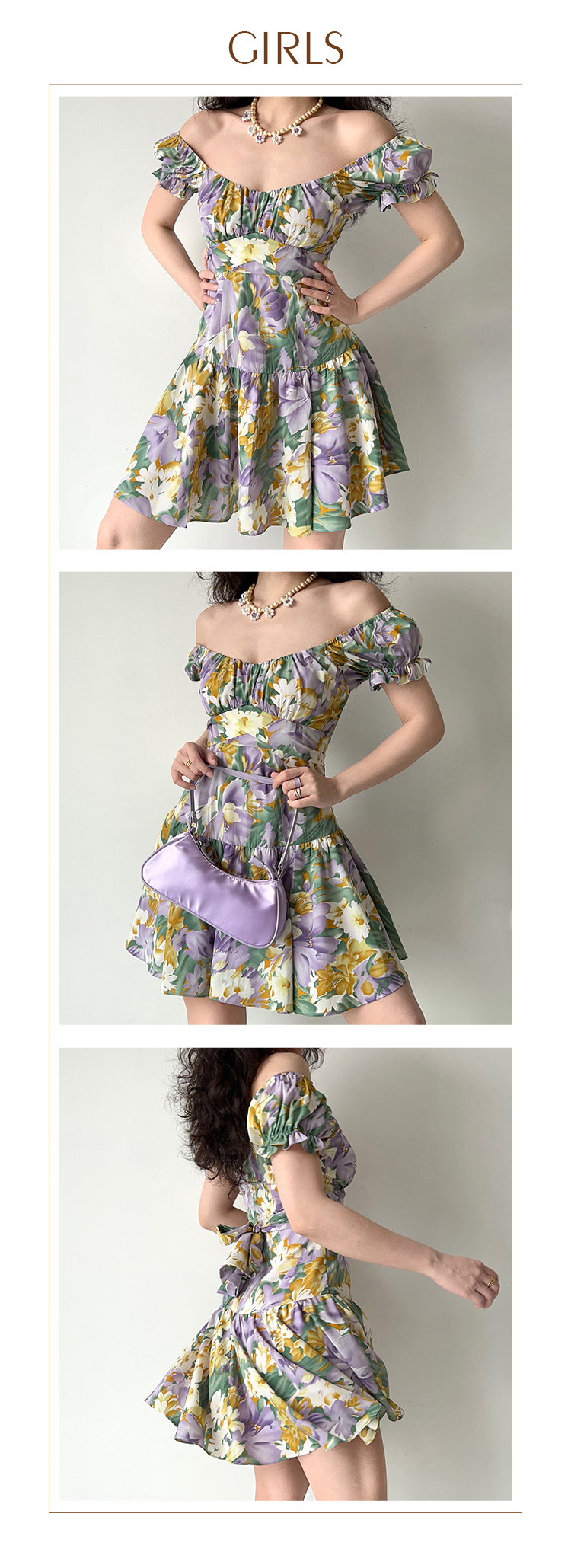 Go Girl Go自制法式复古油画花朵泡泡袖短袖连衣裙女后背绑带短裙
