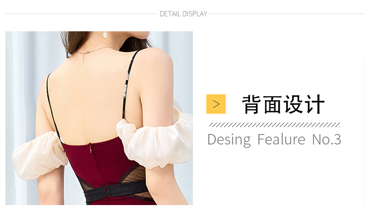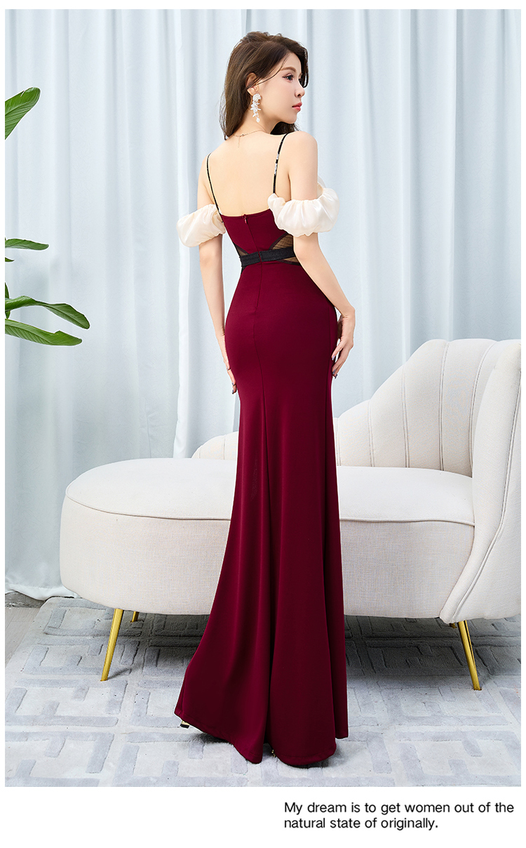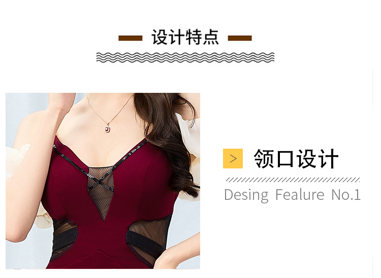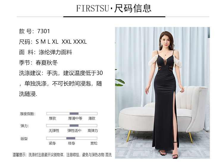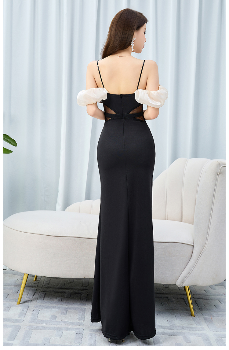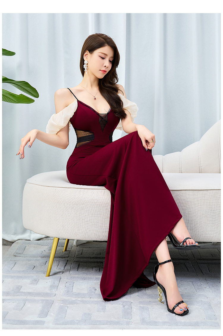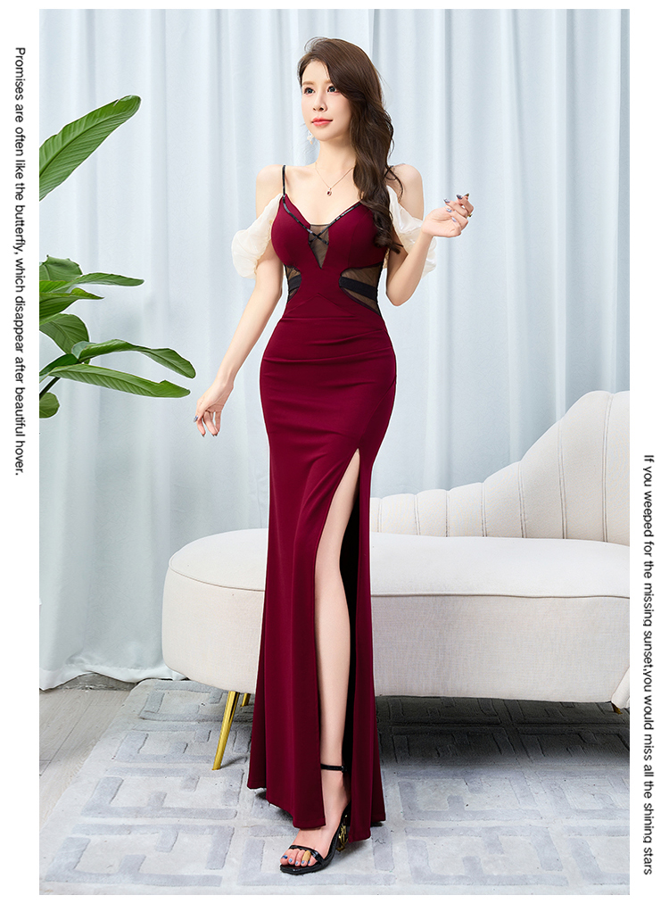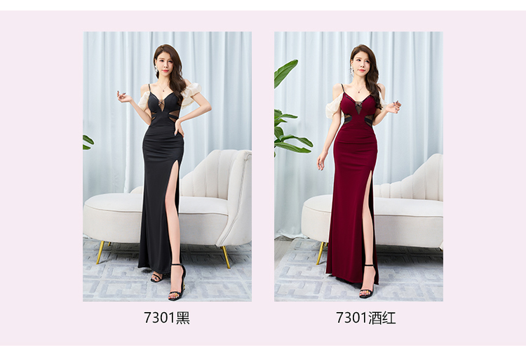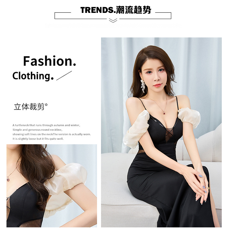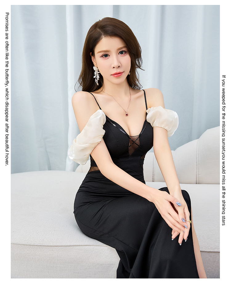 性感吊带晚礼服包臀长款开叉低胸气质拼色连衣裙桑拿技师沐足工衣