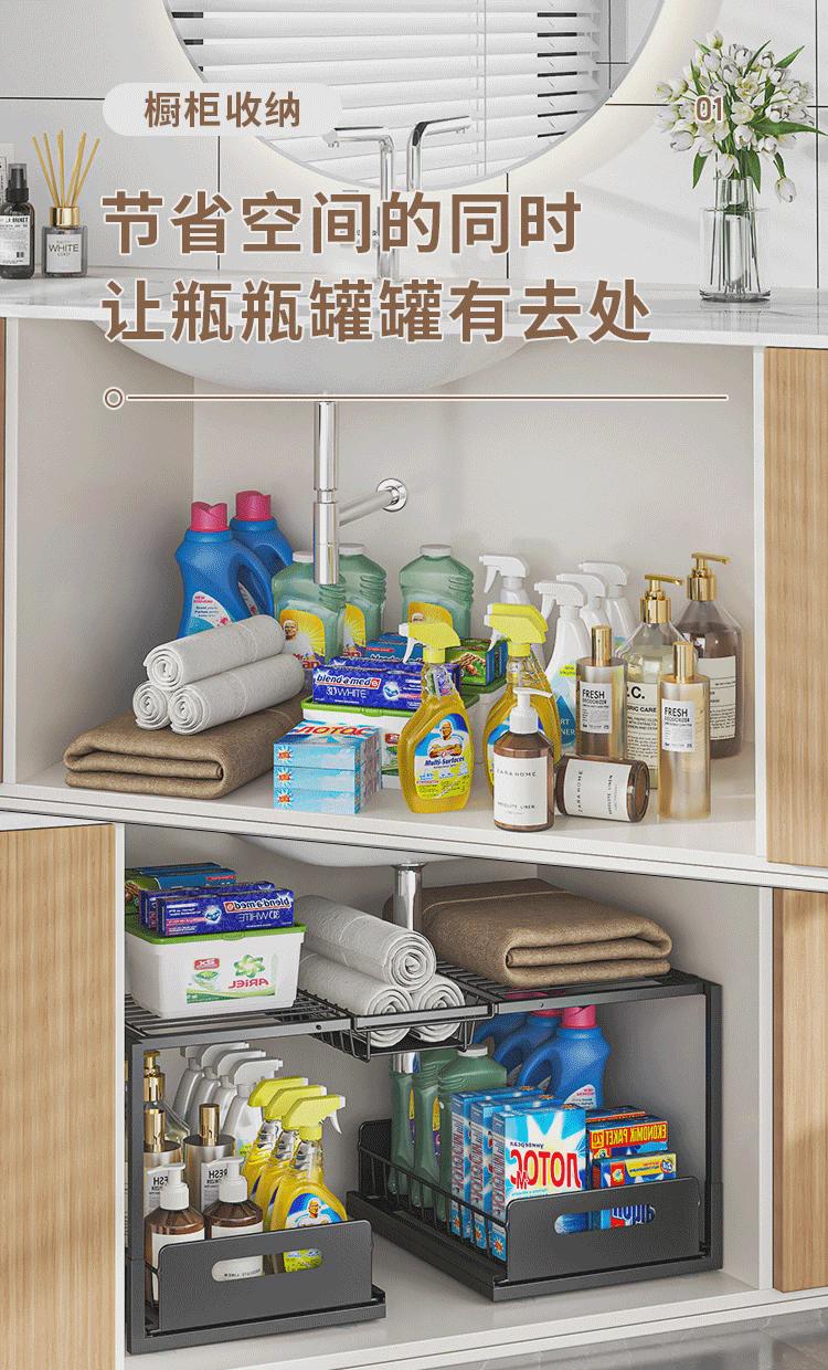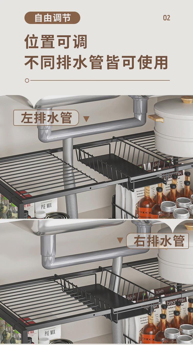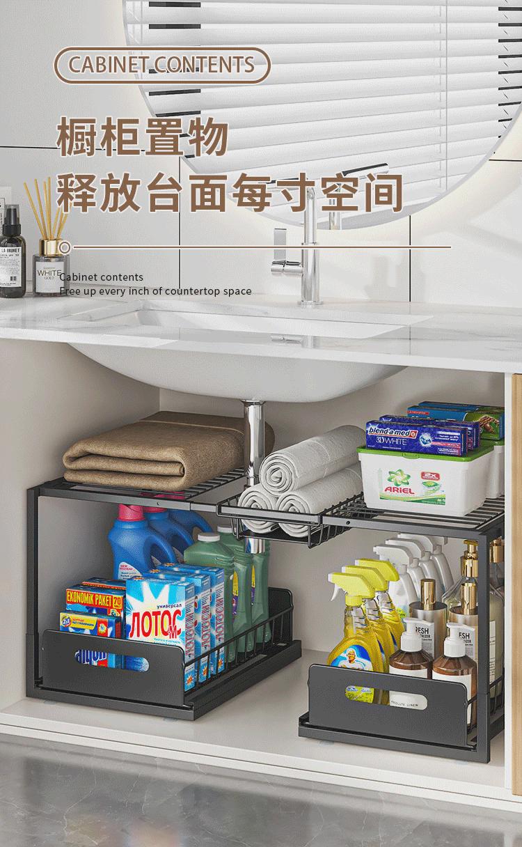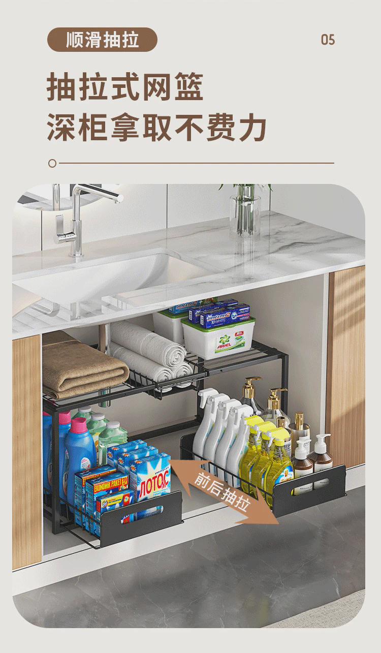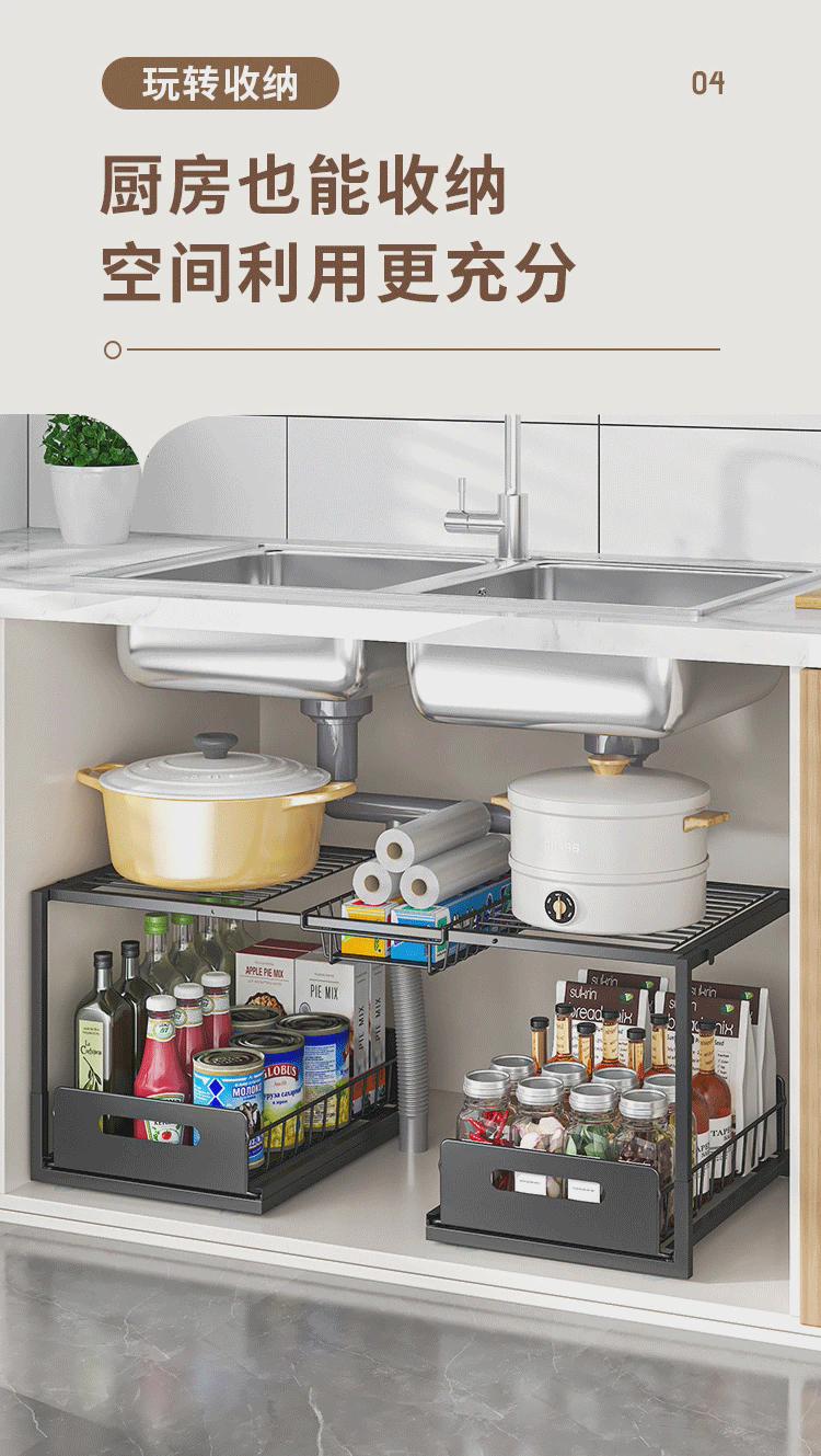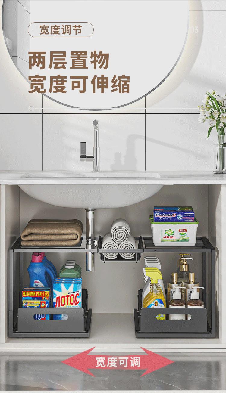 下水槽置物架双层抽拉式可伸缩多功能厨房锅具收纳架浴室橱柜分层
