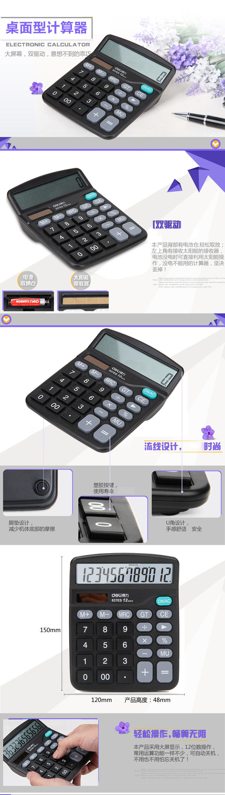 得力计算器837ES经济型太阳能双电源计算机办公837y语音款大屏幕财务用记算机算器便携随身小型计算器