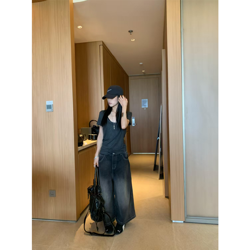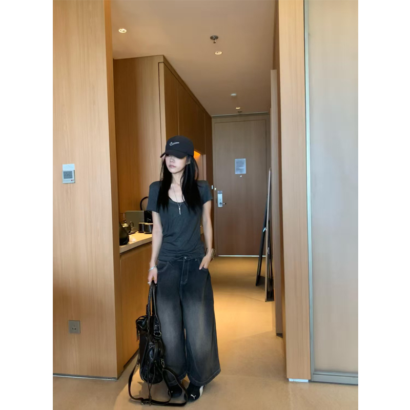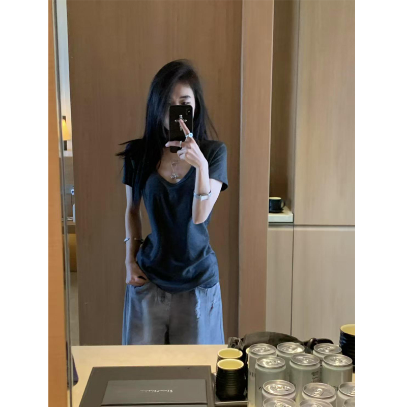 设计感小众正肩U领纯棉短袖T恤女夏美式复古辣妹短款修身显瘦上衣