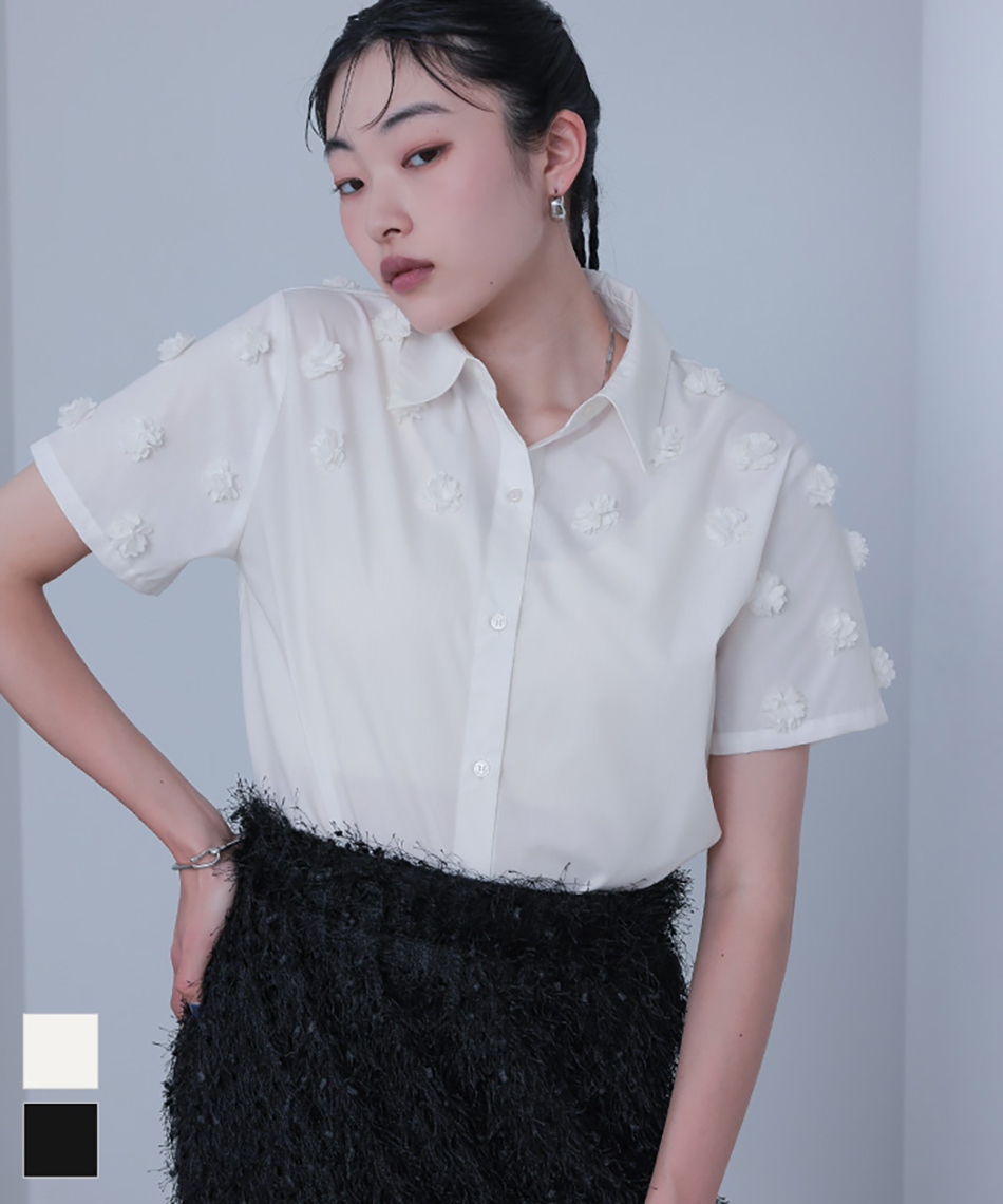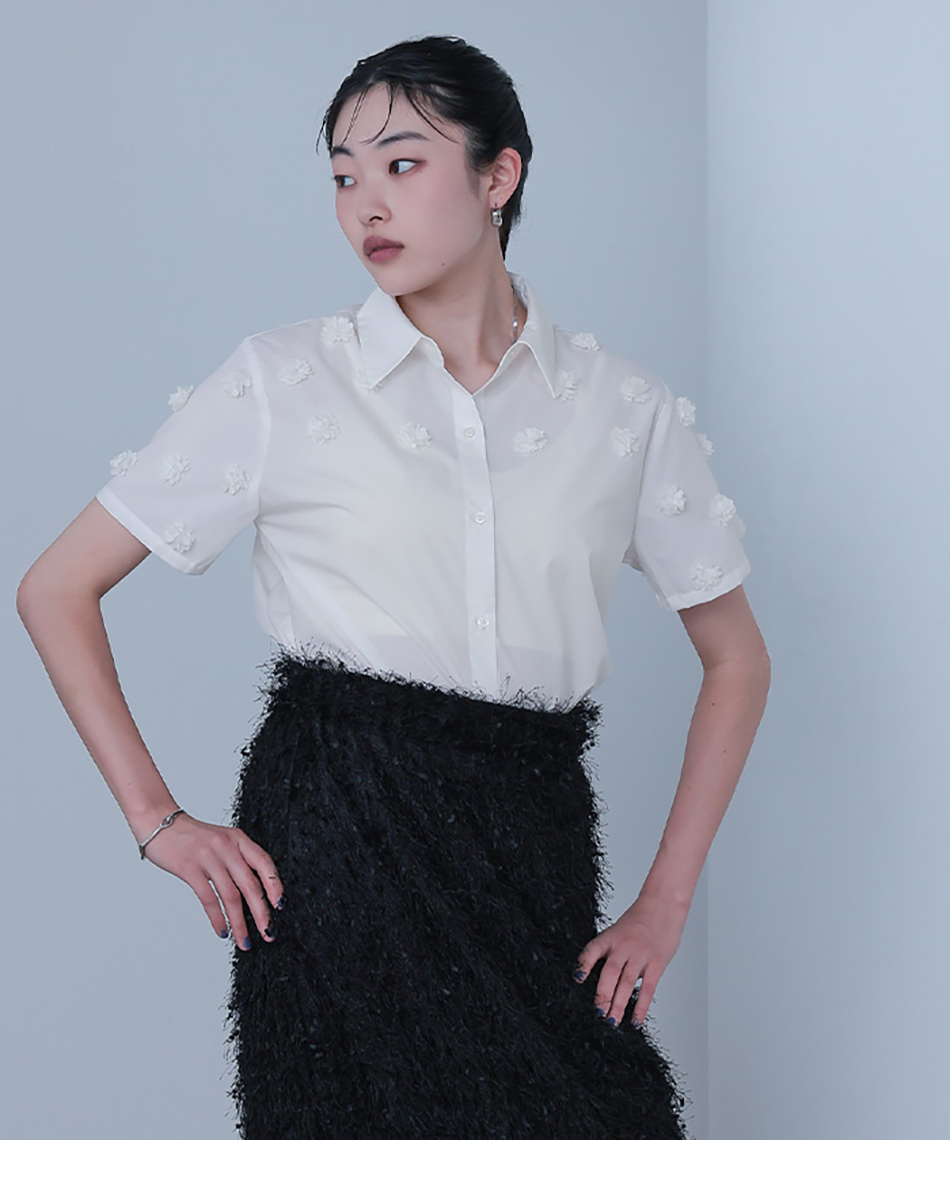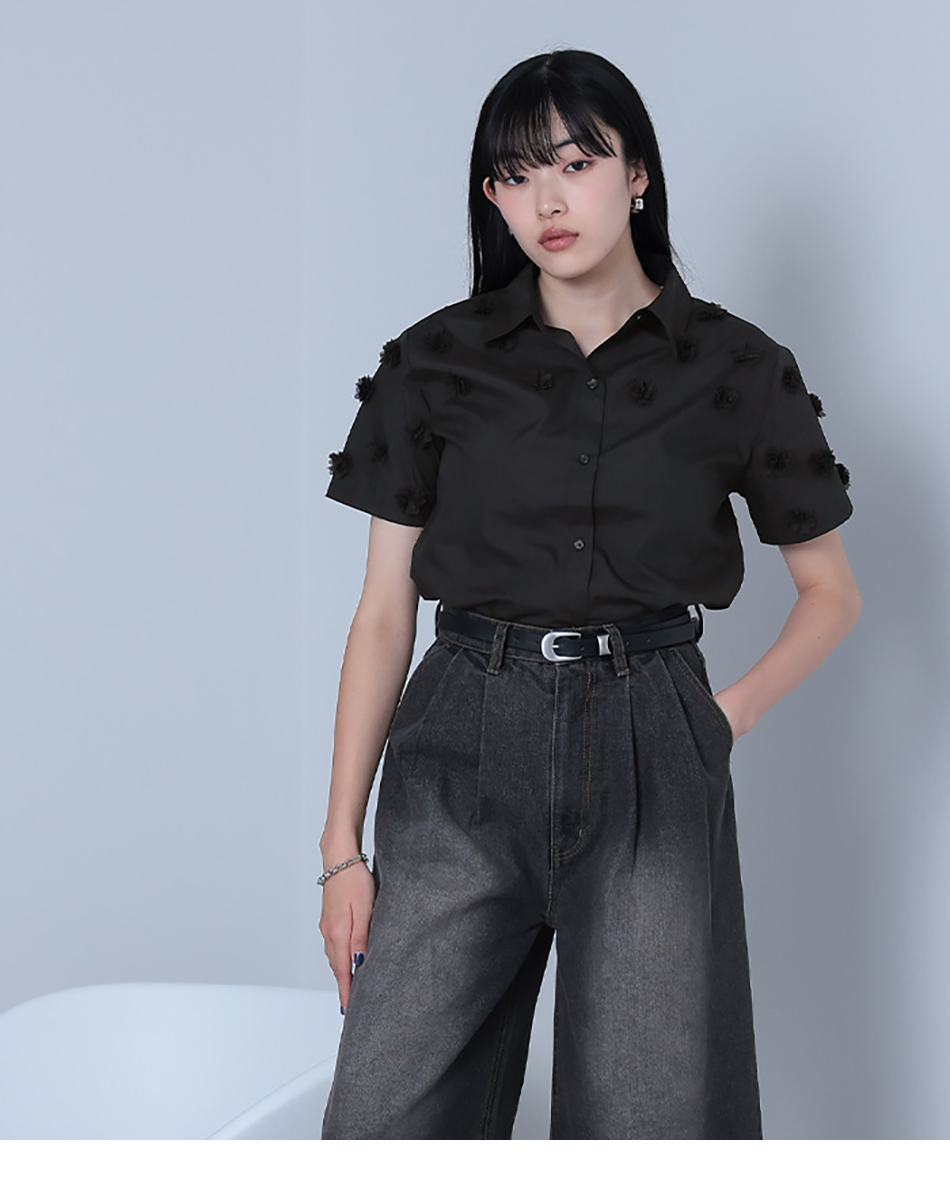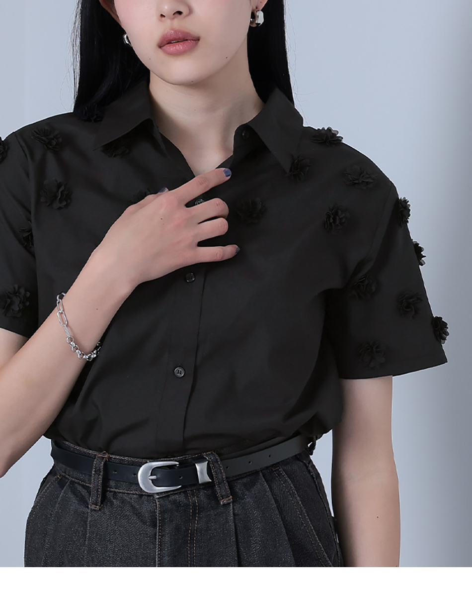 WICK BUEN 2025夏季新款立体花朵短袖衬衫女宽松显瘦百搭上衣